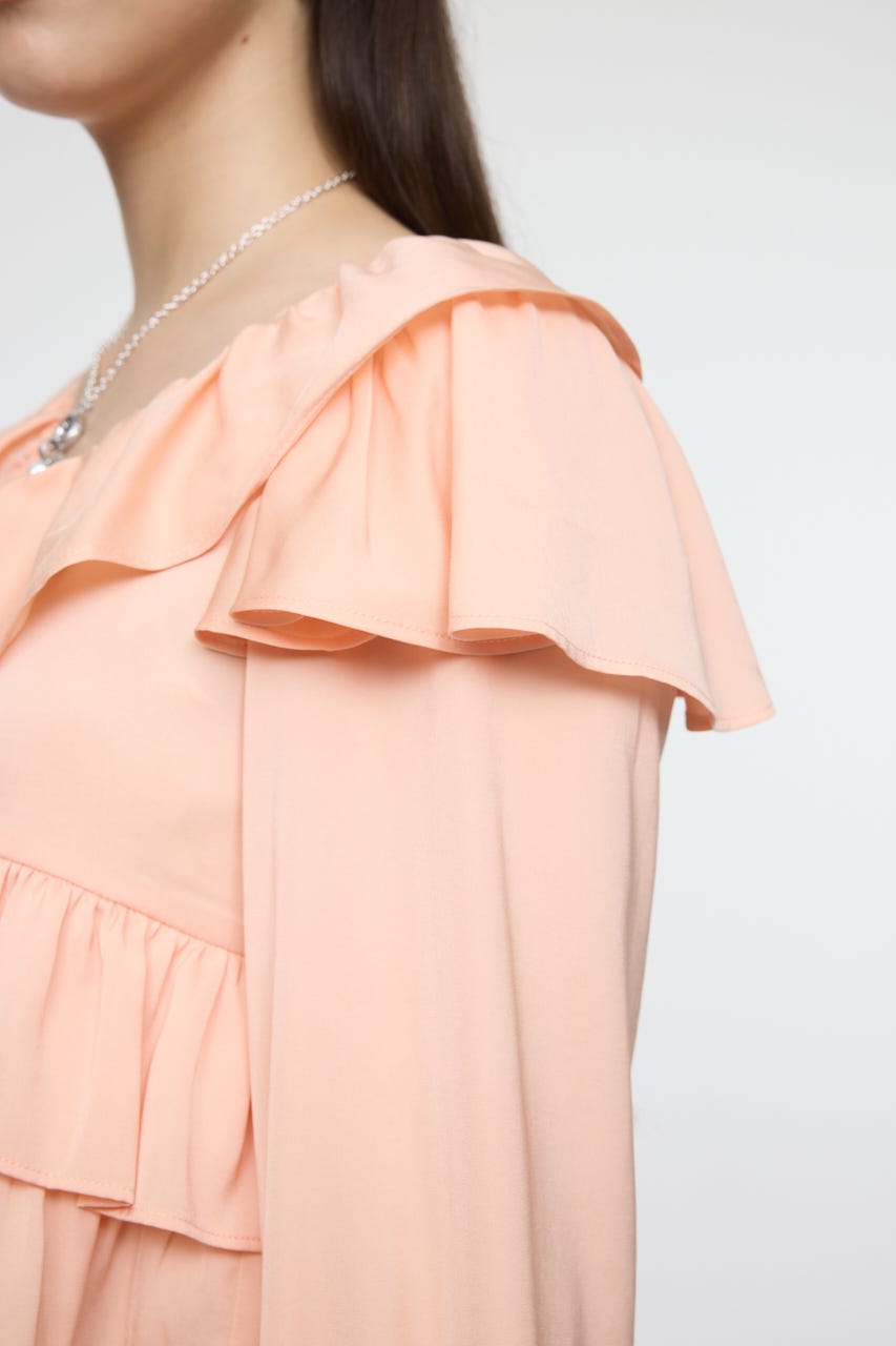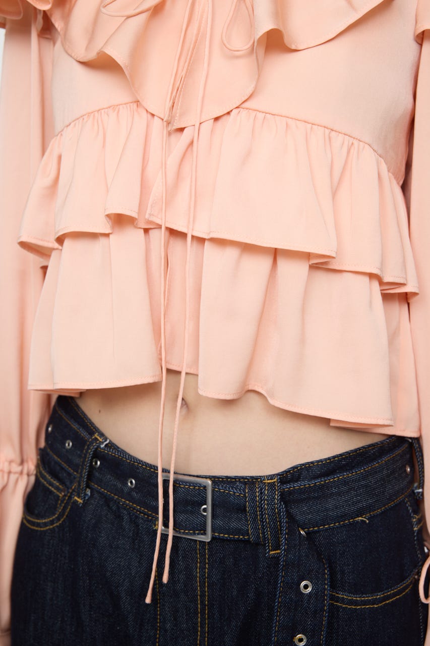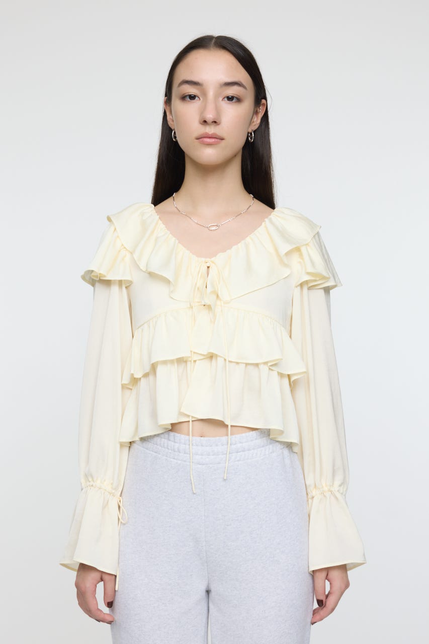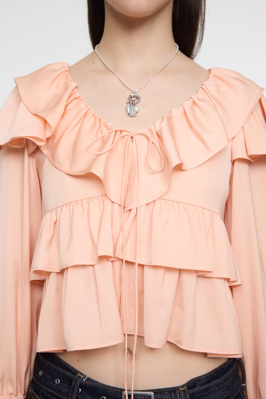 身頃や袖にフリルを取り入れた華やかさのある1枚。