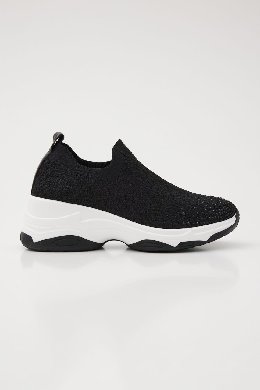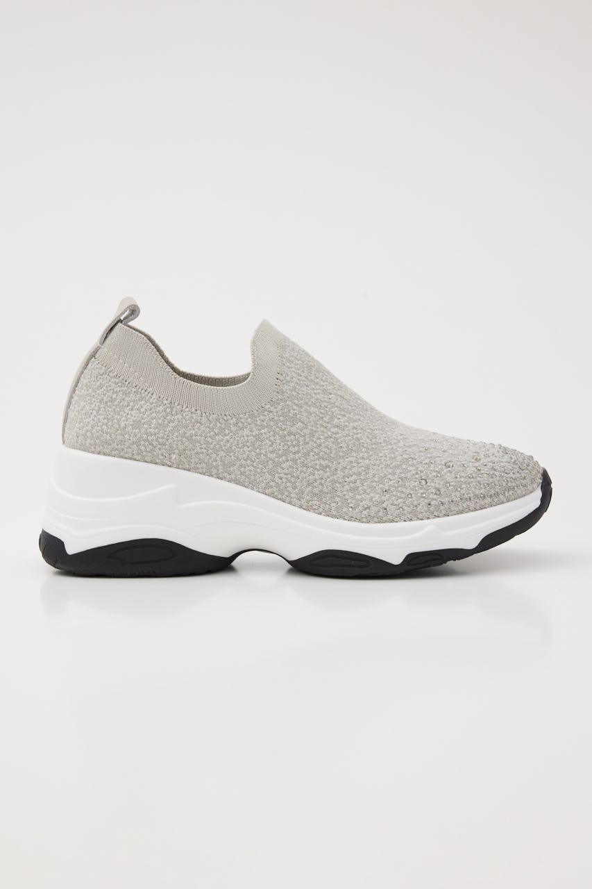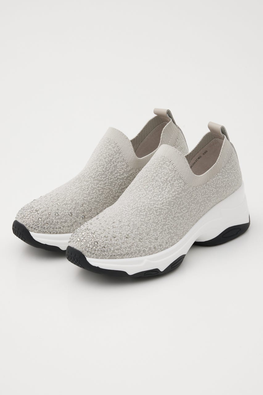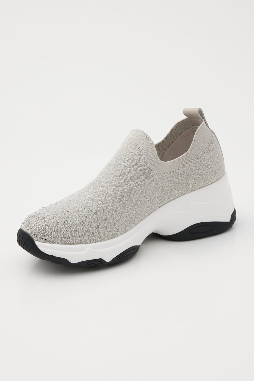 表情感と凹凸感のある立体的なMIXニット地に、つま先部分にはグラデーション風に大小のオーロラストーンを装飾。フィット感のあるハイバンプデザイン&安定感ある程よい高さのスニーカーソールは、ボリューム過ぎないのに脚長効果も期待大。シーズンレスでデイリーユースに大活躍してくれます。