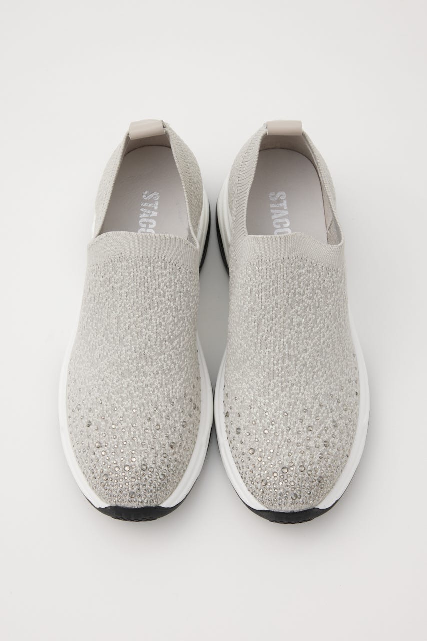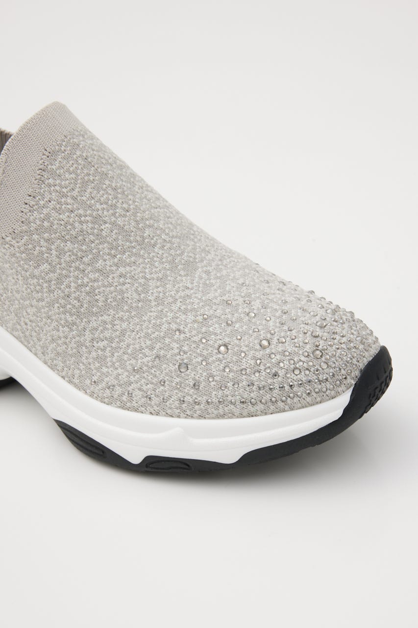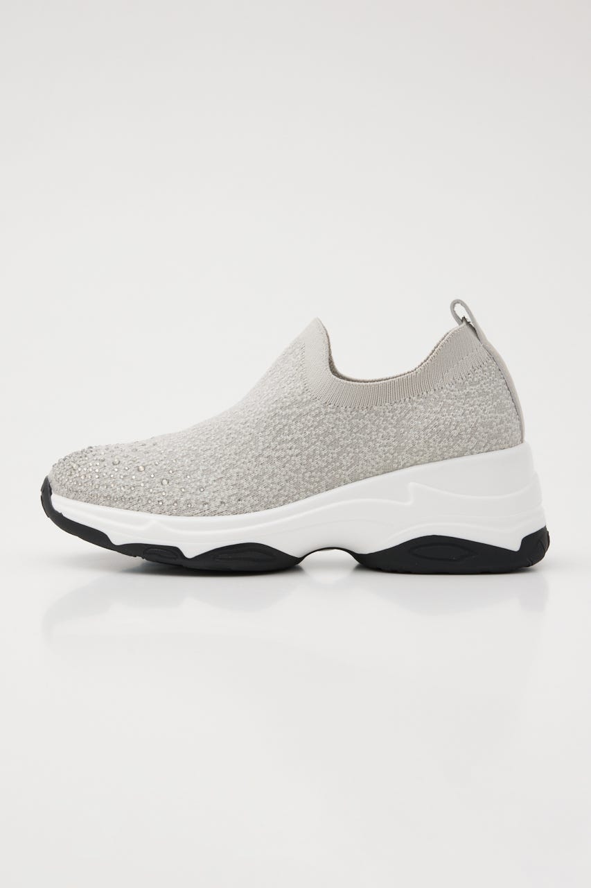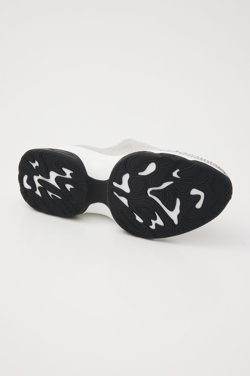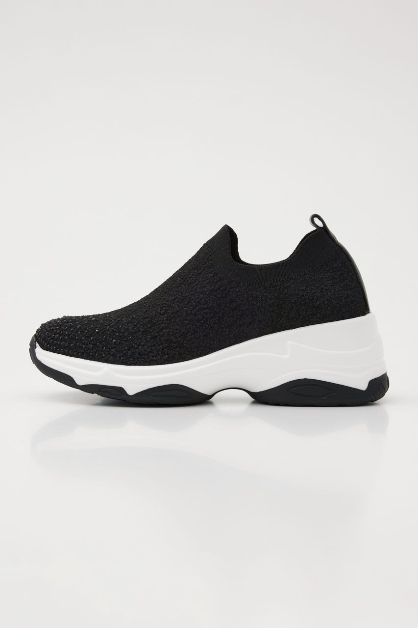 表情感と凹凸感のある立体的なMIXニット地に、つま先部分にはグラデーション風に大小のオーロラストーンを装飾。フィット感のあるハイバンプデザイン&安定感ある程よい高さのスニーカーソールは、ボリューム過ぎないのに脚長効果も期待大。シーズンレスでデイリーユースに大活躍してくれます。