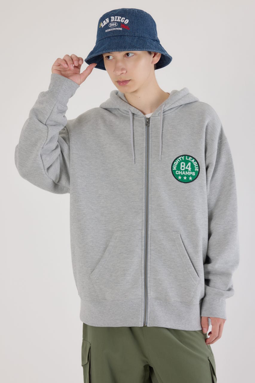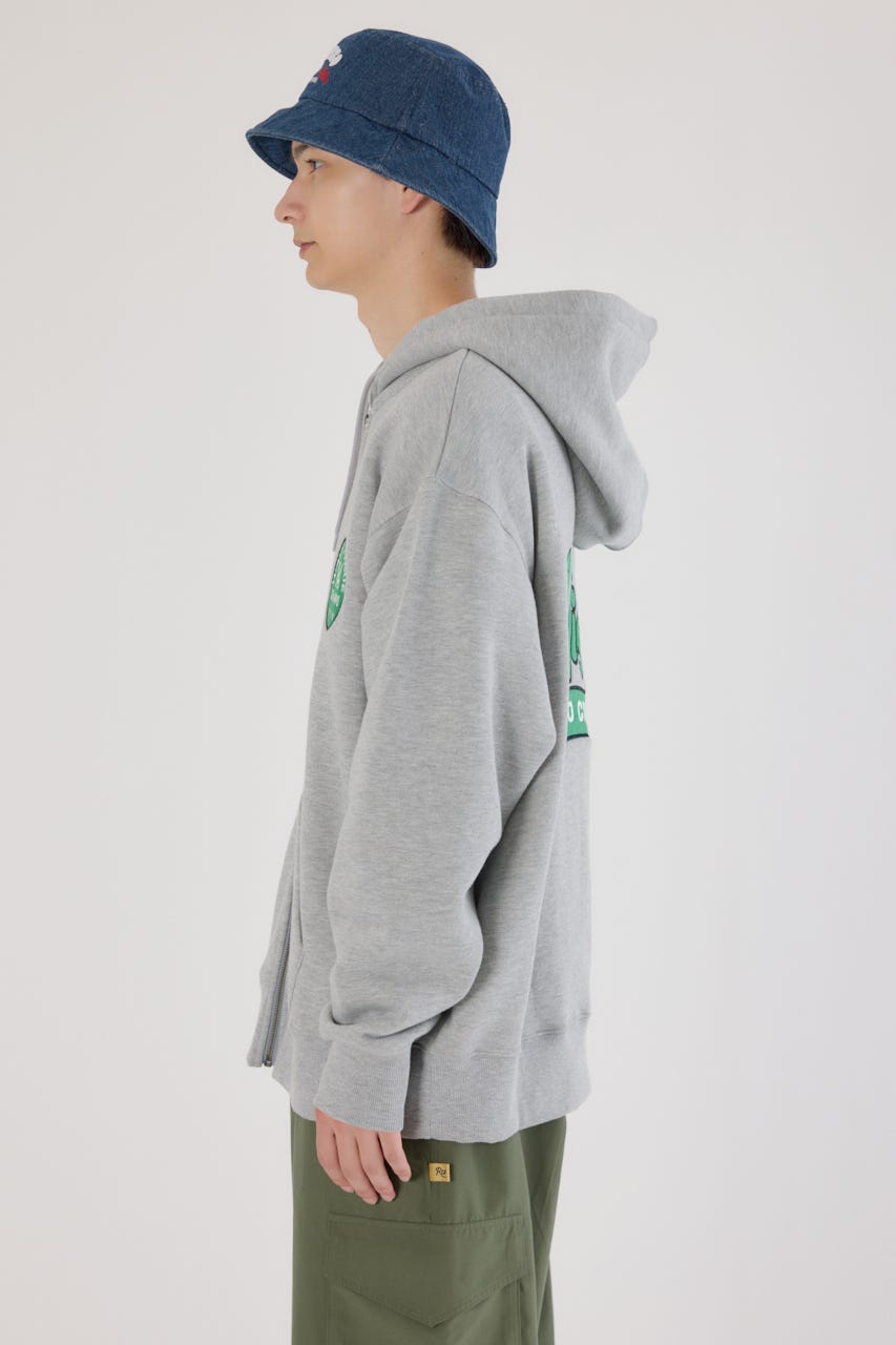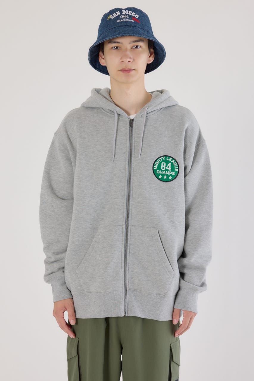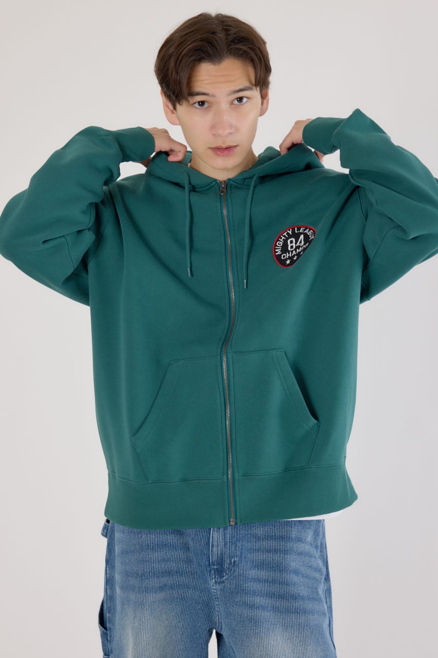 フェルト刺繍を施したバックスタイルが重厚感のあるジップアップパーカー。