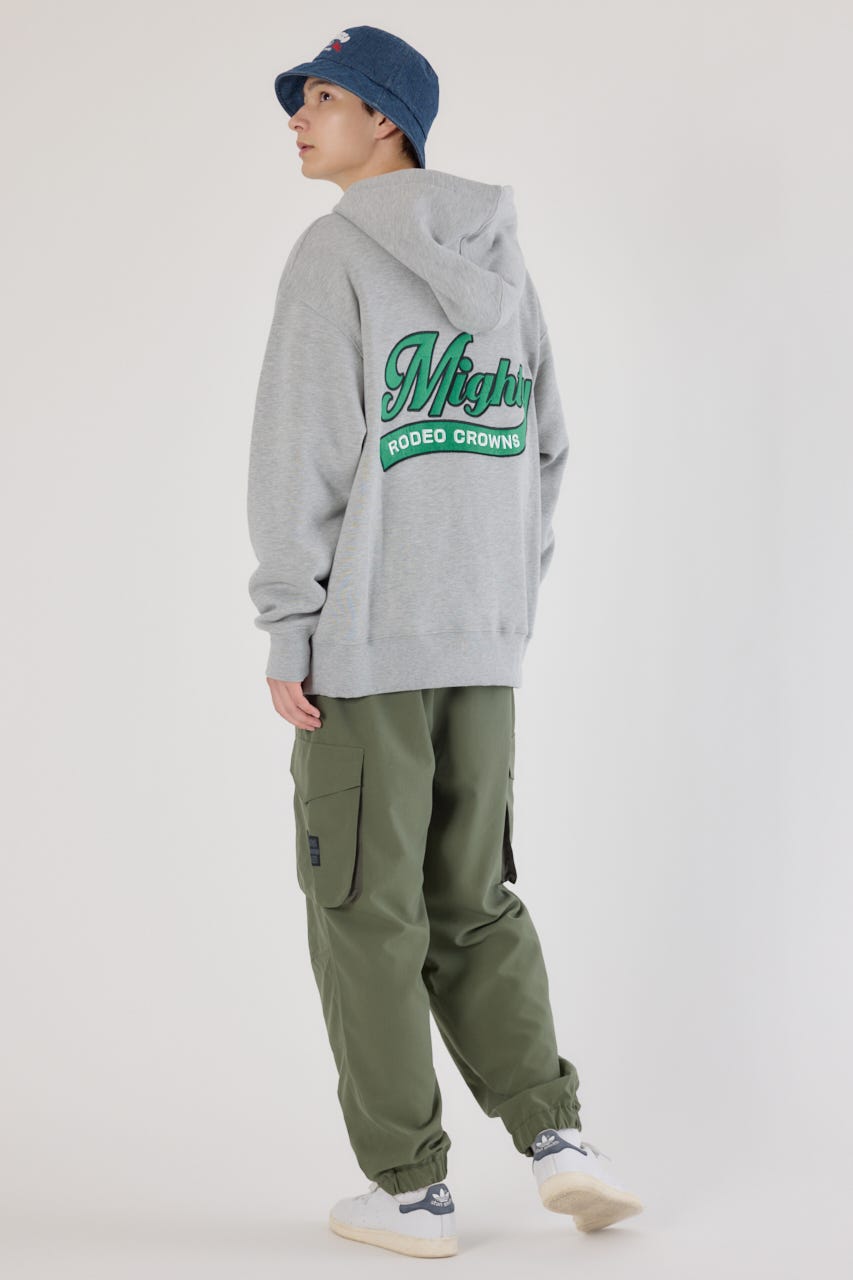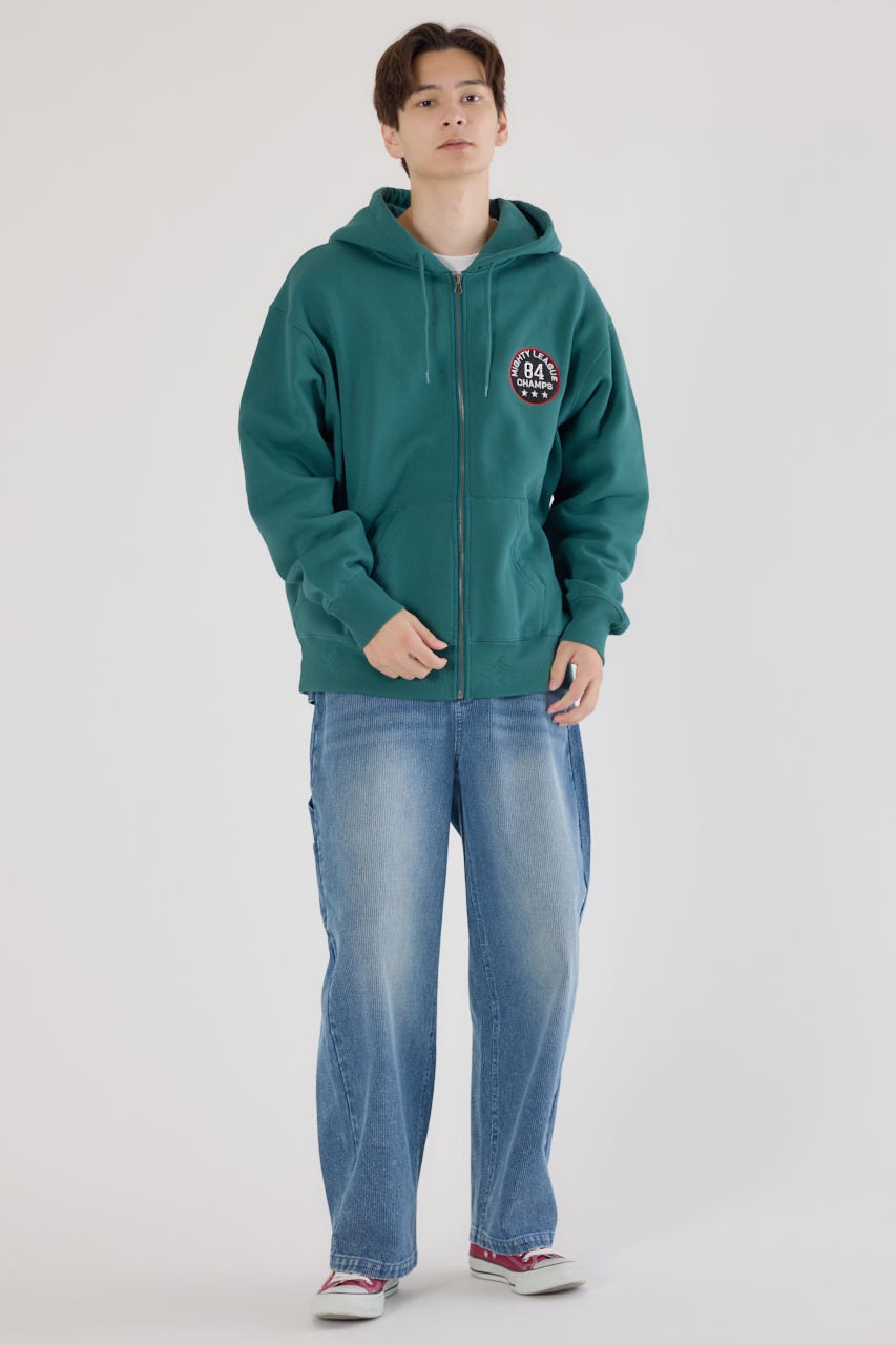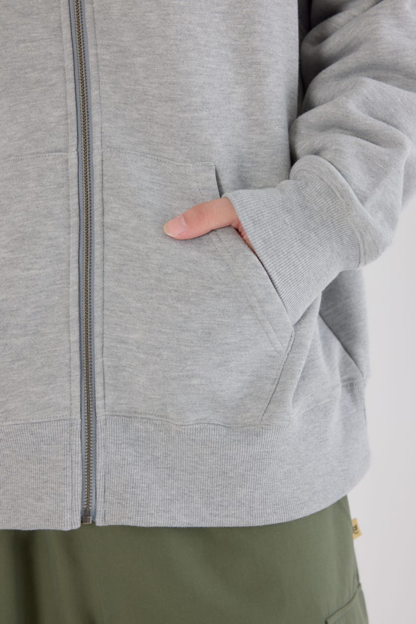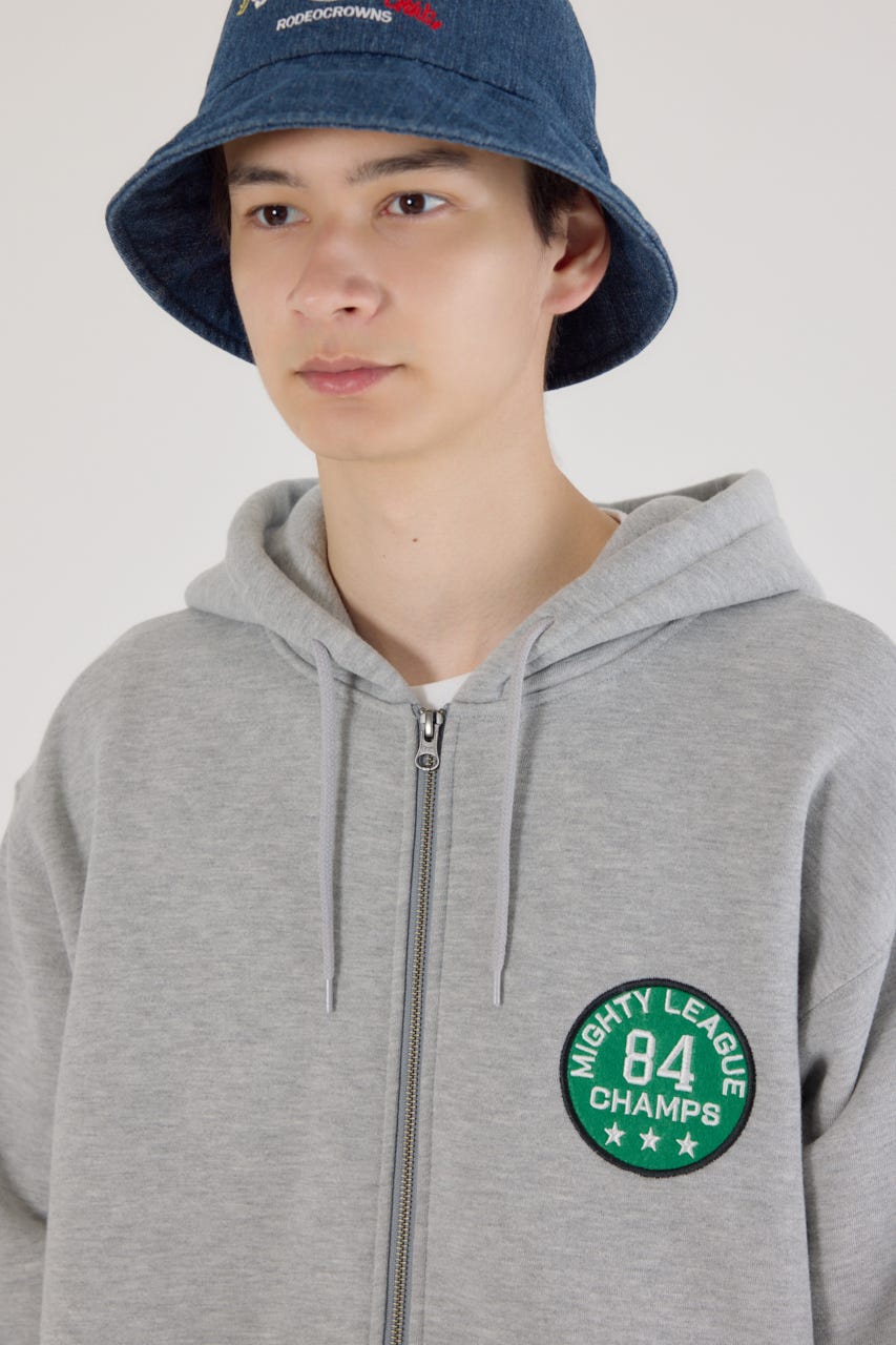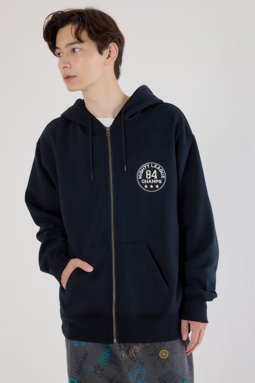 フェルト刺繍を施したバックスタイルが重厚感のあるジップアップパーカー。