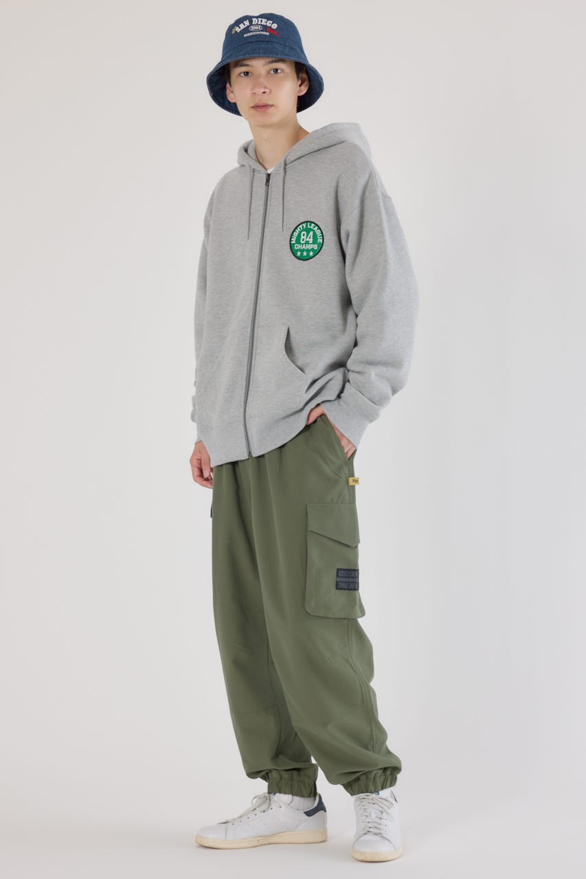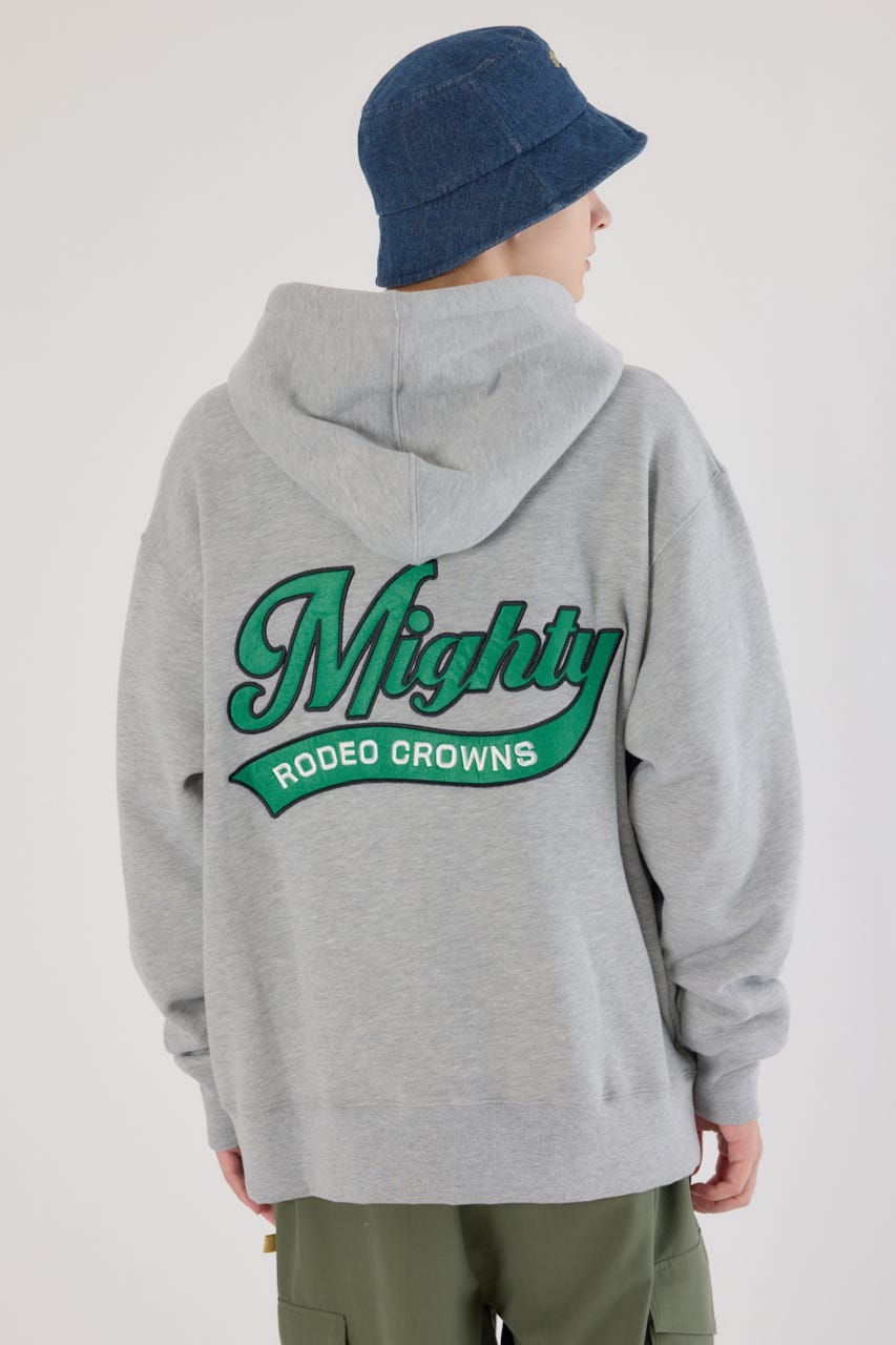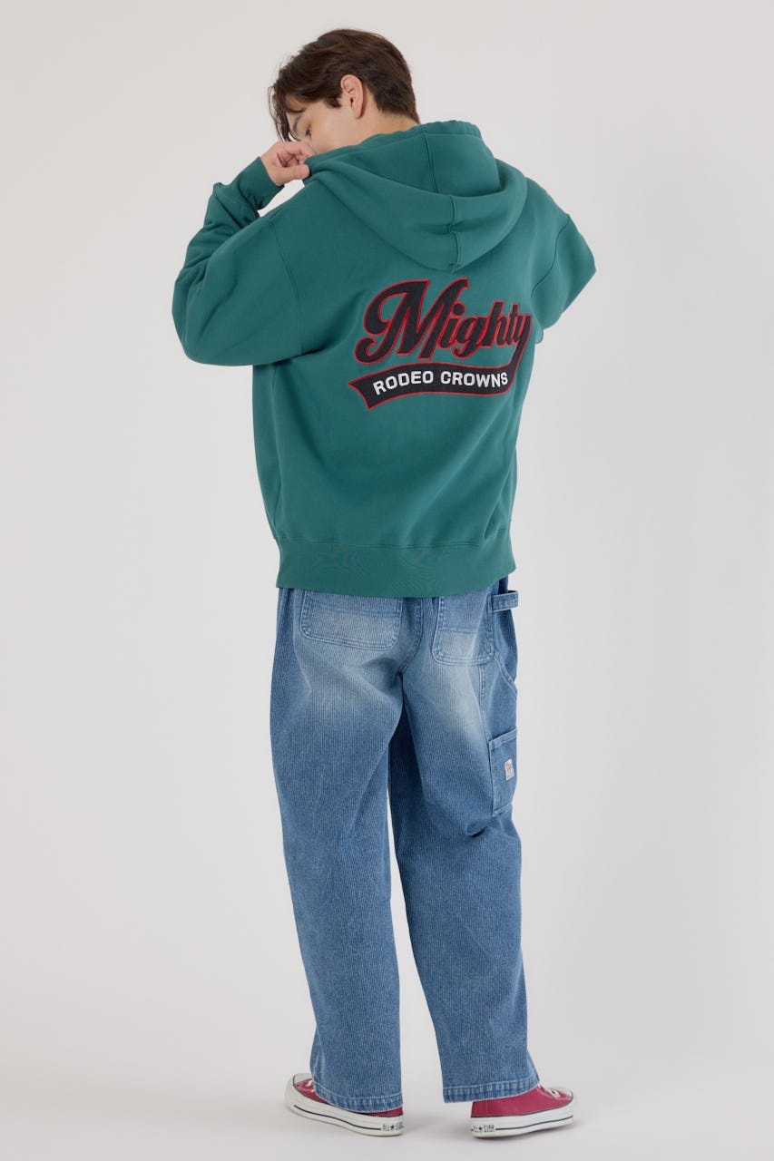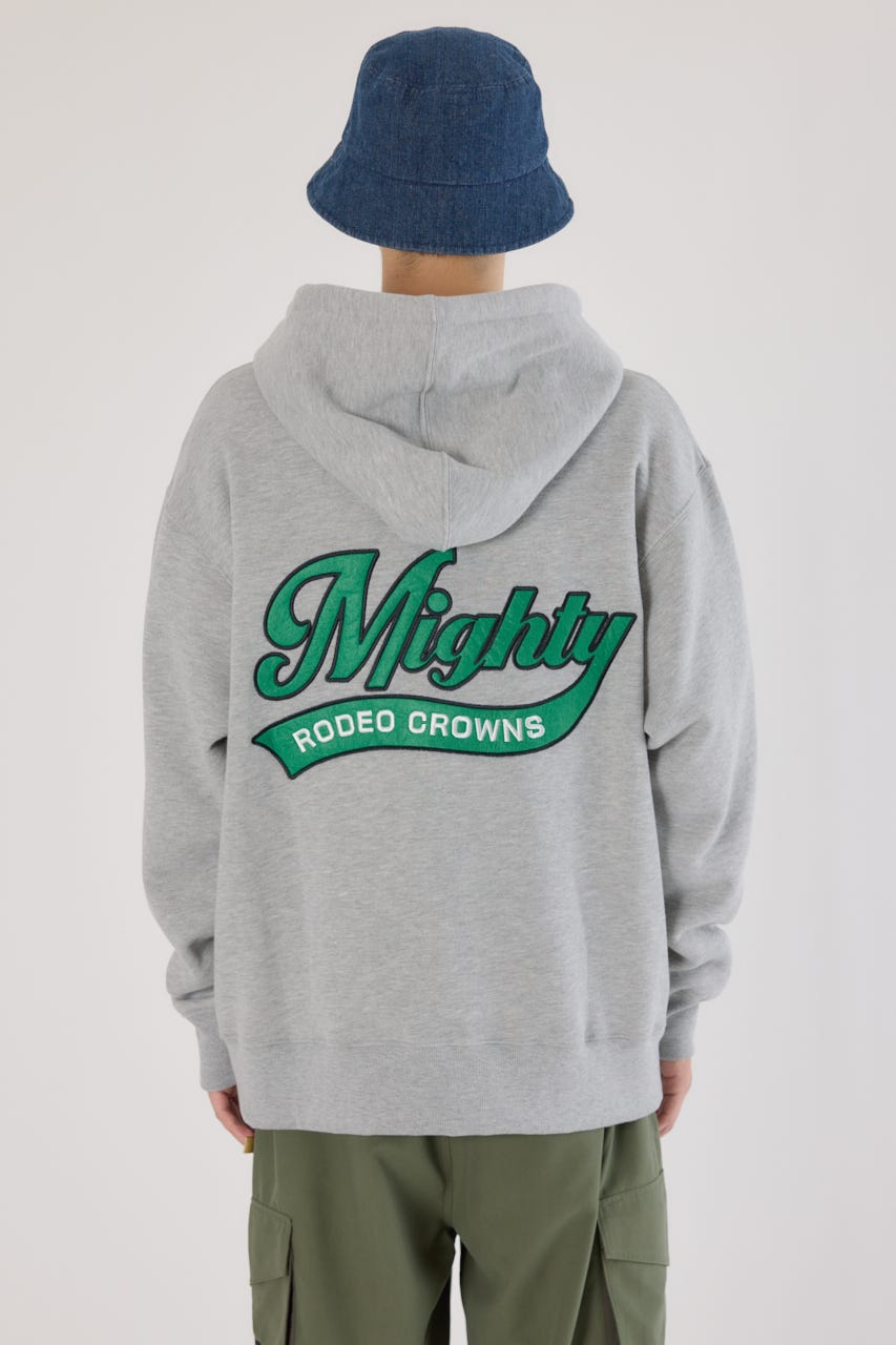 フェルト刺繍を施したバックスタイルが重厚感のあるジップアップパーカー。