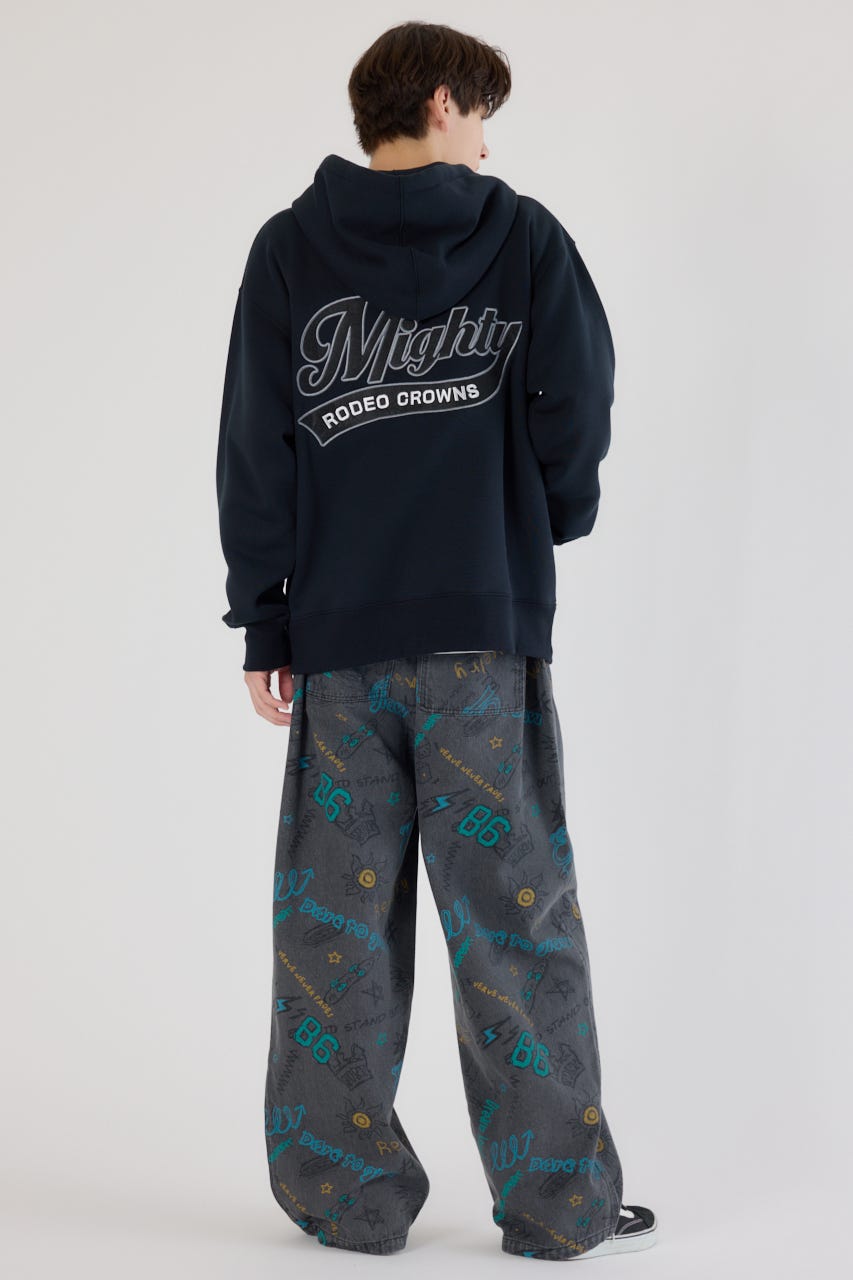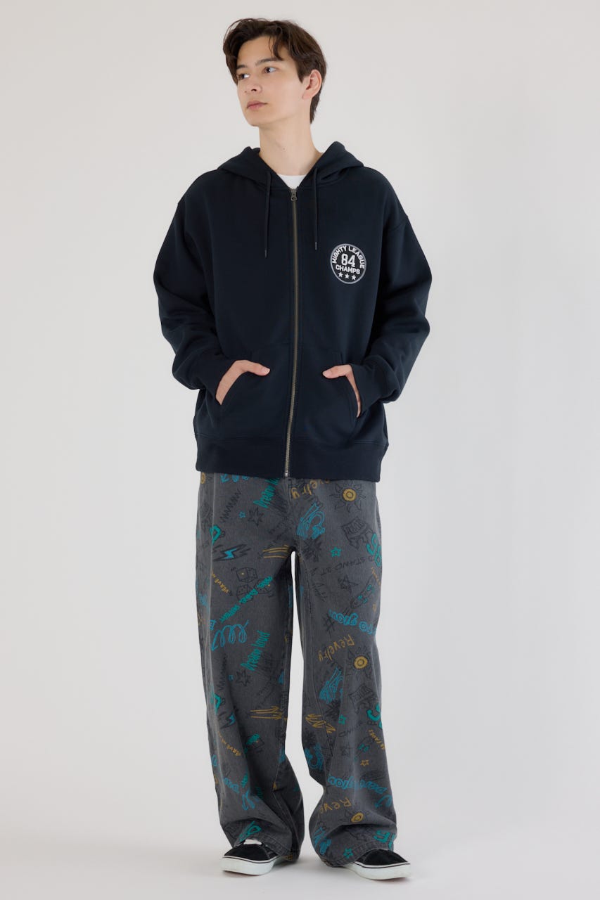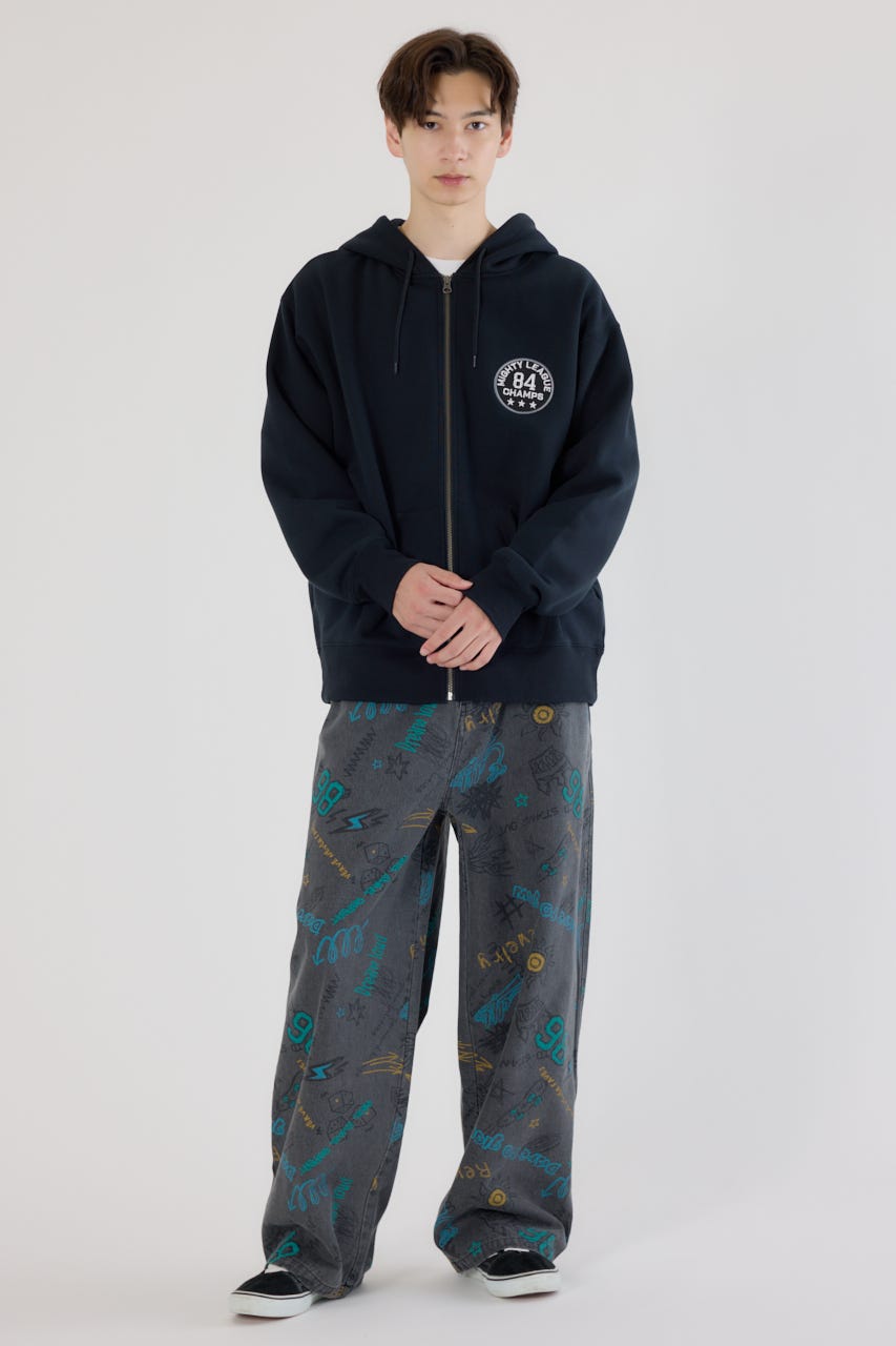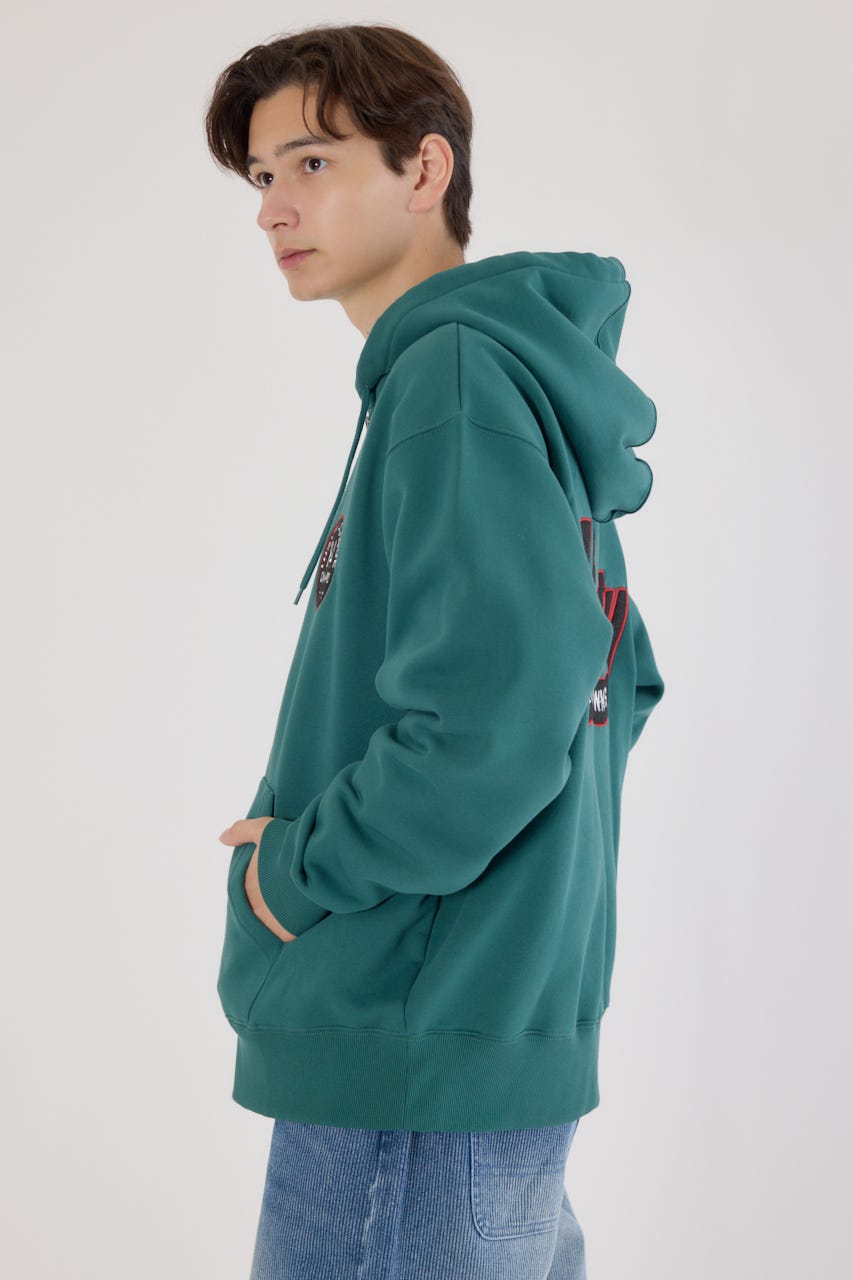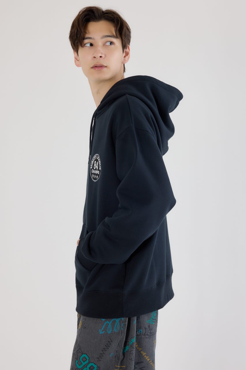 フェルト刺繍を施したバックスタイルが重厚感のあるジップアップパーカー。