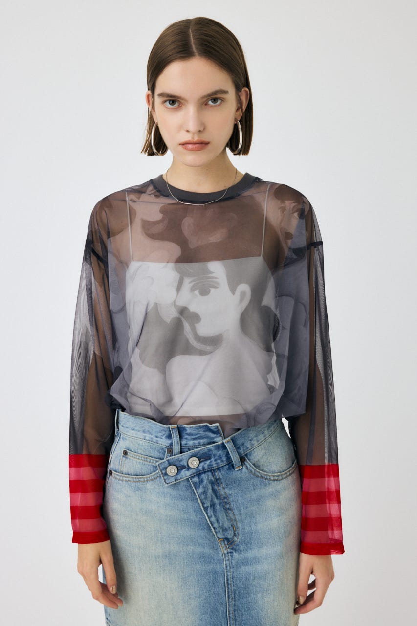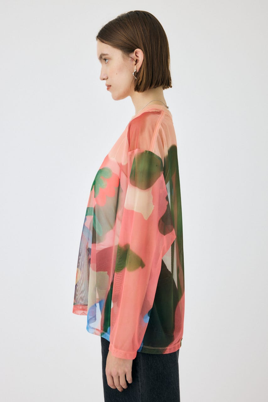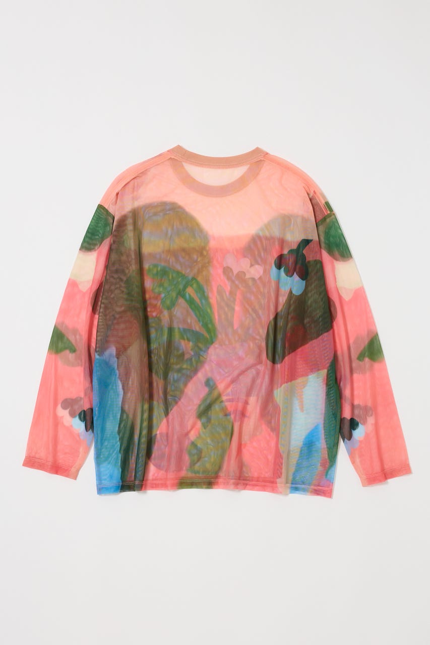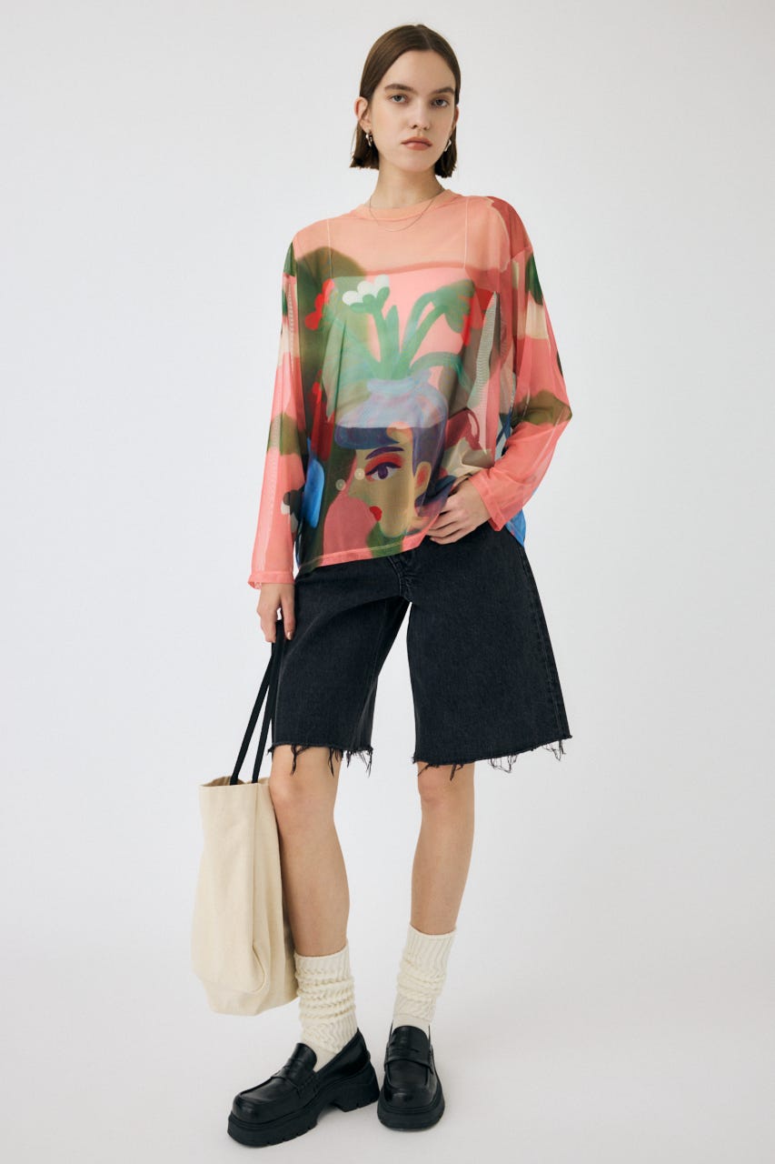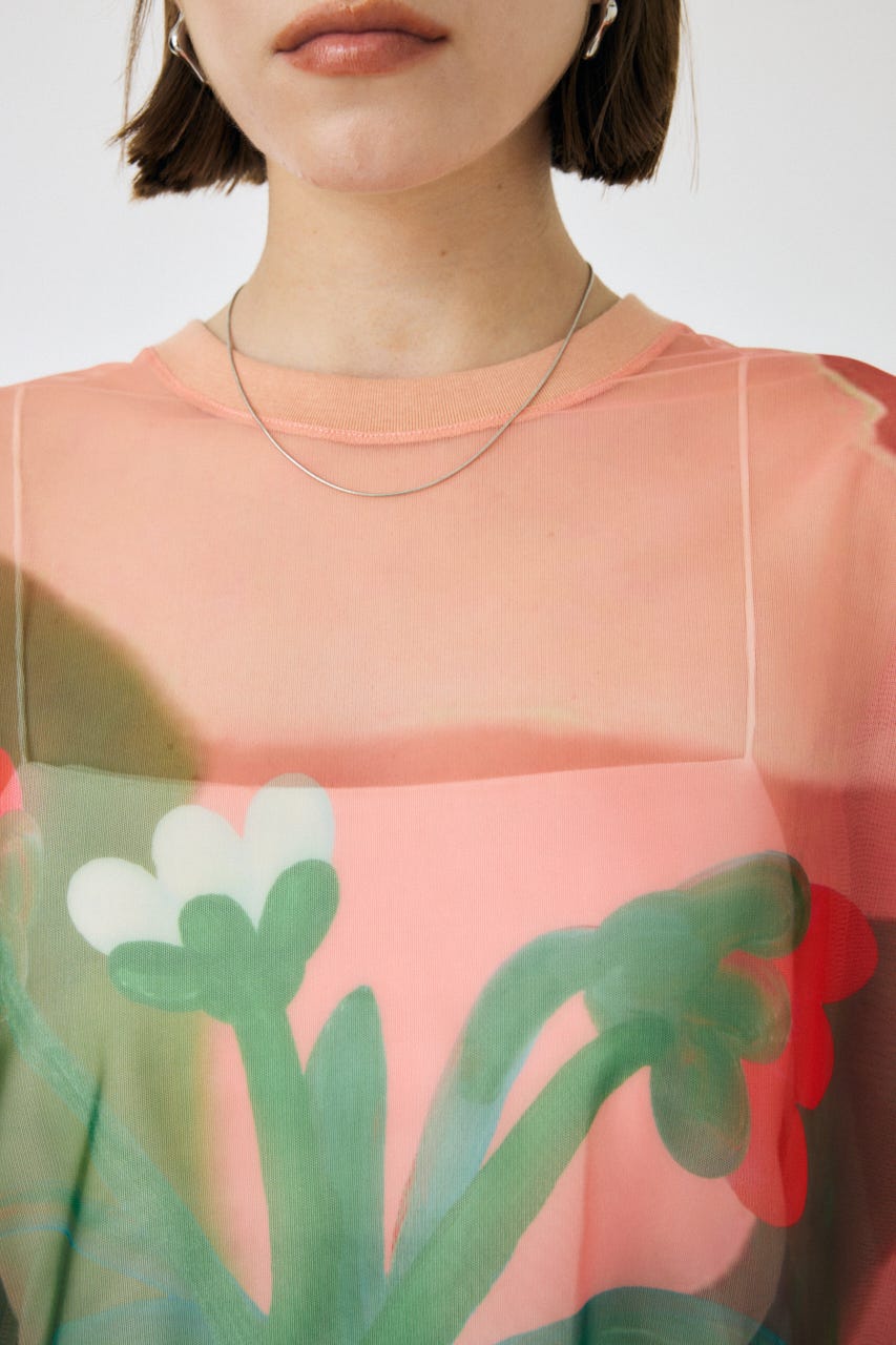 中村桃子氏の描き下ろしアートをシアー素材に全面にプリントしたトップス。