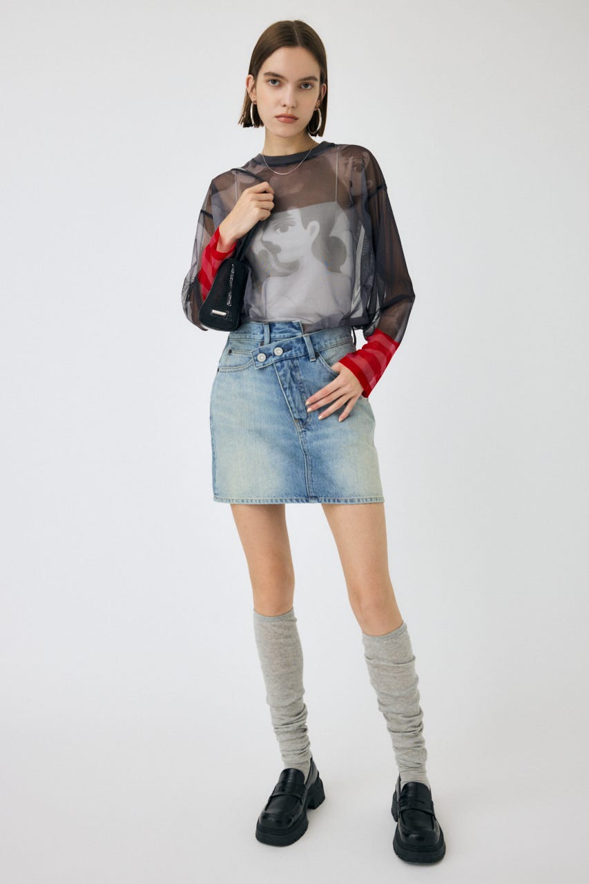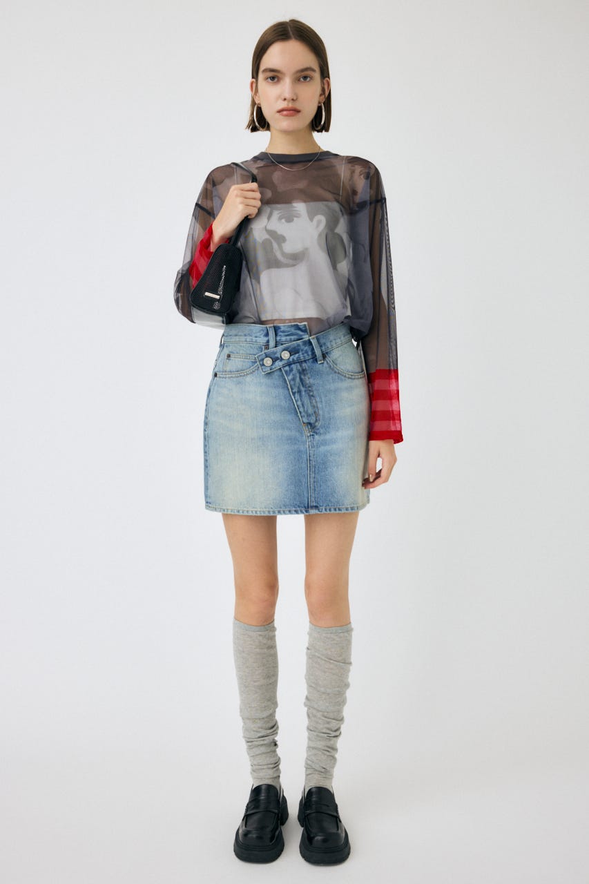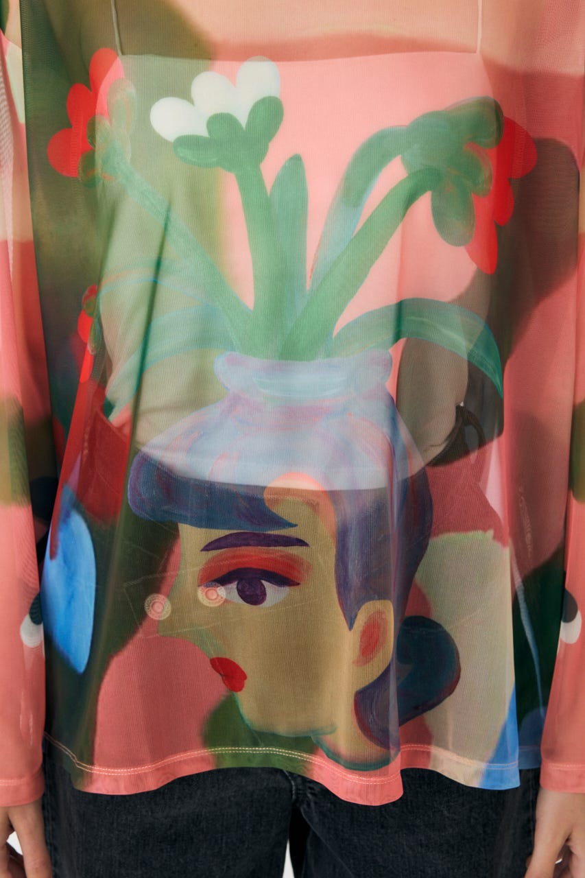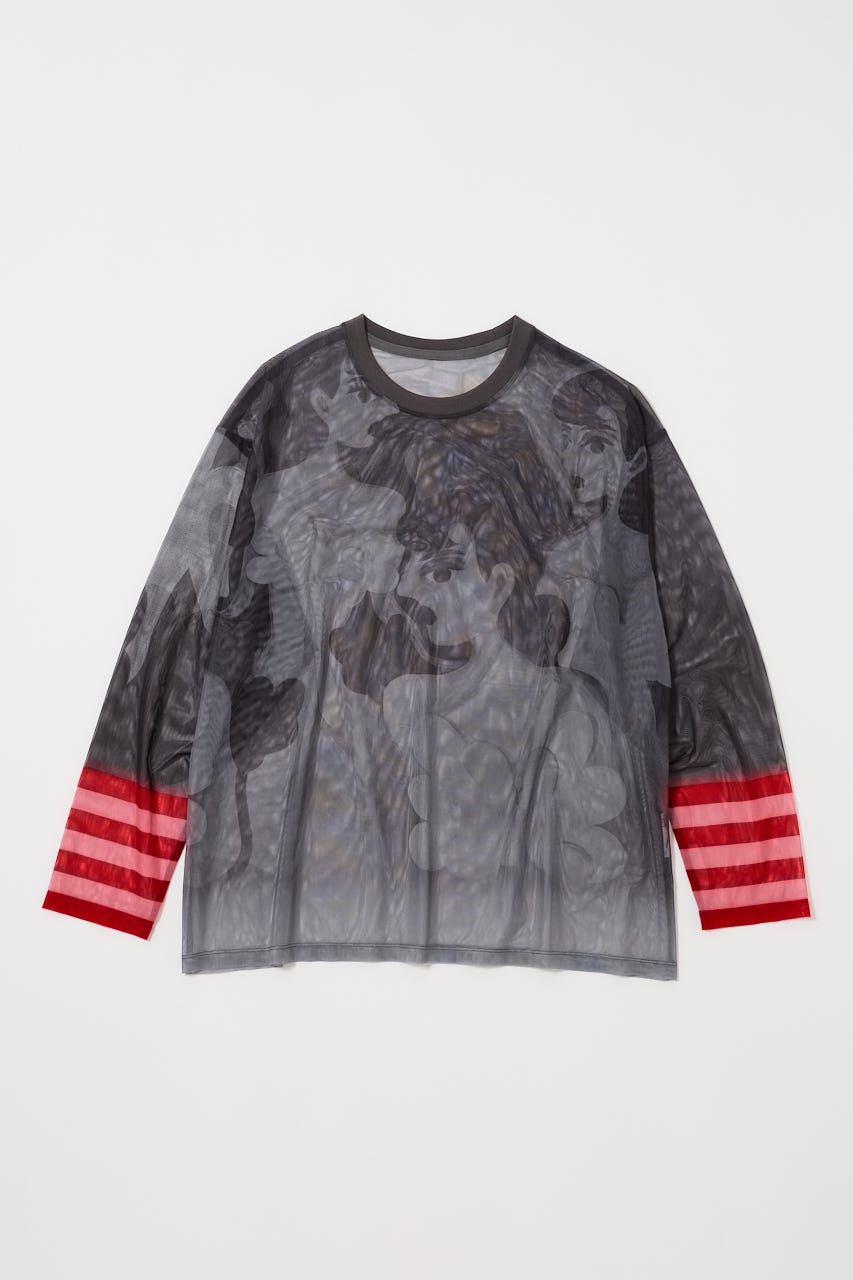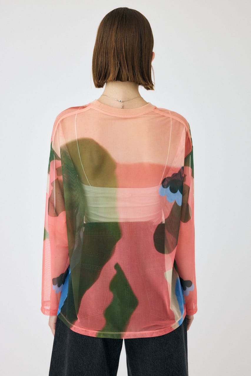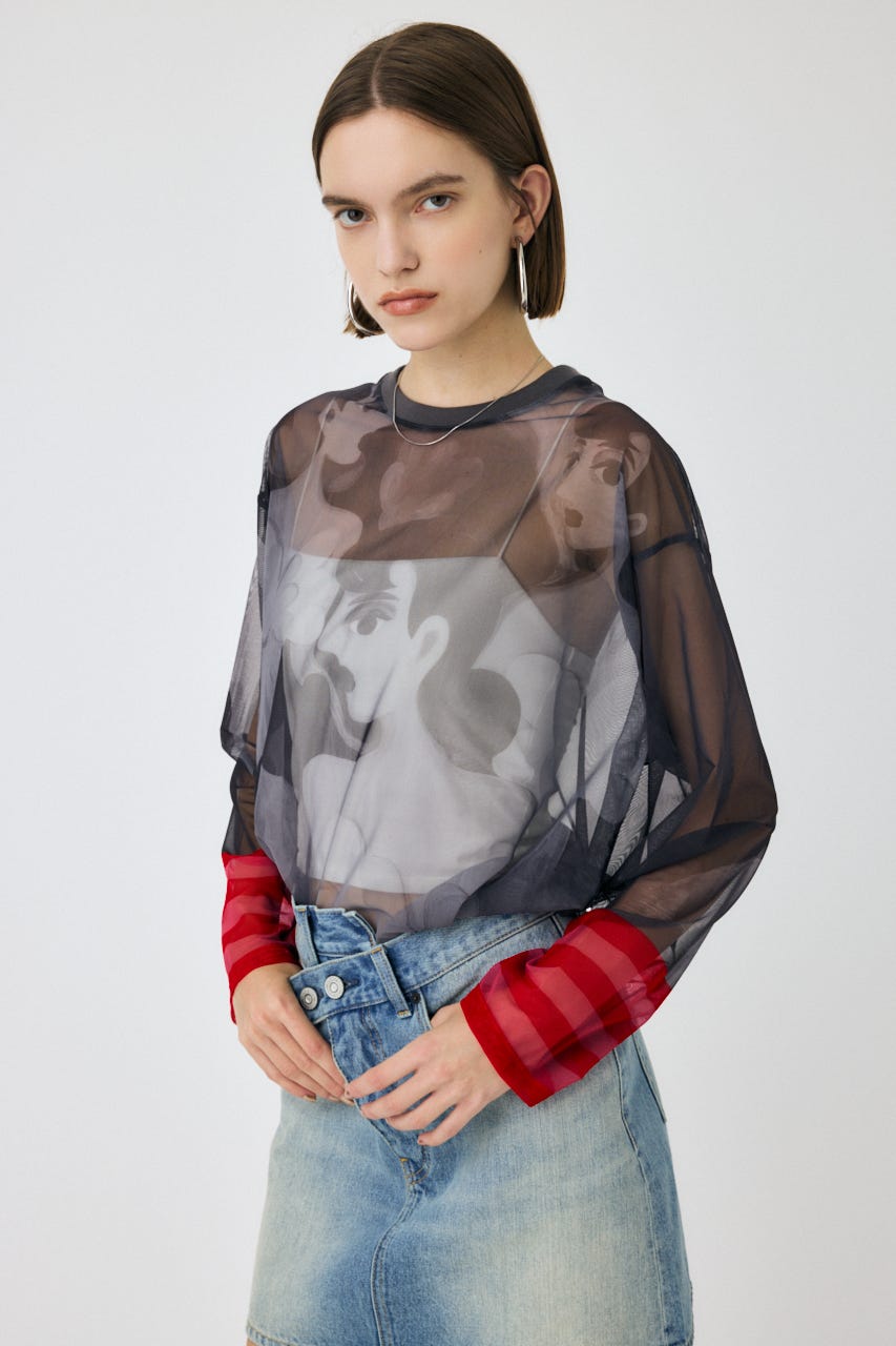 中村桃子氏の描き下ろしアートをシアー素材に全面にプリントしたトップス。