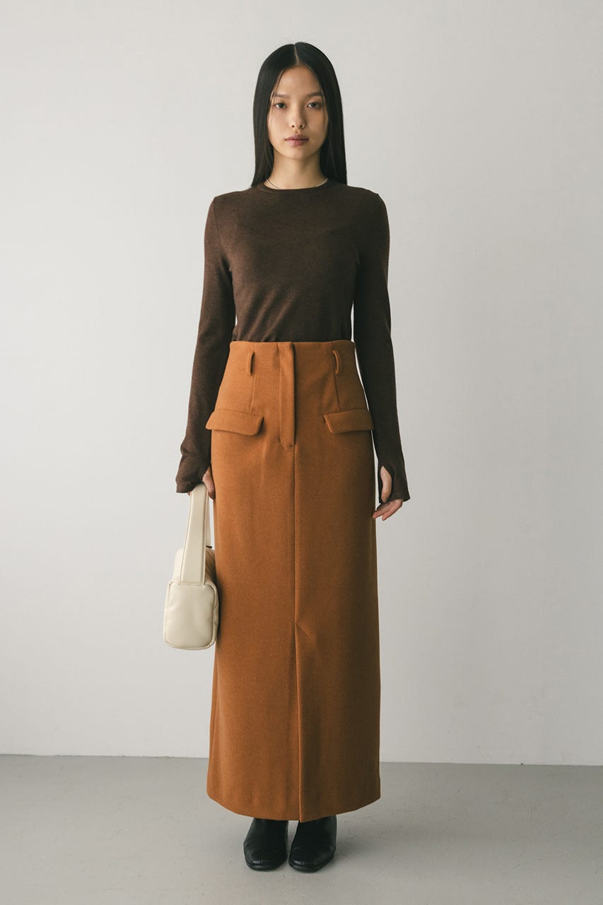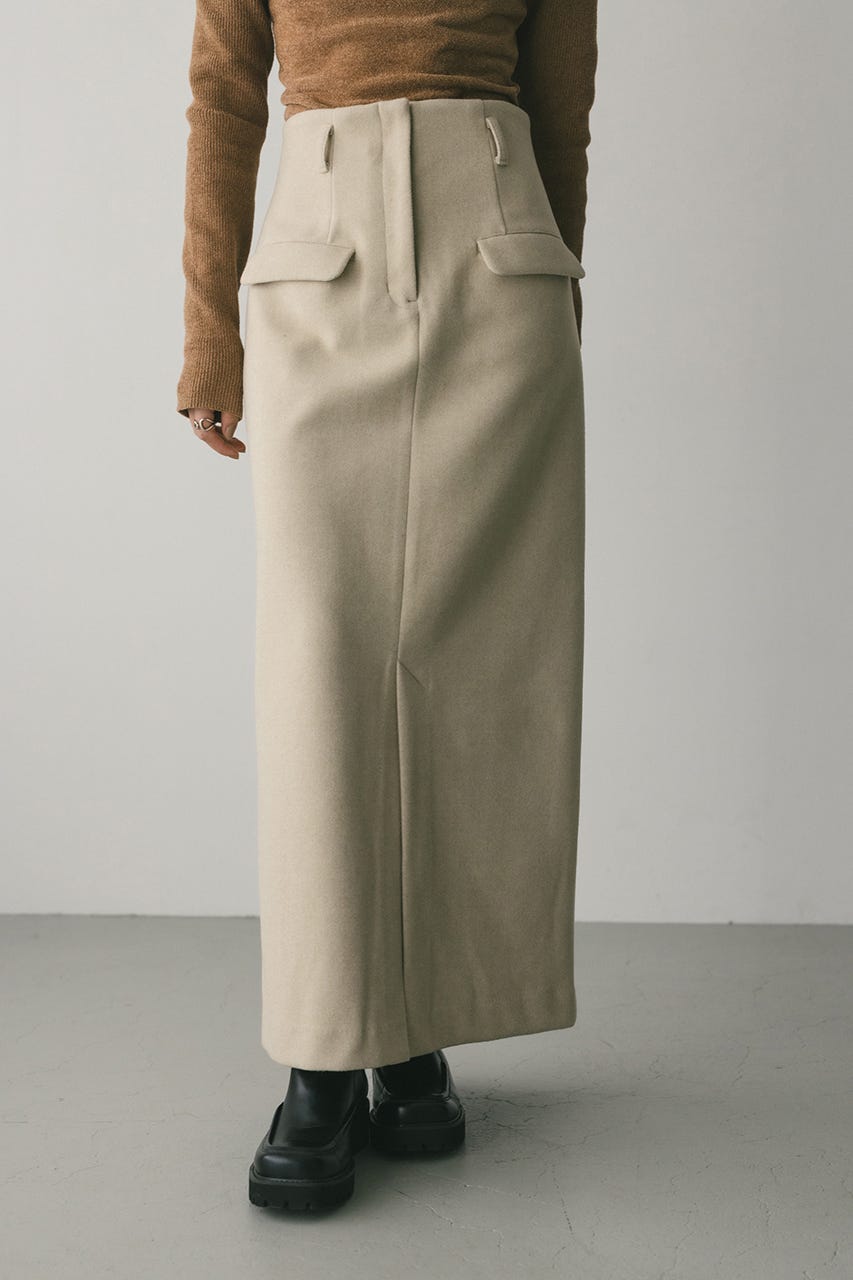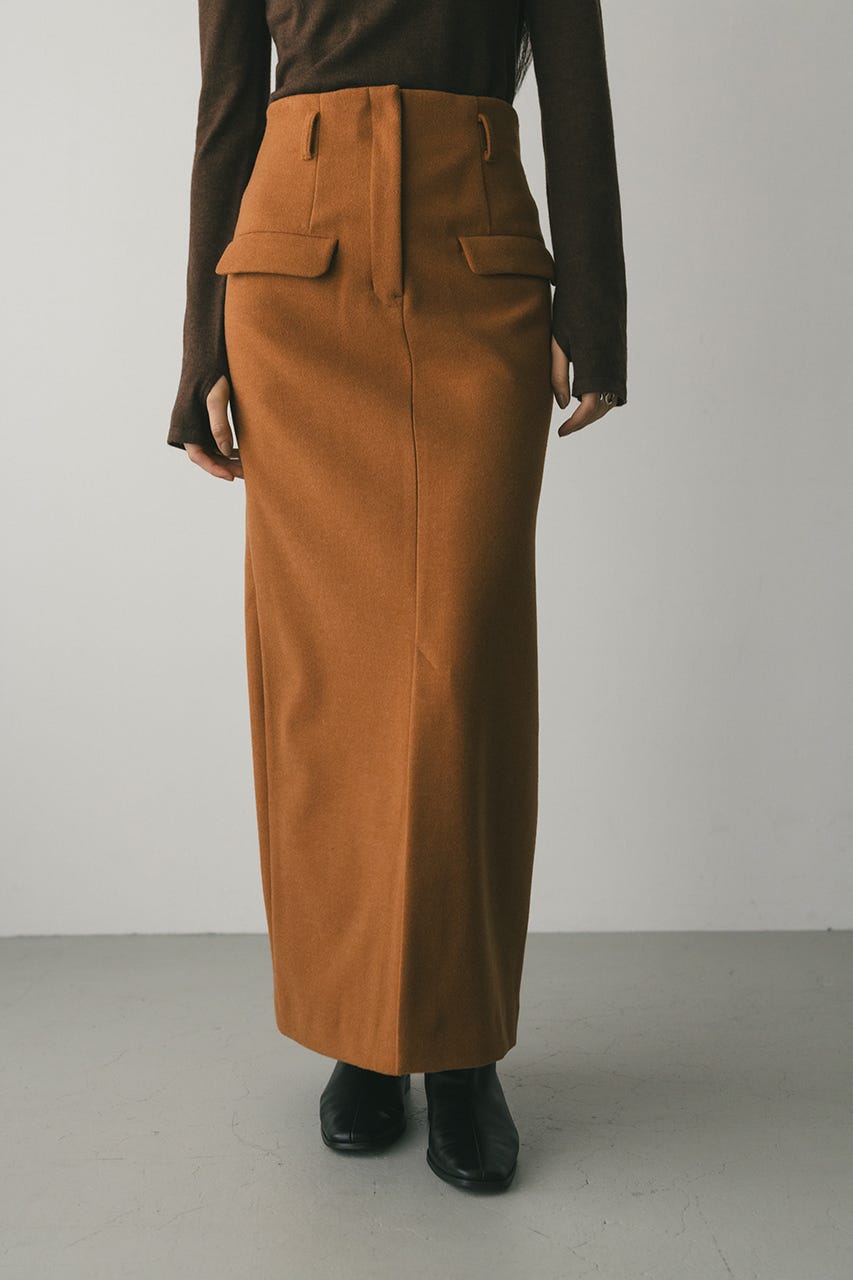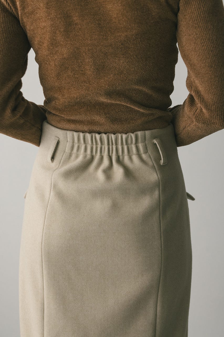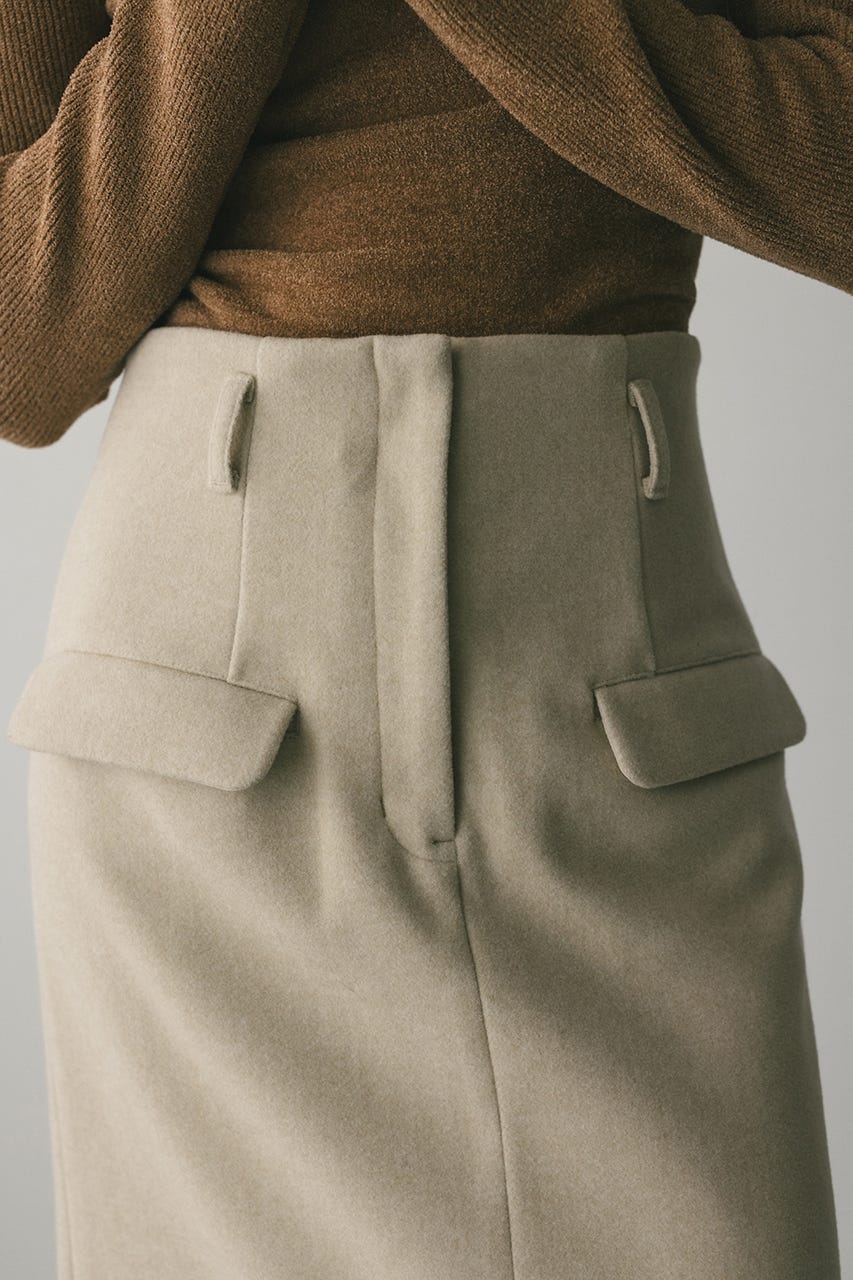 すっきりとしたナローシルエットと実用性とアクセントを兼ね備えたフロントポケットをデザインがポイントのスカート。