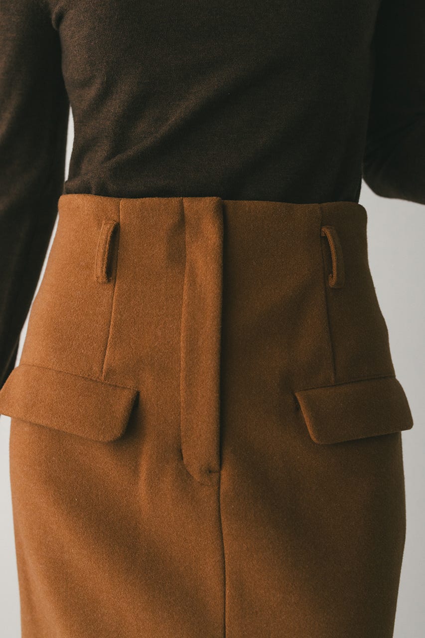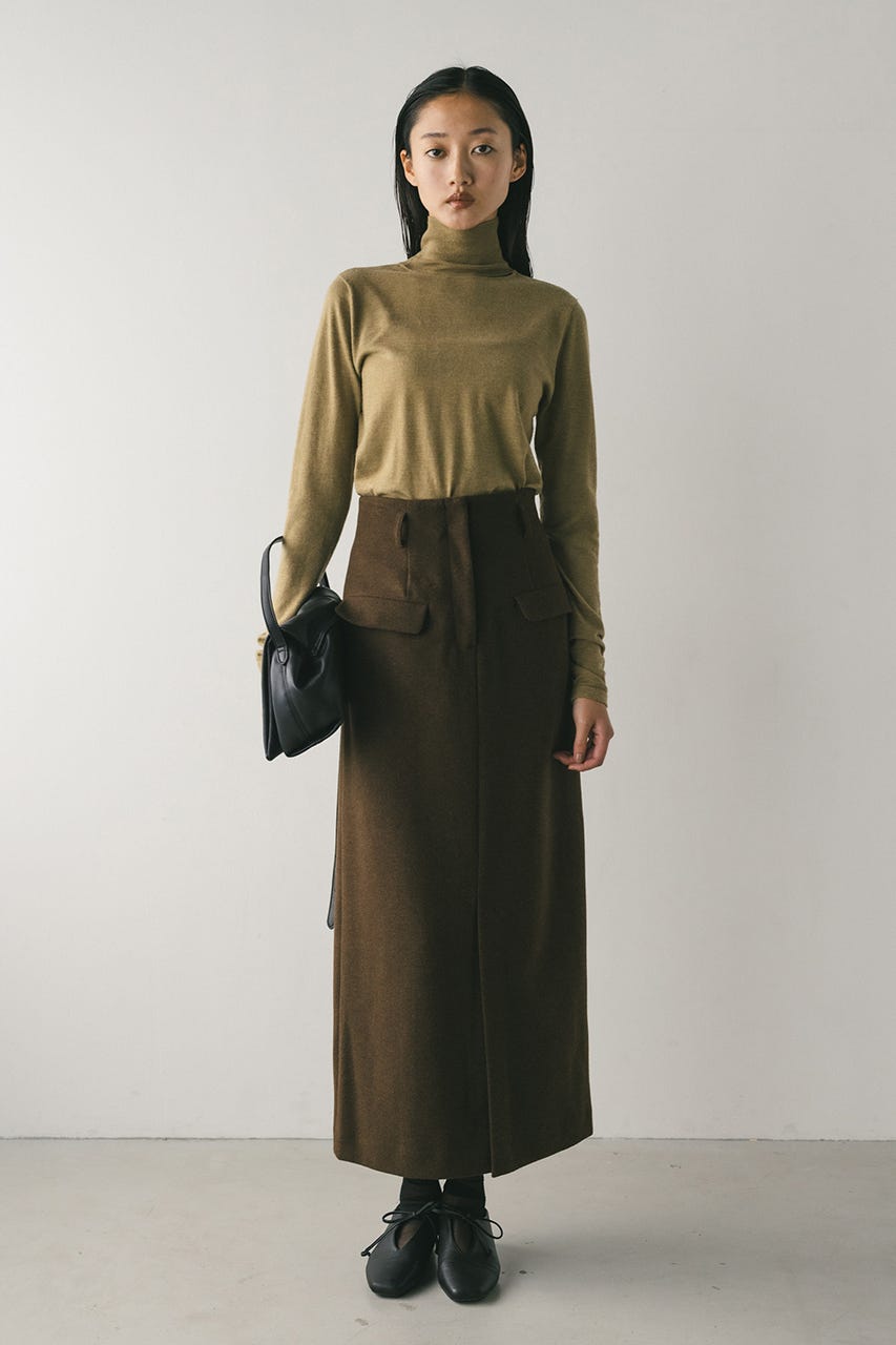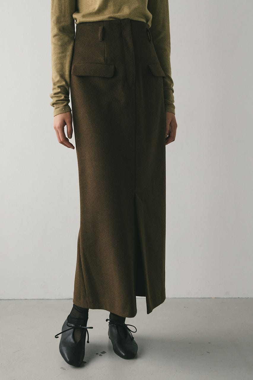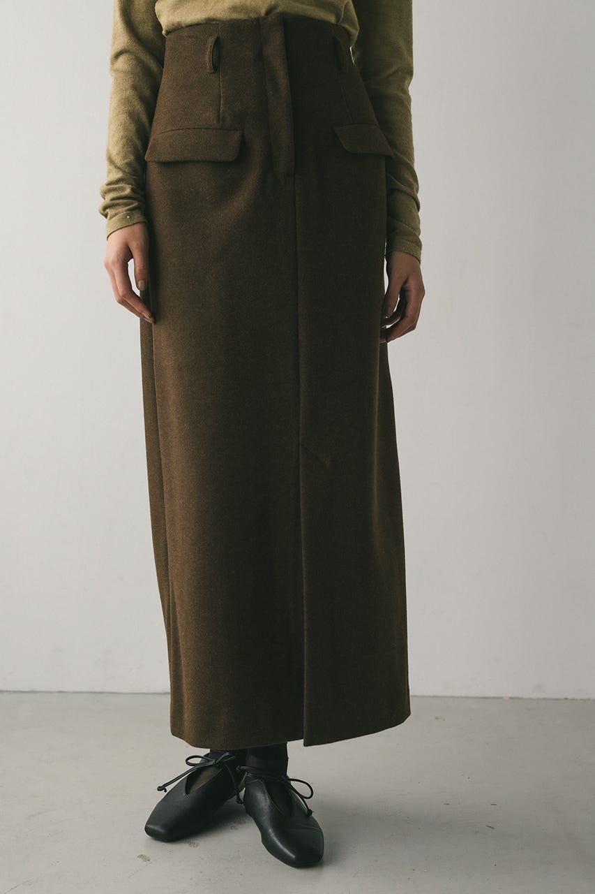 すっきりとしたナローシルエットと実用性とアクセントを兼ね備えたフロントポケットをデザインがポイントのスカート。