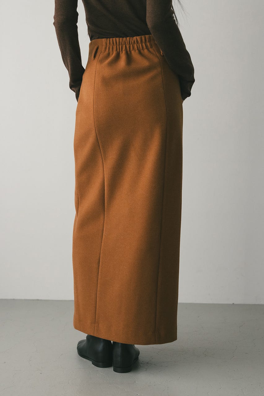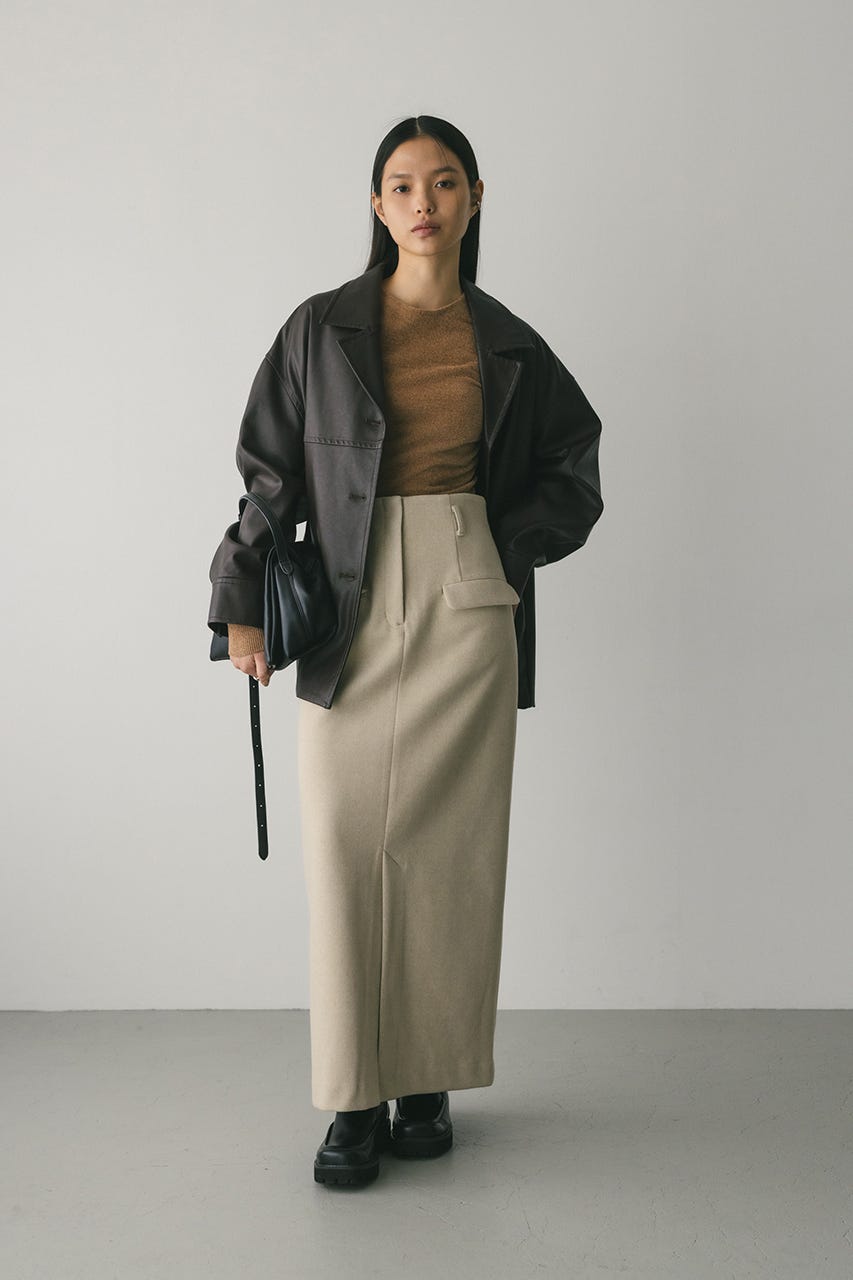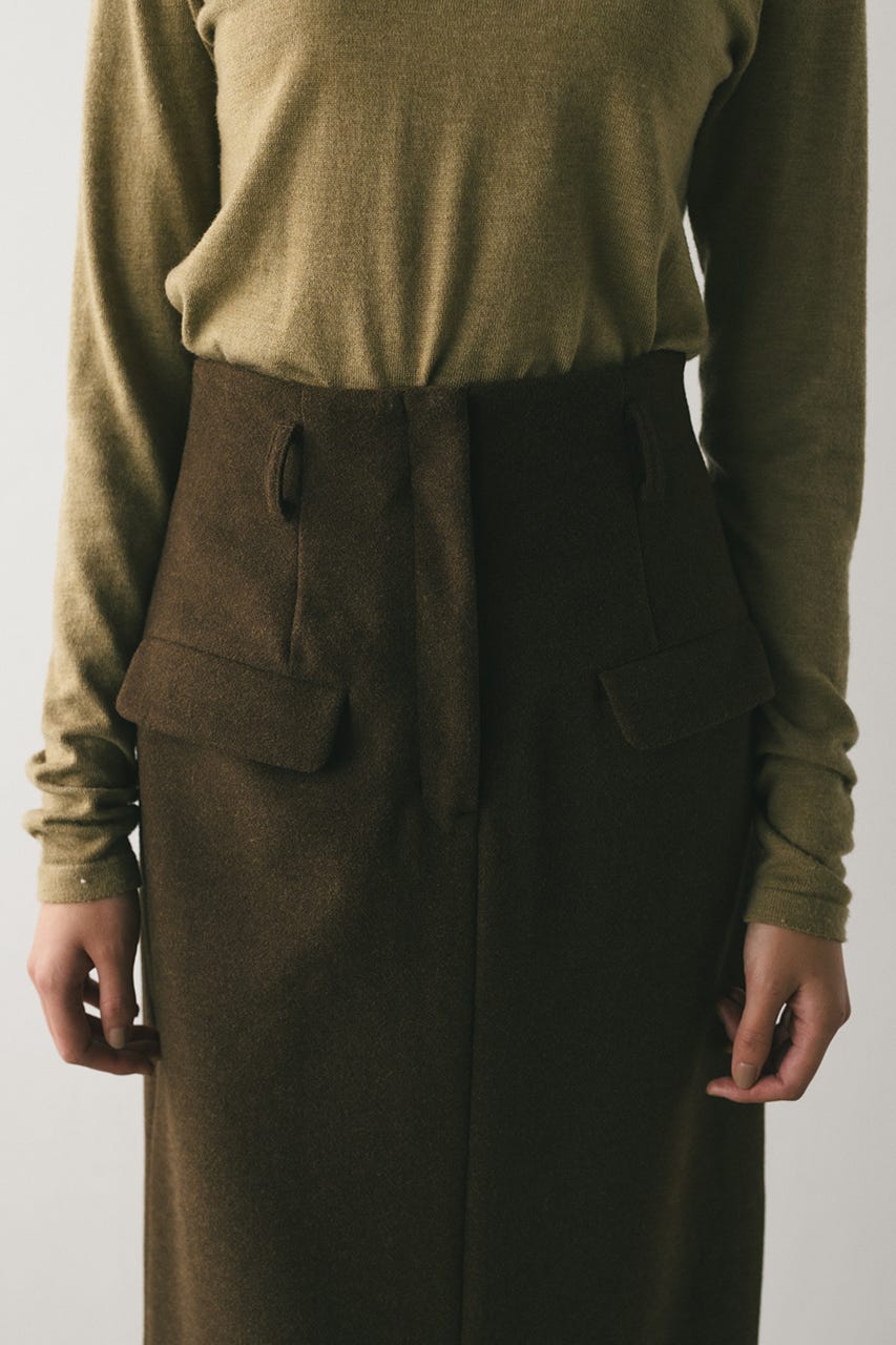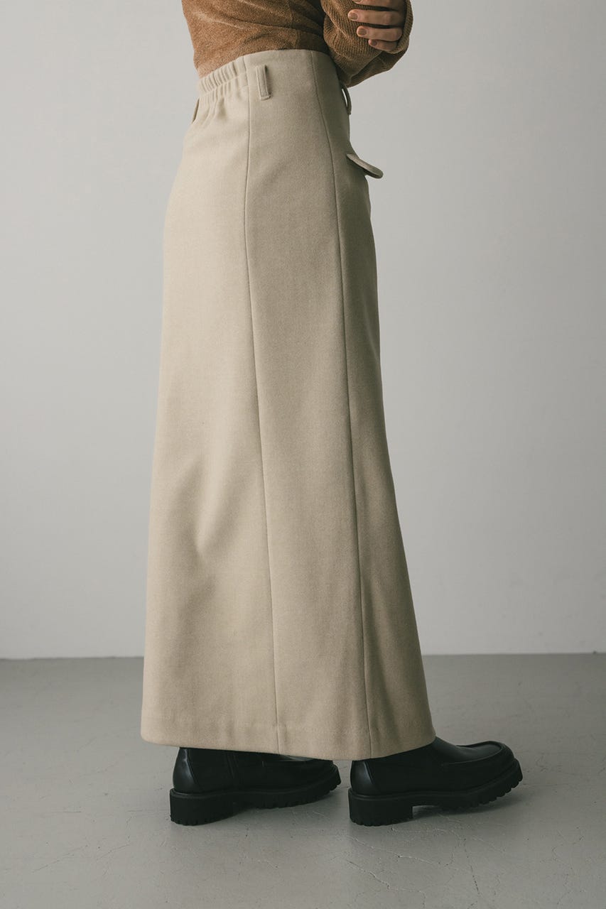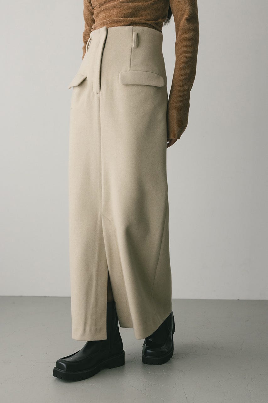 すっきりとしたナローシルエットと実用性とアクセントを兼ね備えたフロントポケットをデザインがポイントのスカート。