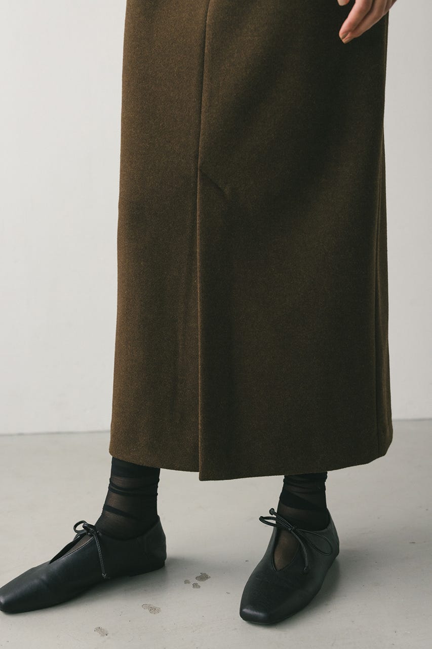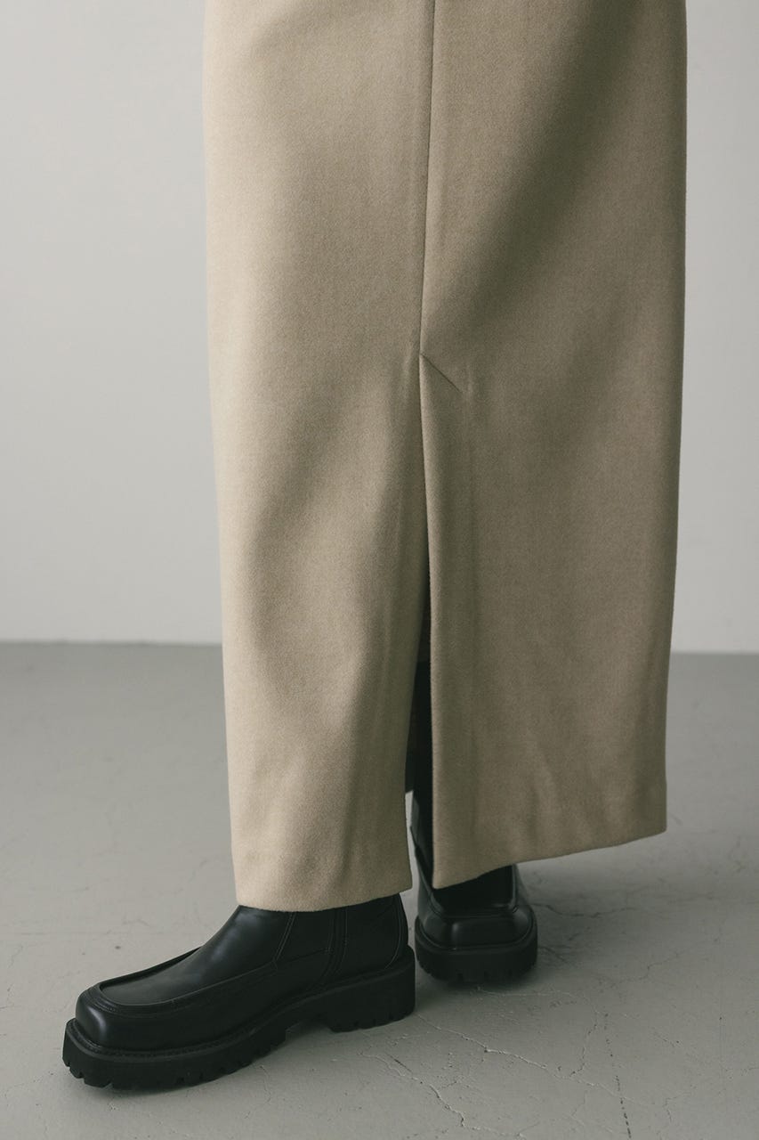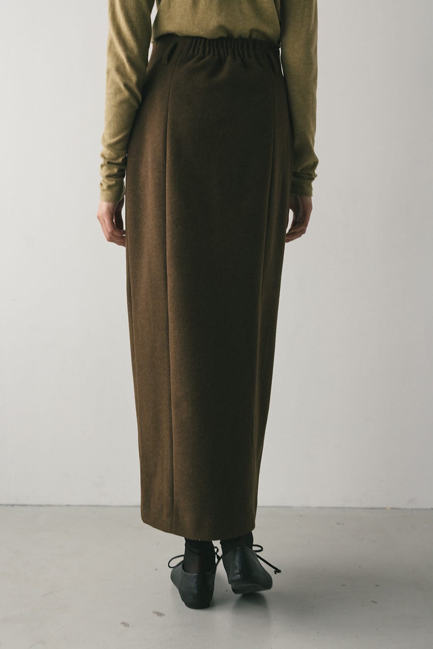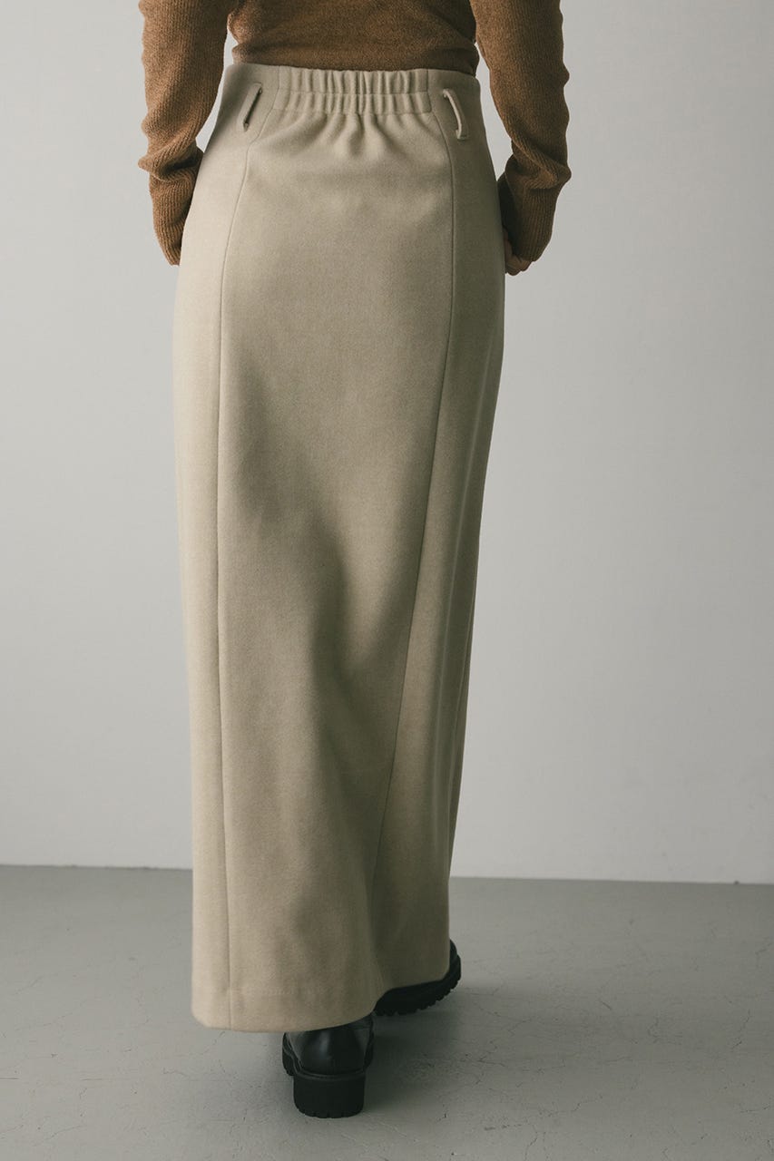 すっきりとしたナローシルエットと実用性とアクセントを兼ね備えたフロントポケットをデザインがポイントのスカート。
