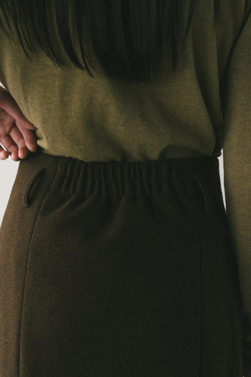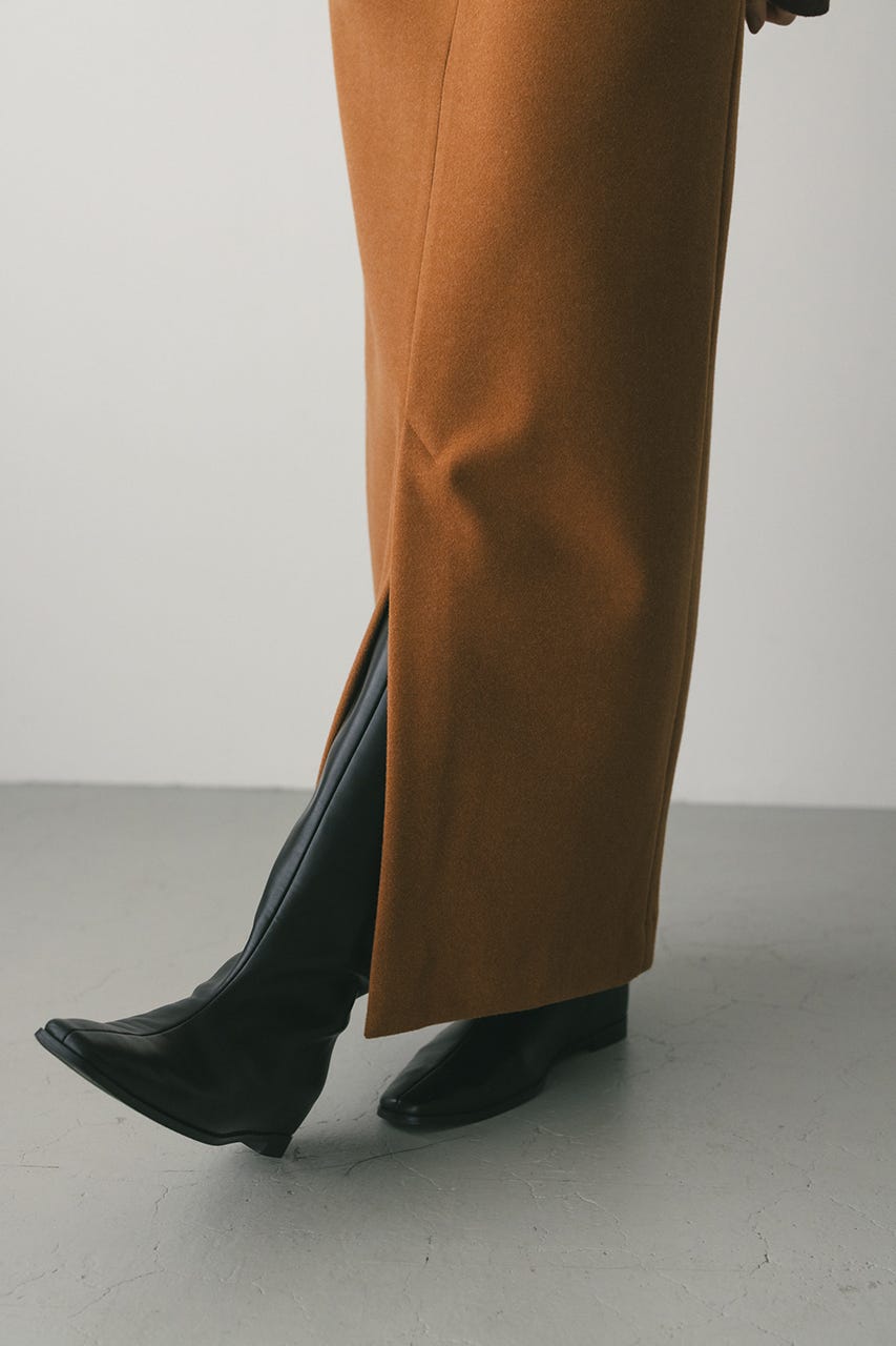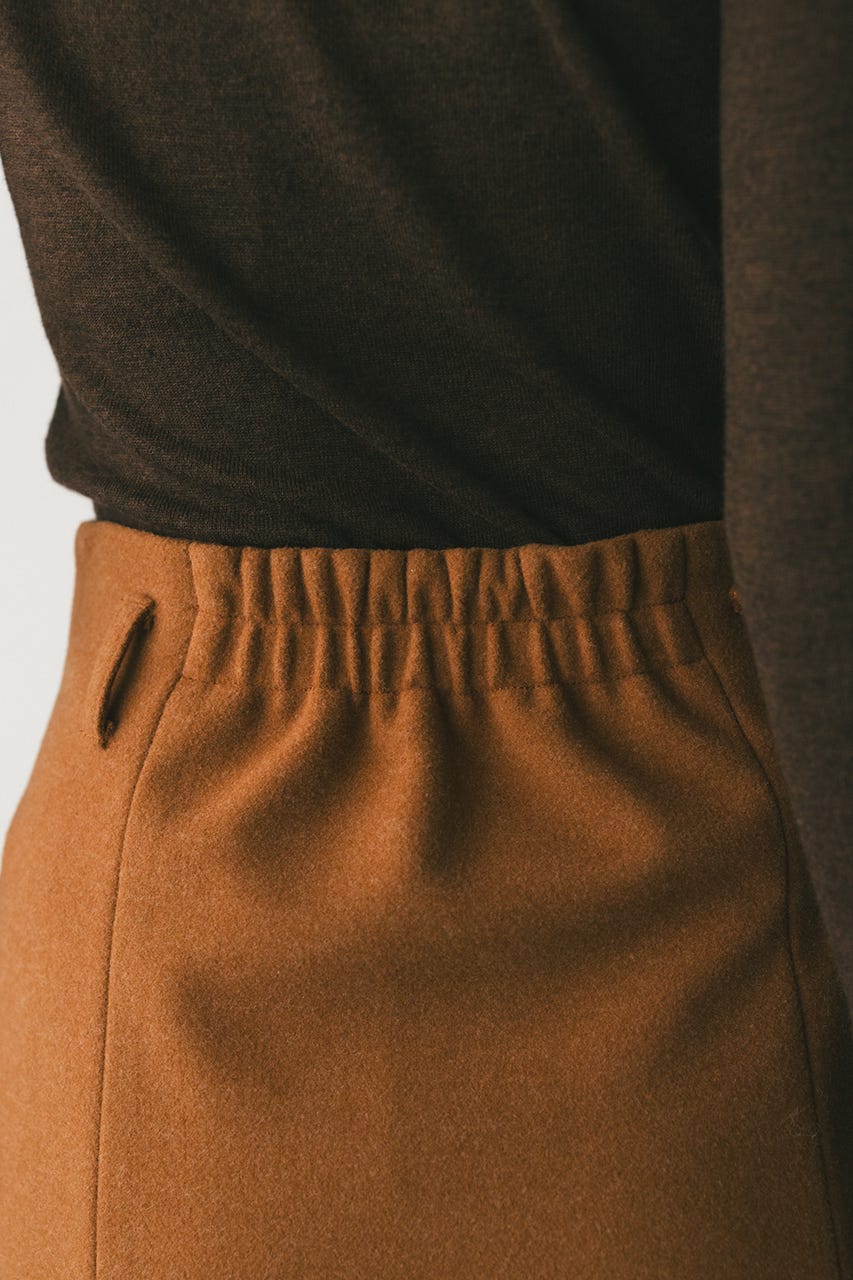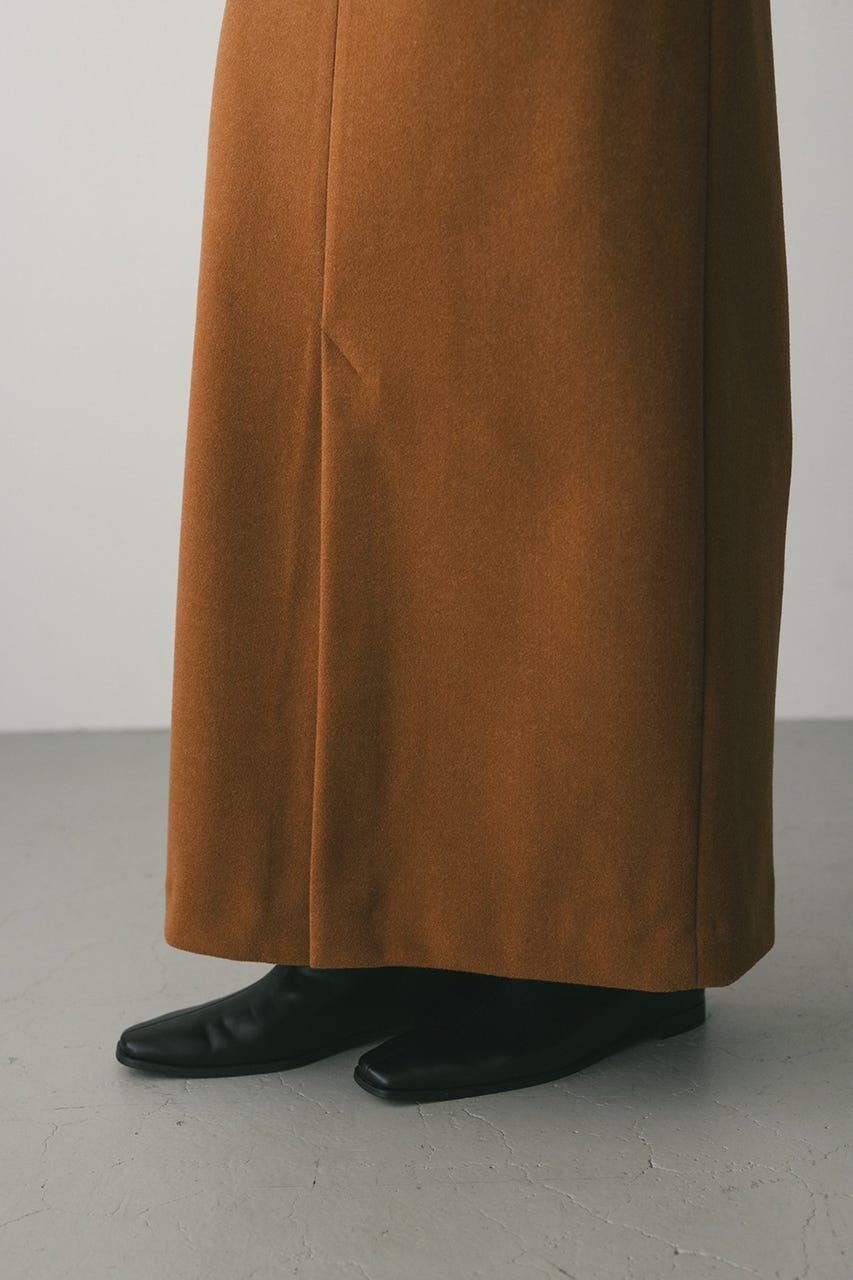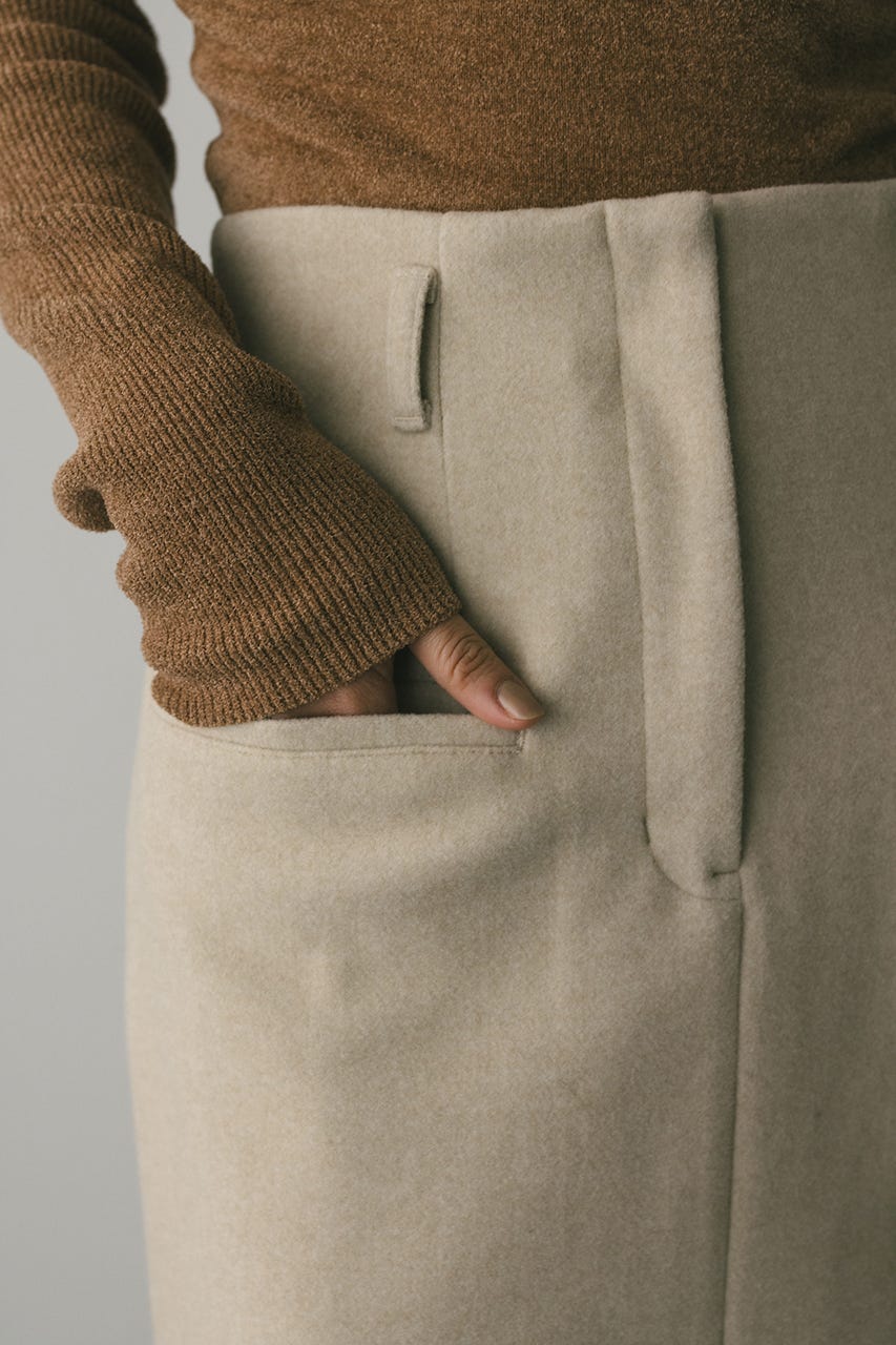 すっきりとしたナローシルエットと実用性とアクセントを兼ね備えたフロントポケットをデザインがポイントのスカート。