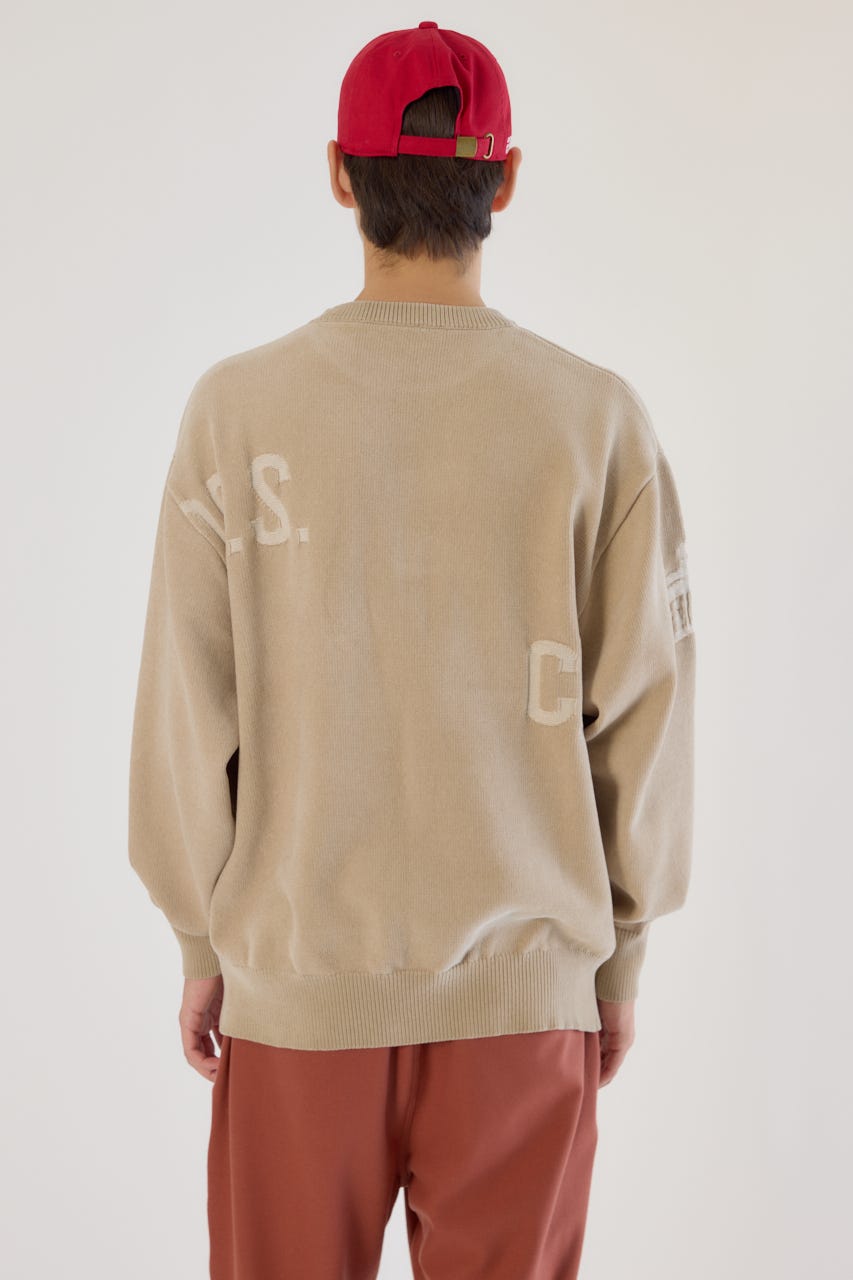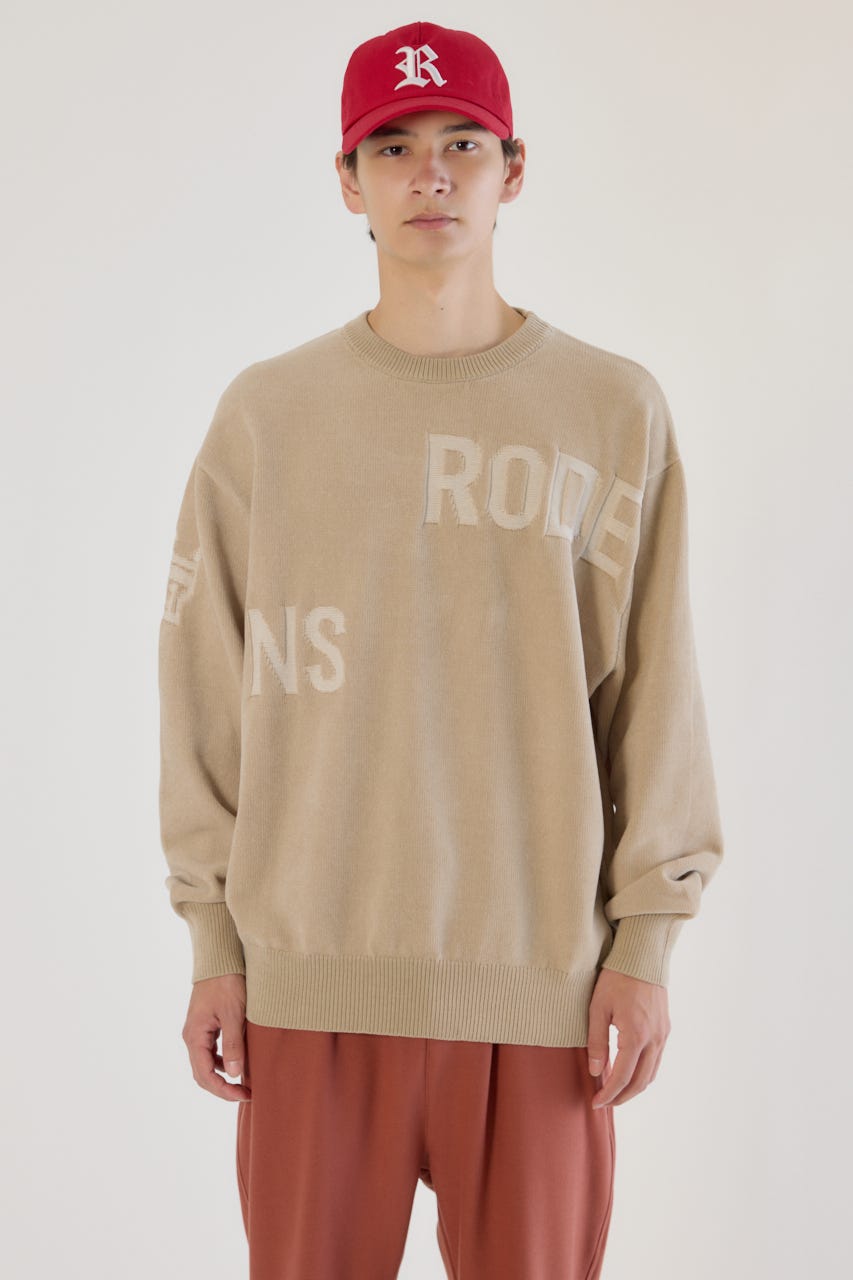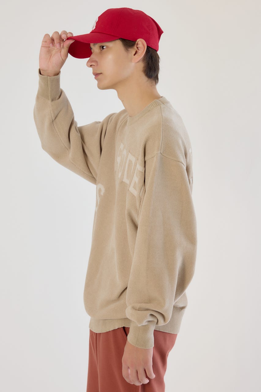 糸の種類を使いわけることにより、編み柄でも凹凸を表現し、異素材の組み合わせでより立体的なロゴデザインなどをニットに落とし込んでいます。