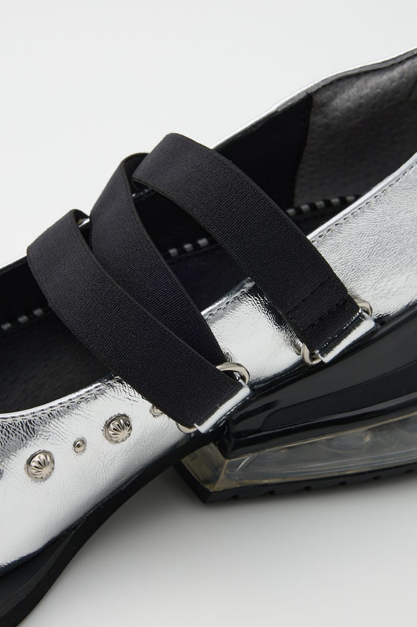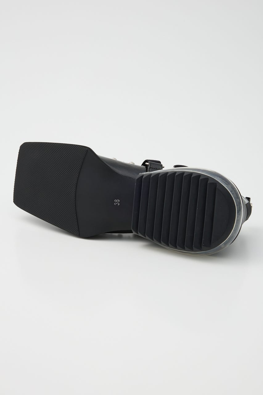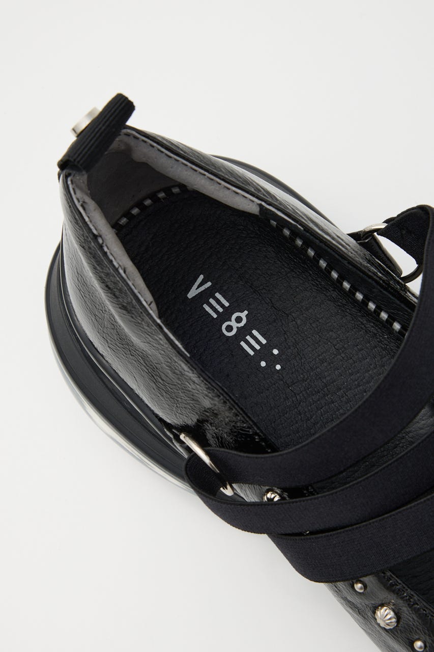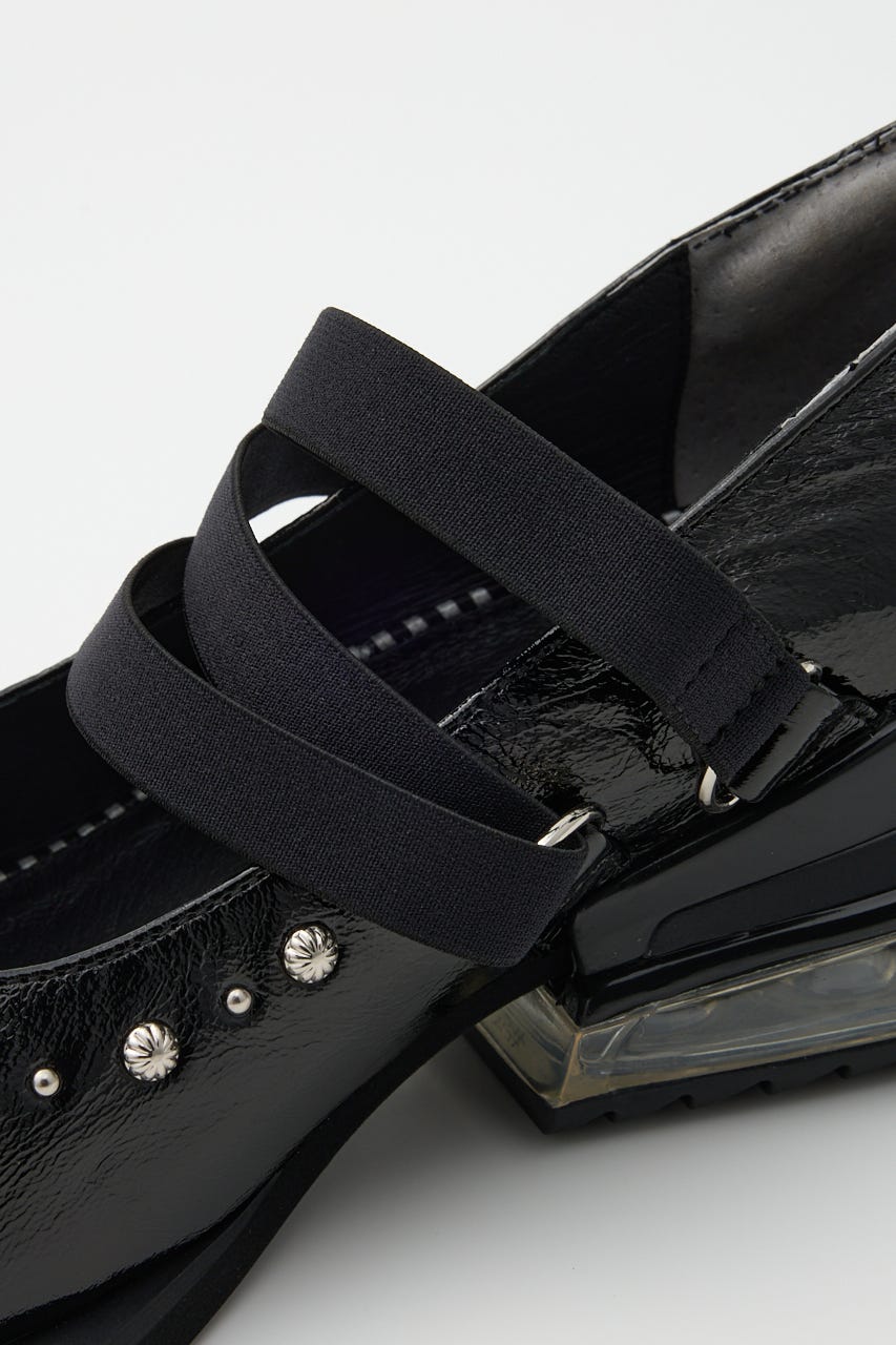 キラッと輝くスタッズと、ゴム仕様のクロスストラップ。