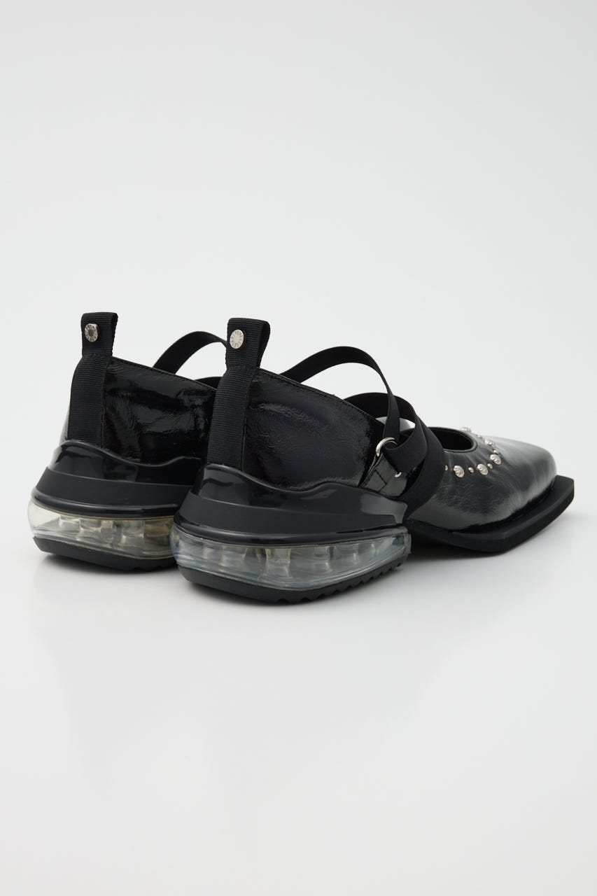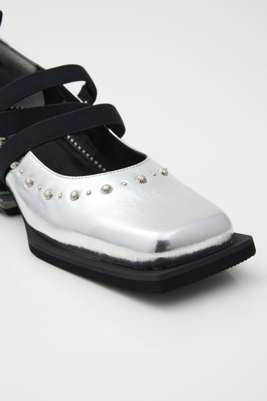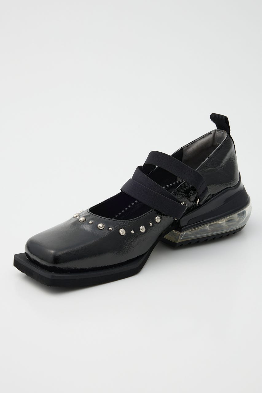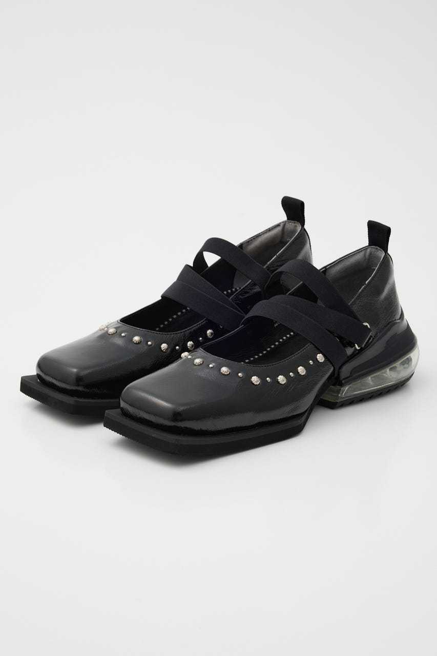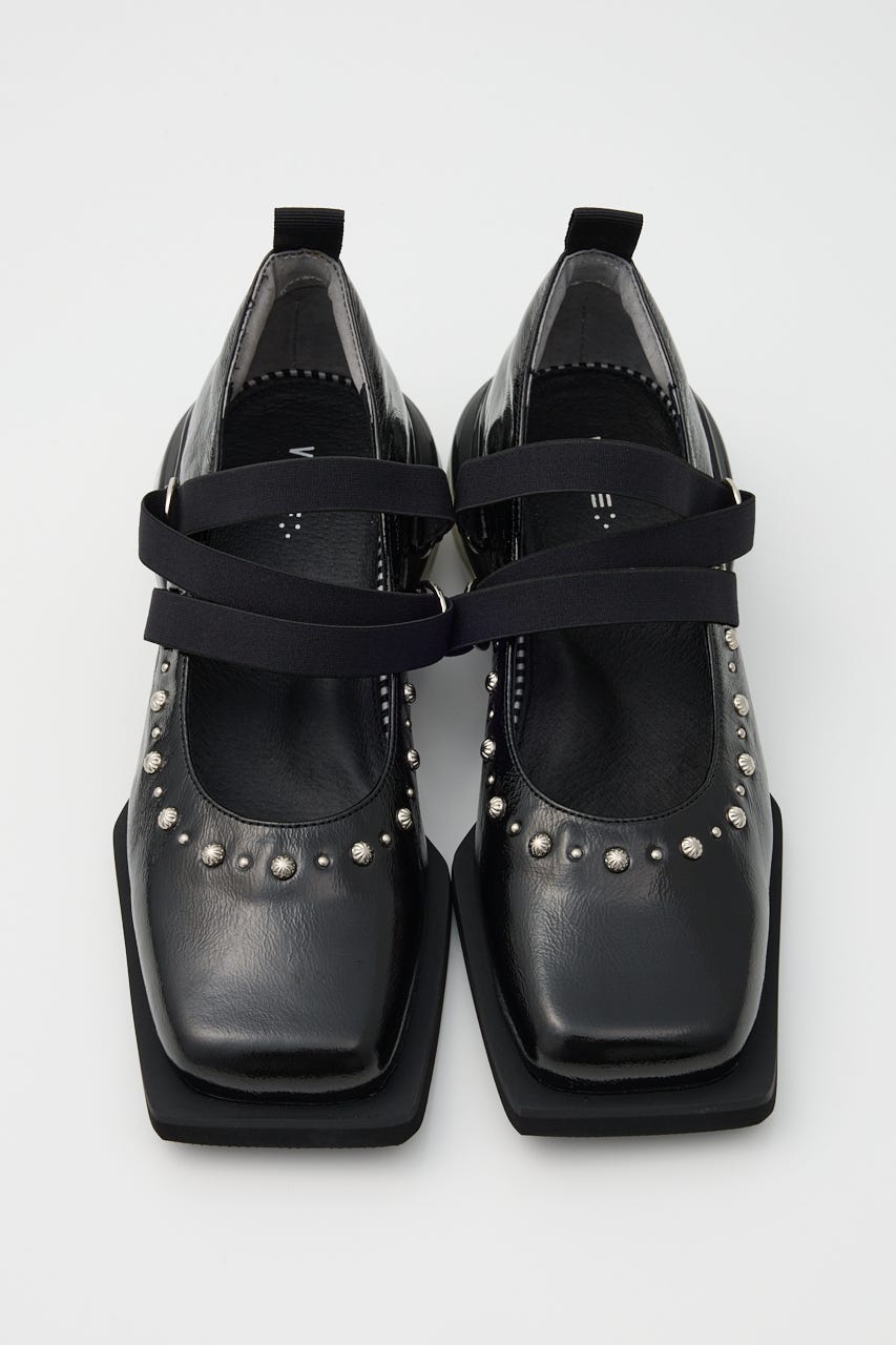 キラッと輝くスタッズと、ゴム仕様のクロスストラップ。