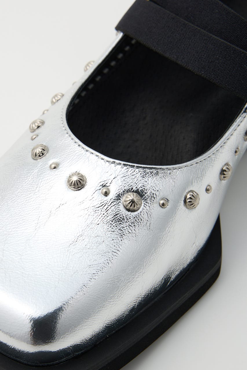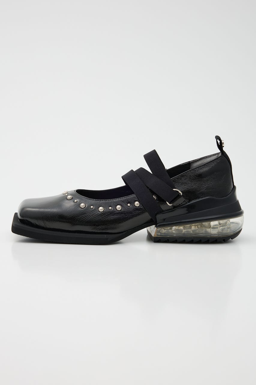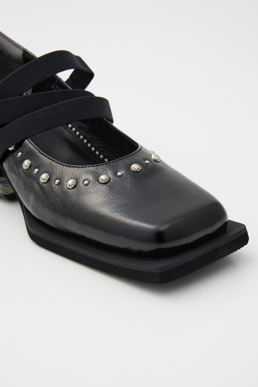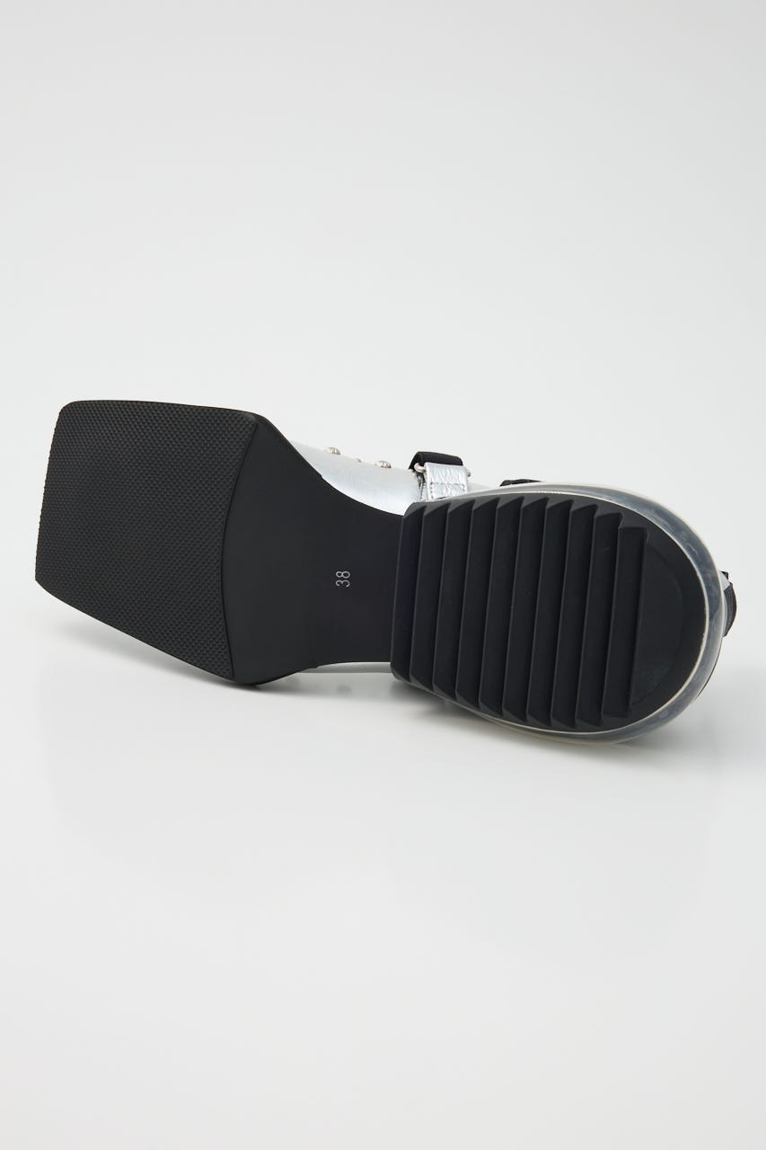 キラッと輝くスタッズと、ゴム仕様のクロスストラップ。