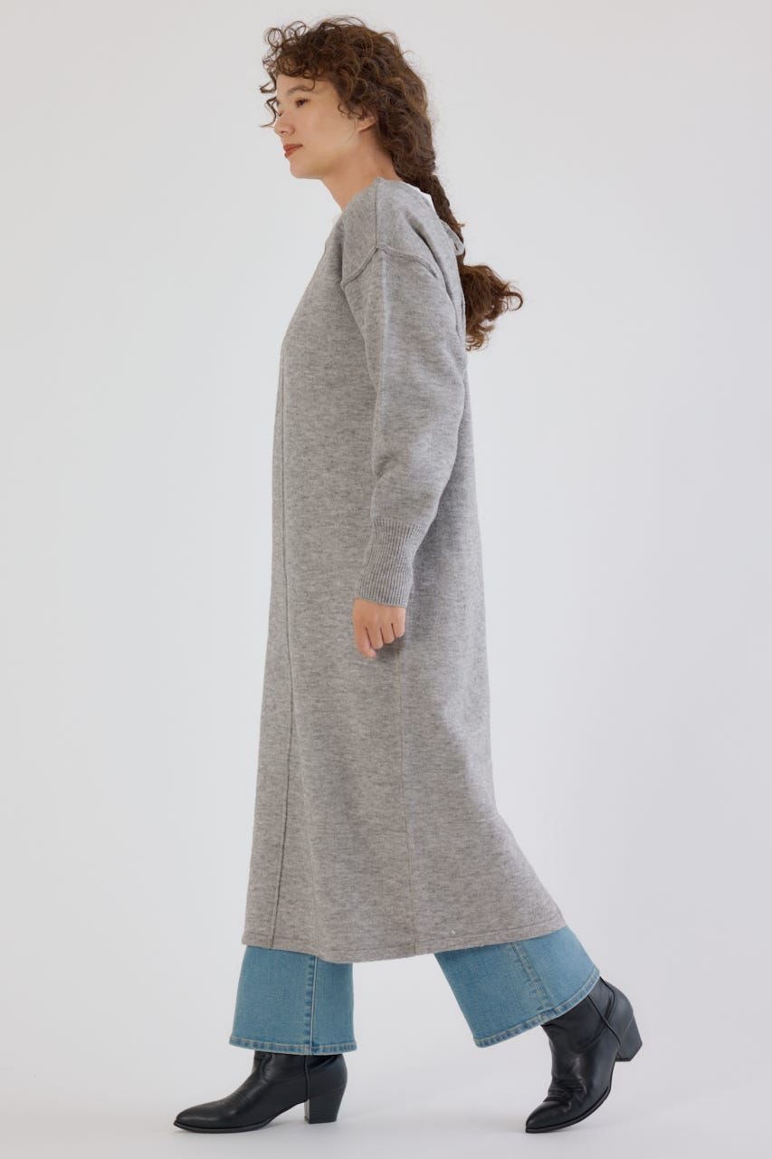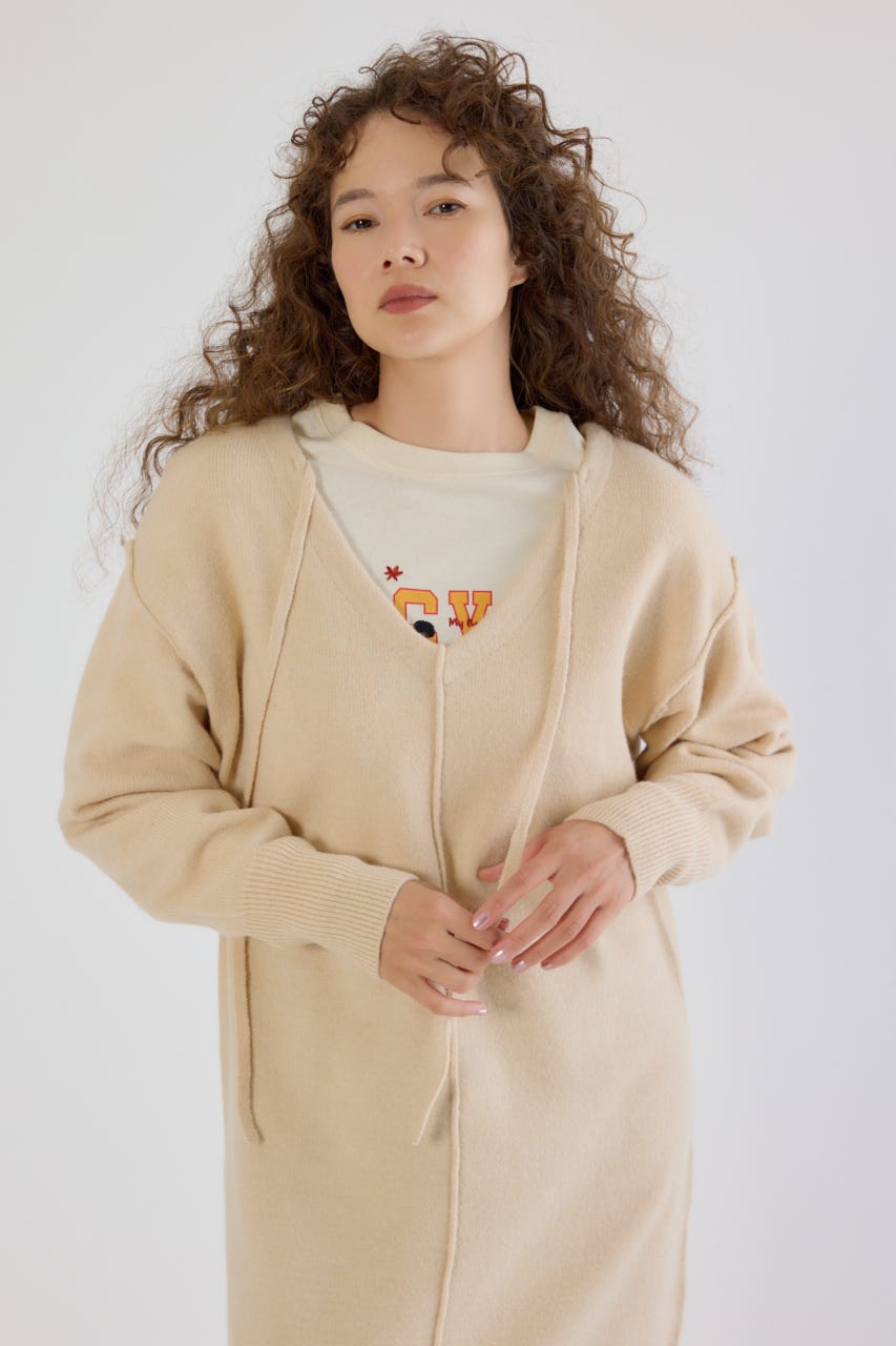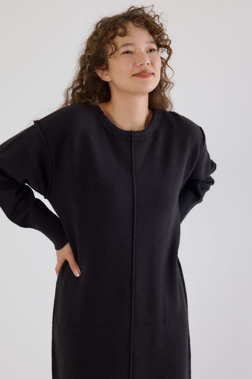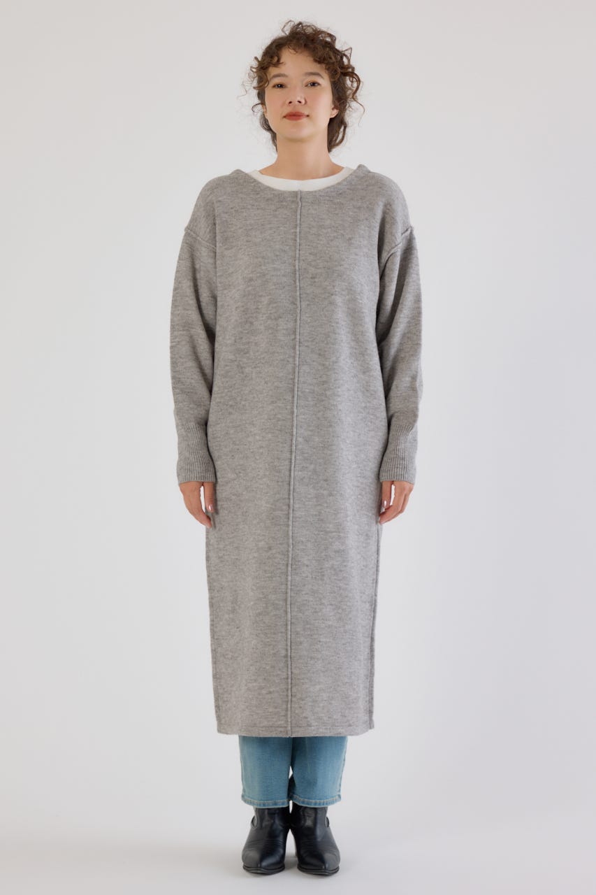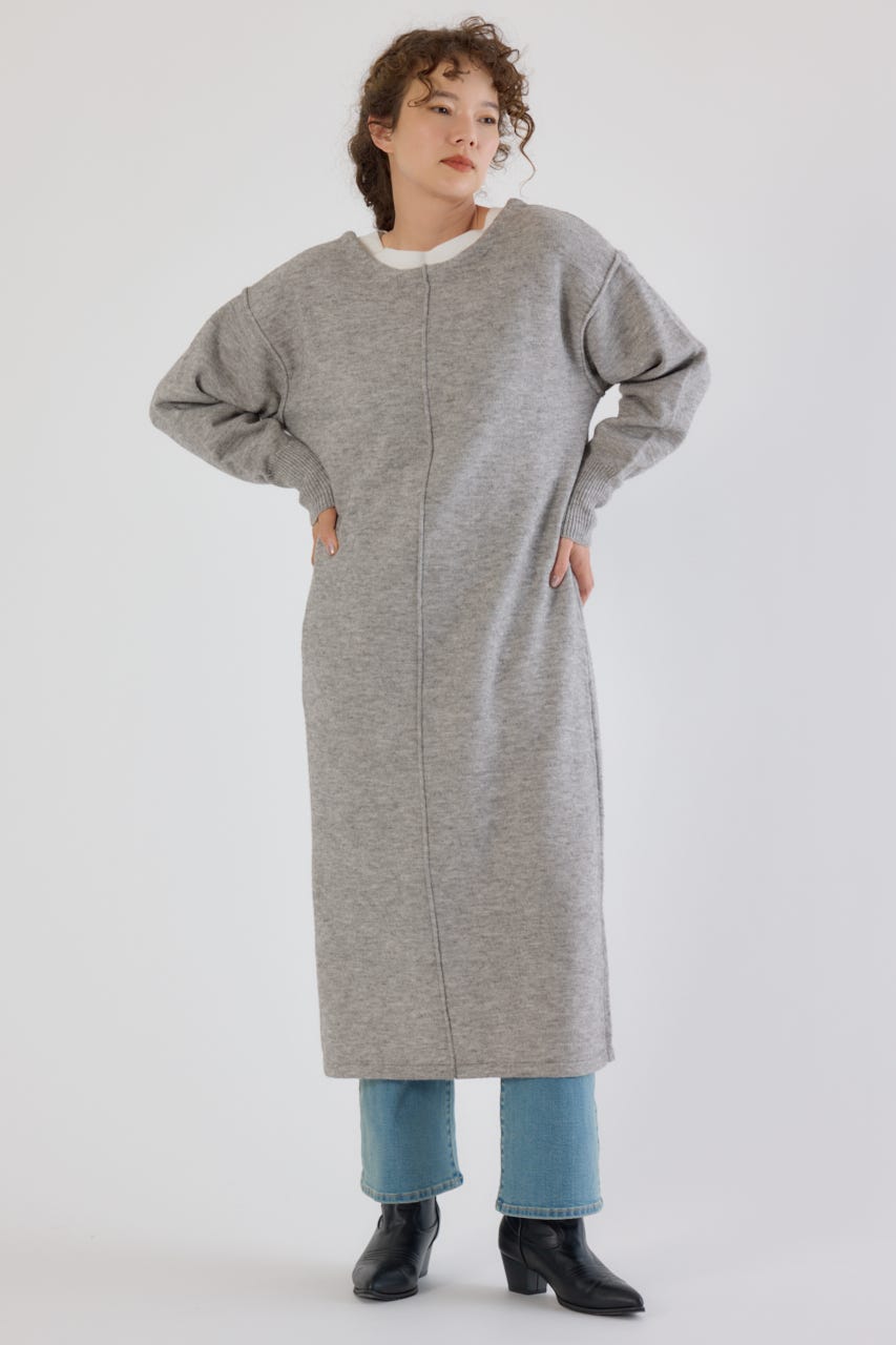Vネックとクルーネックの仕様になっており、前後2WAYで着まわせる大人ロングニットワンピース。
