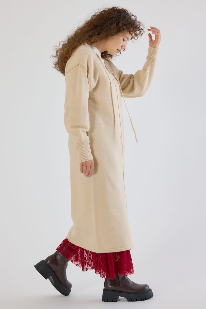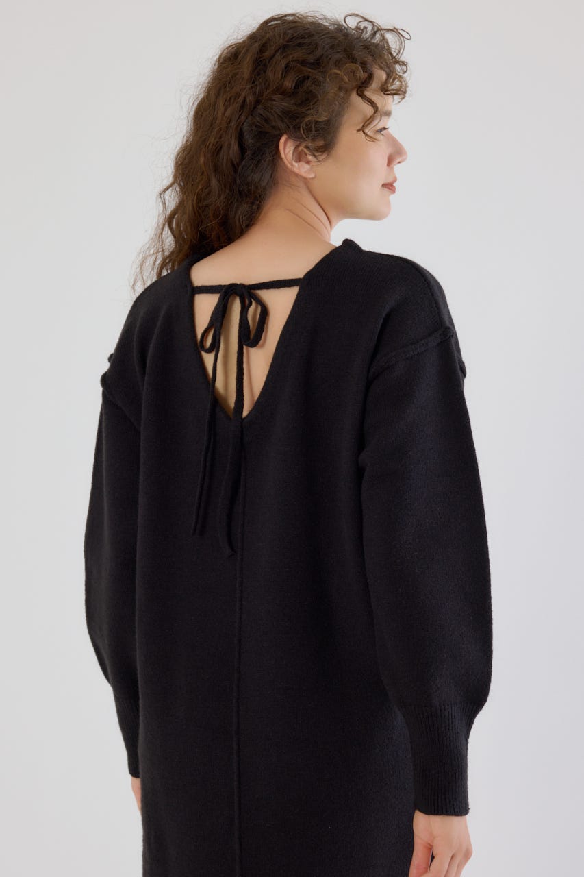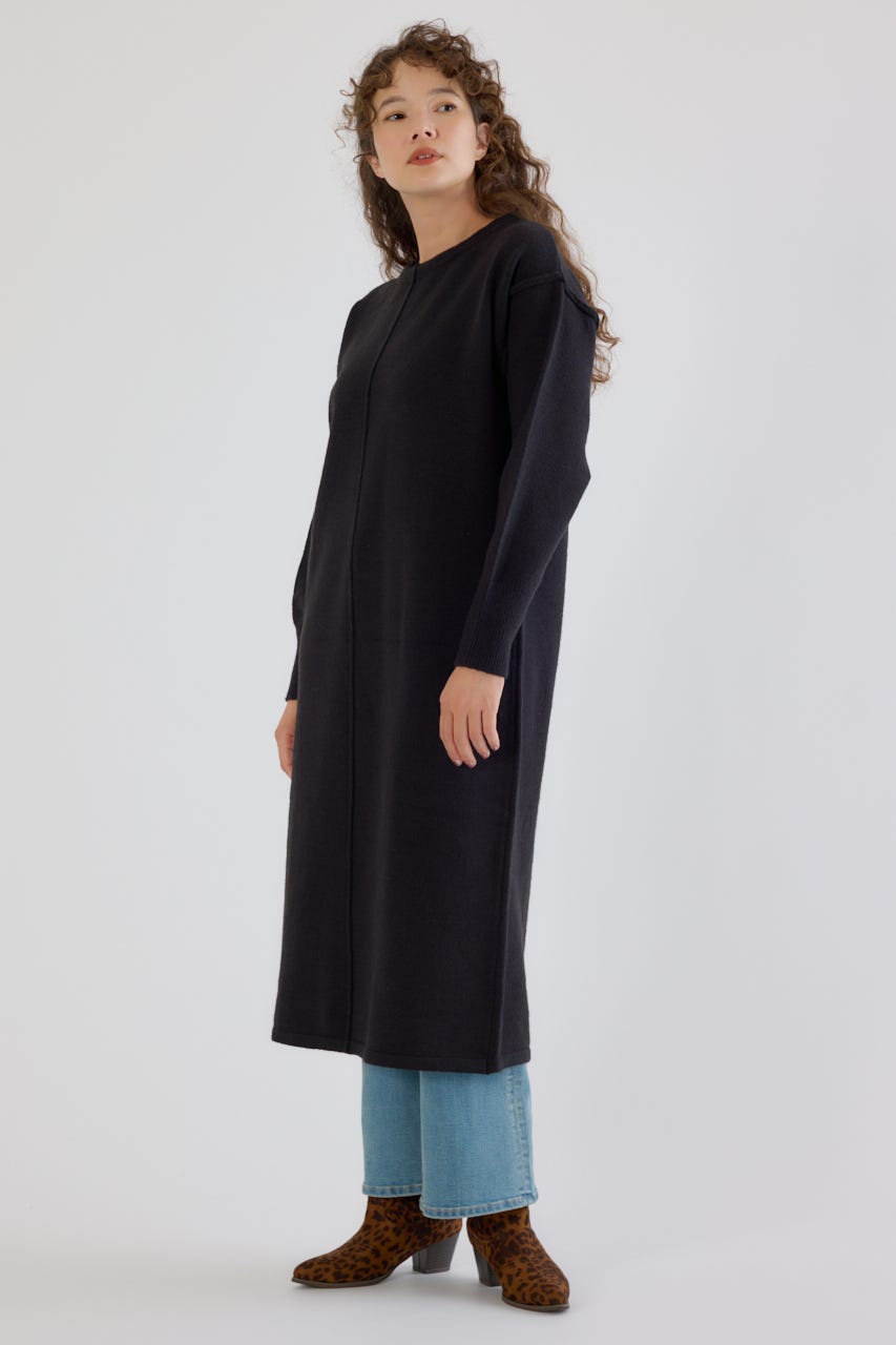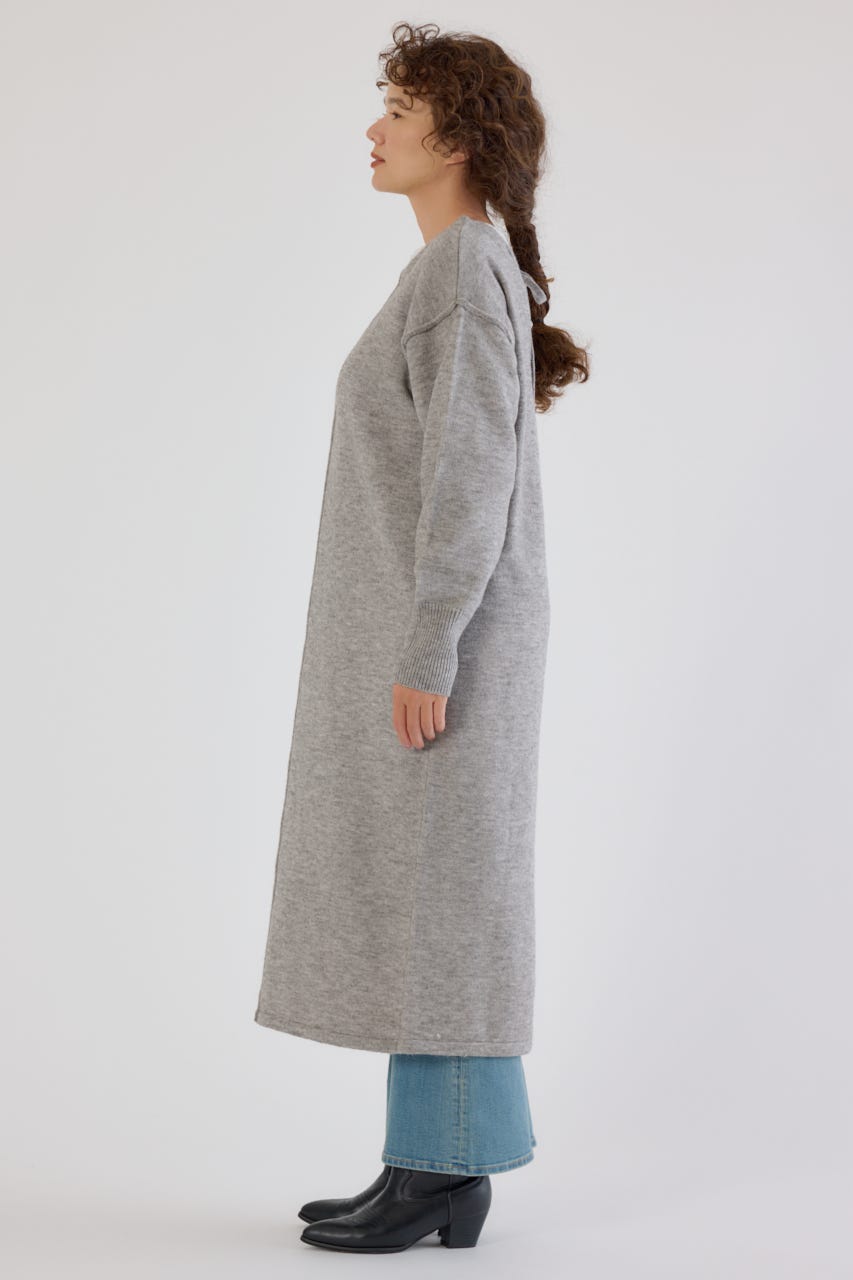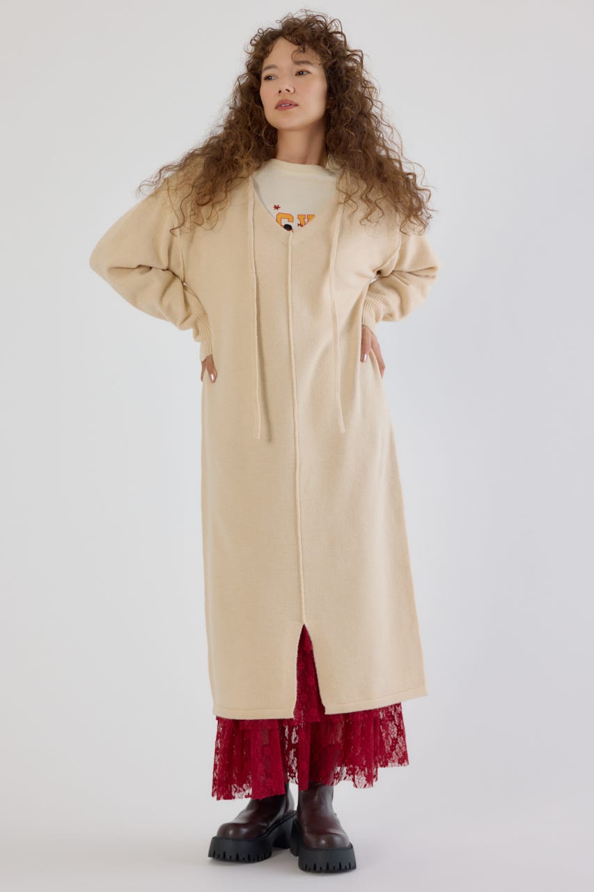 Vネックとクルーネックの仕様になっており、前後2WAYで着まわせる大人ロングニットワンピース。