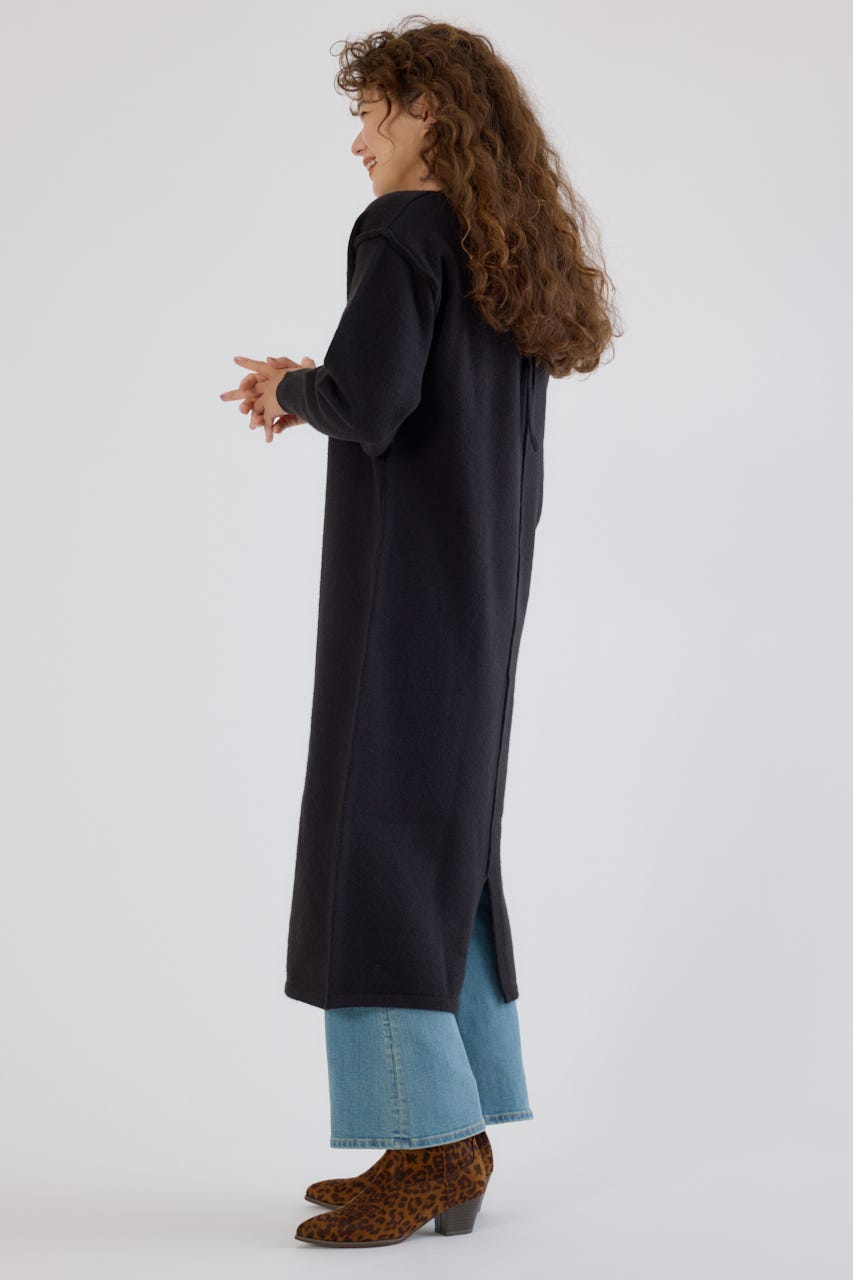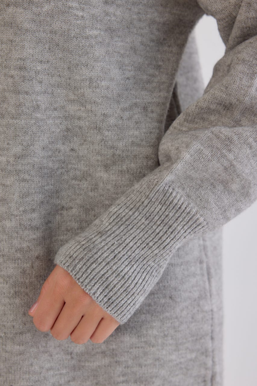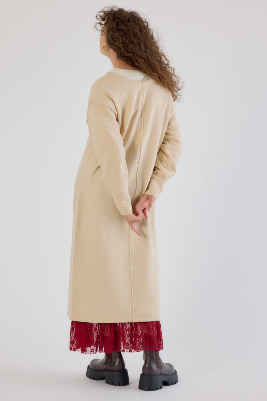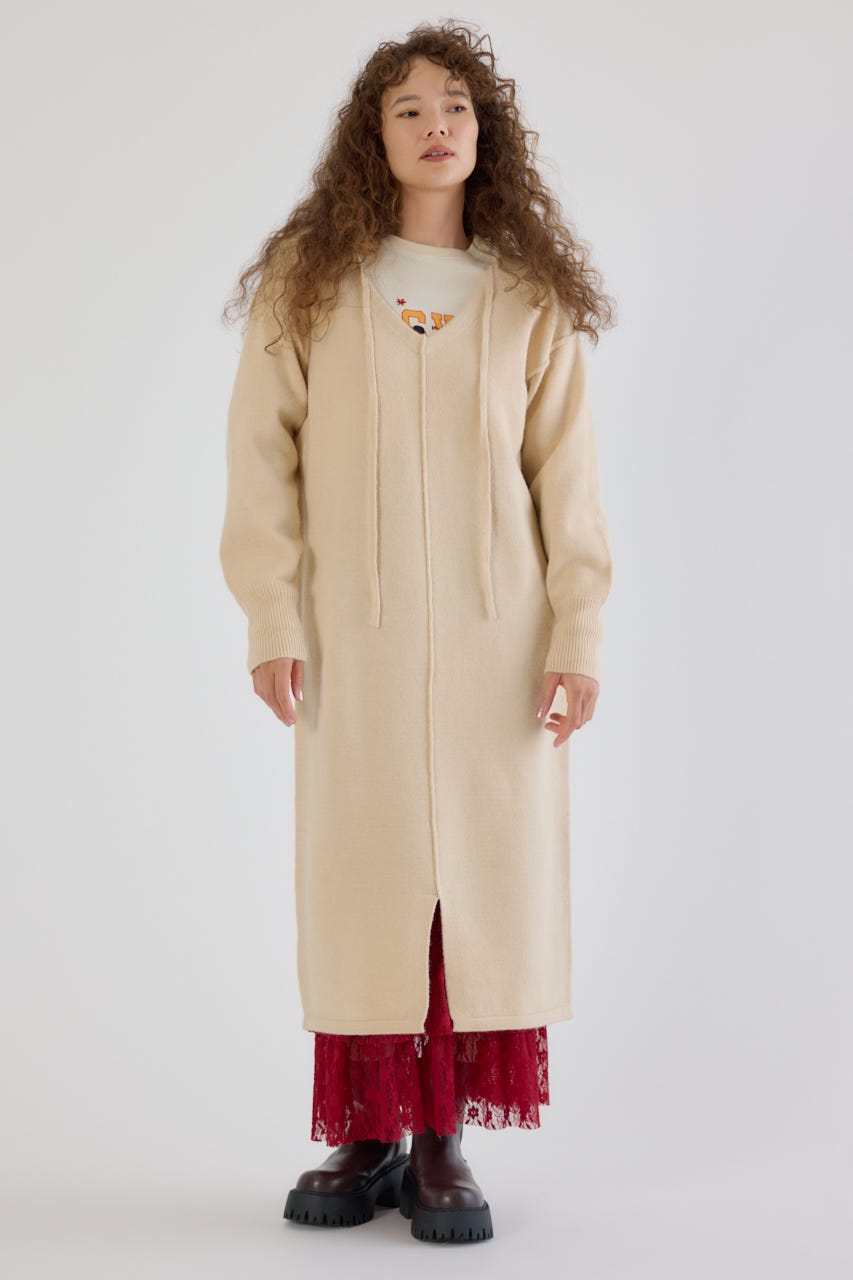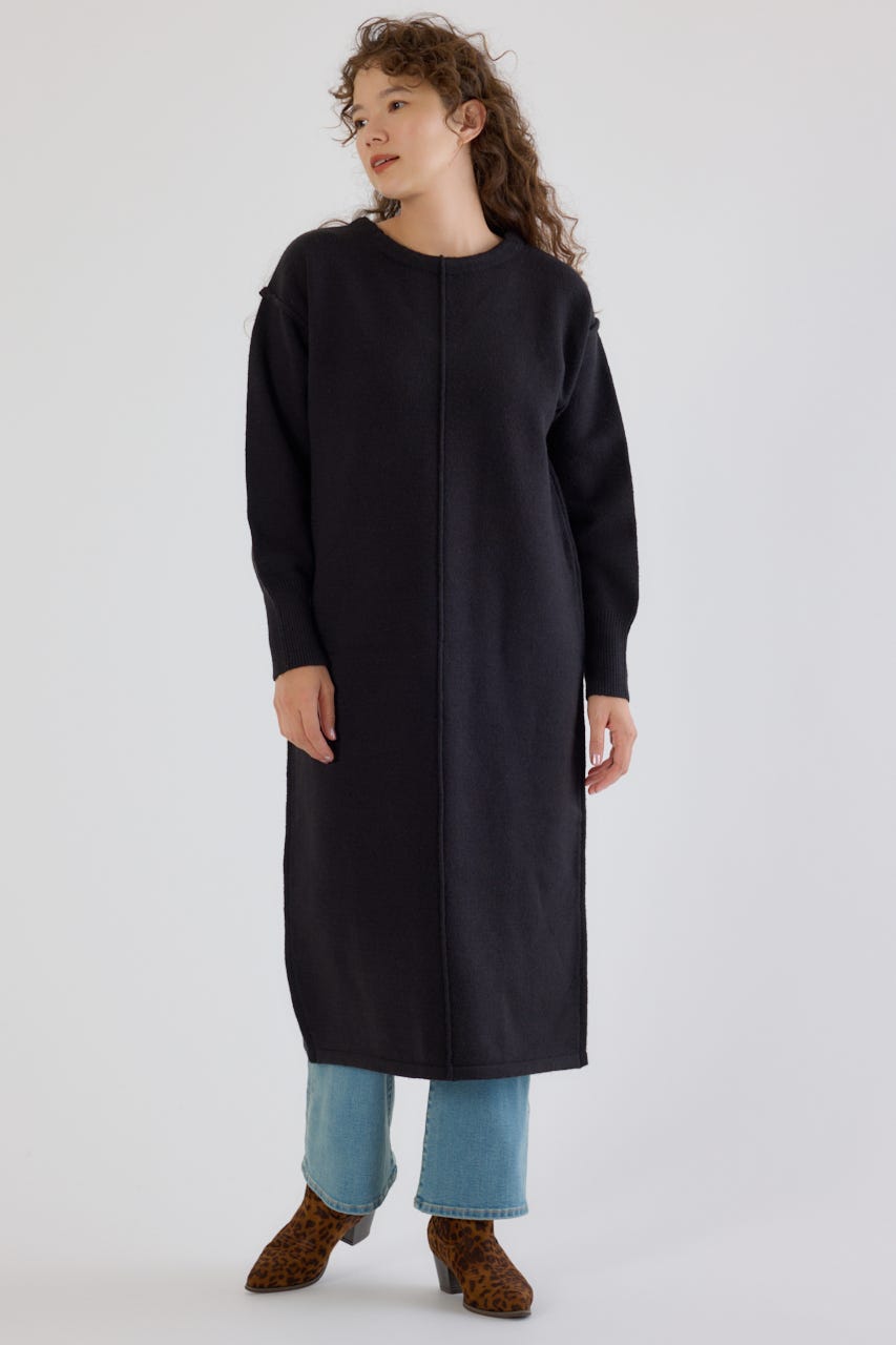 Vネックとクルーネックの仕様になっており、前後2WAYで着まわせる大人ロングニットワンピース。