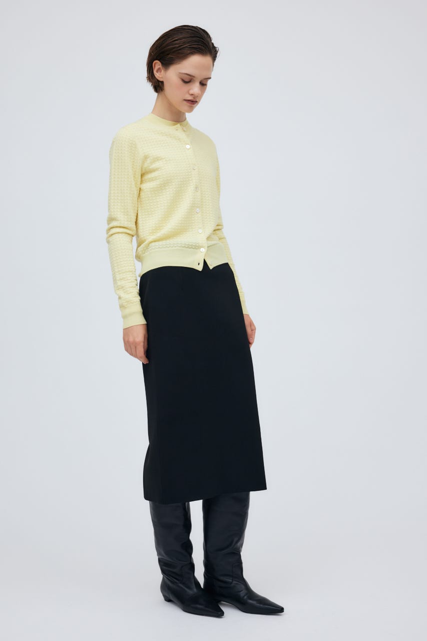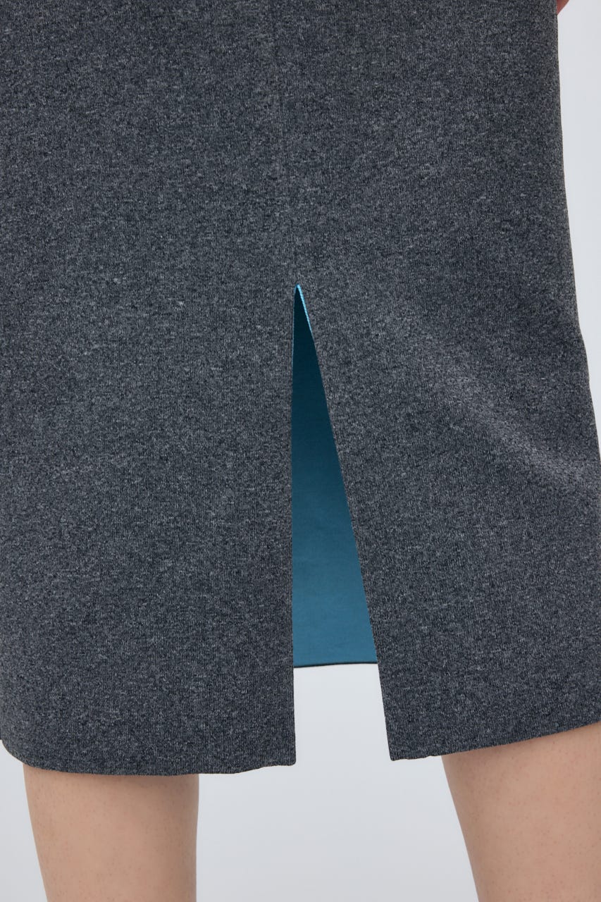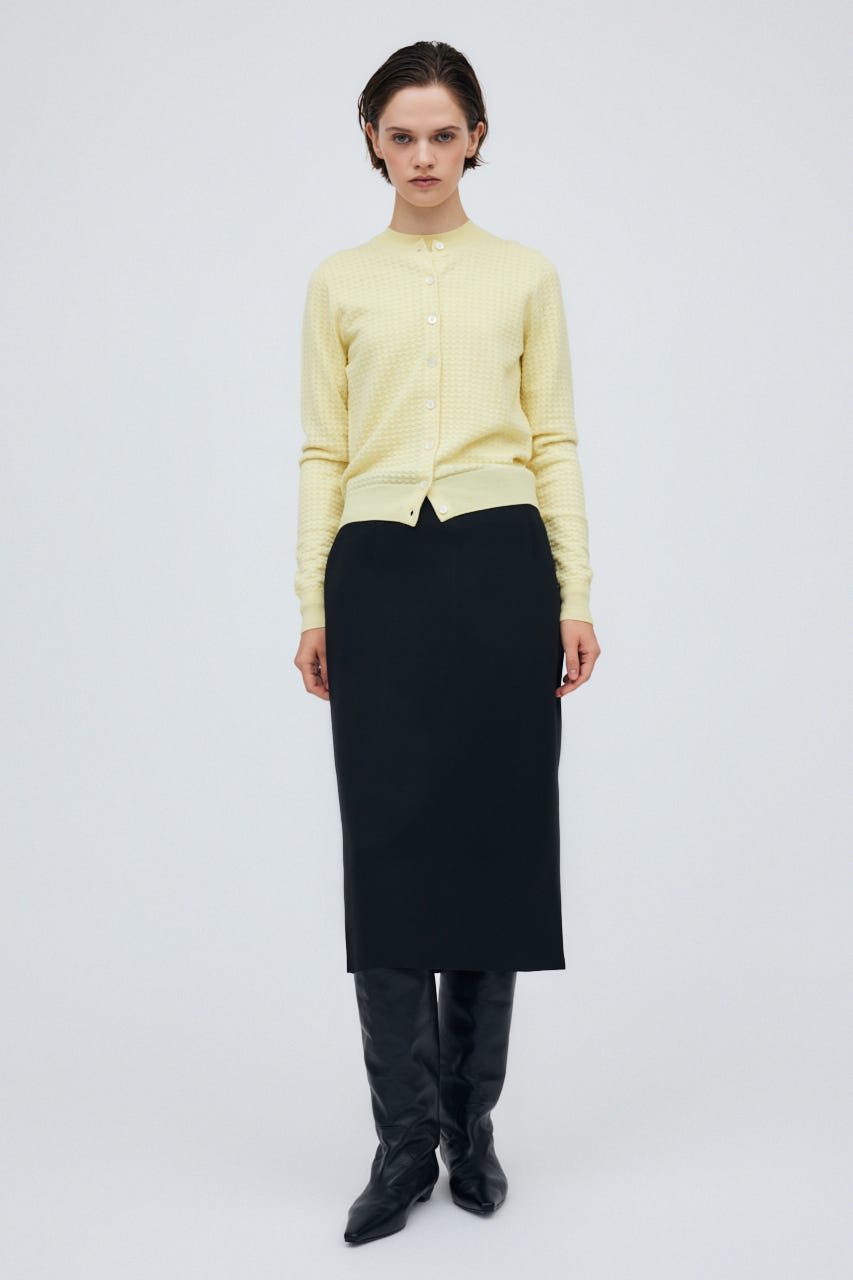 14Gで編み立てたダブルフェイスの適度な厚みが身体のラインを拾いにくくしてくれるのも嬉しいポイント。