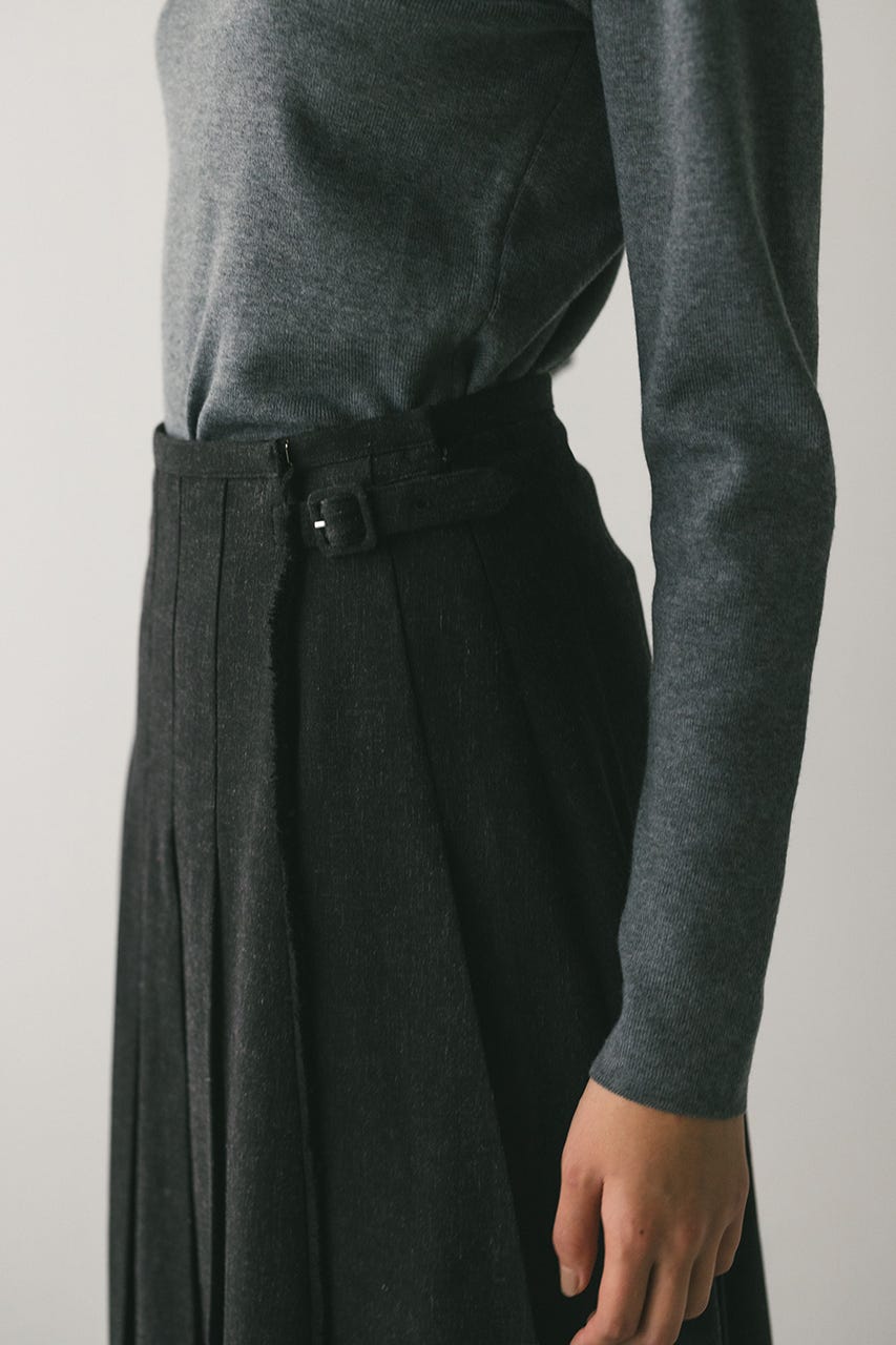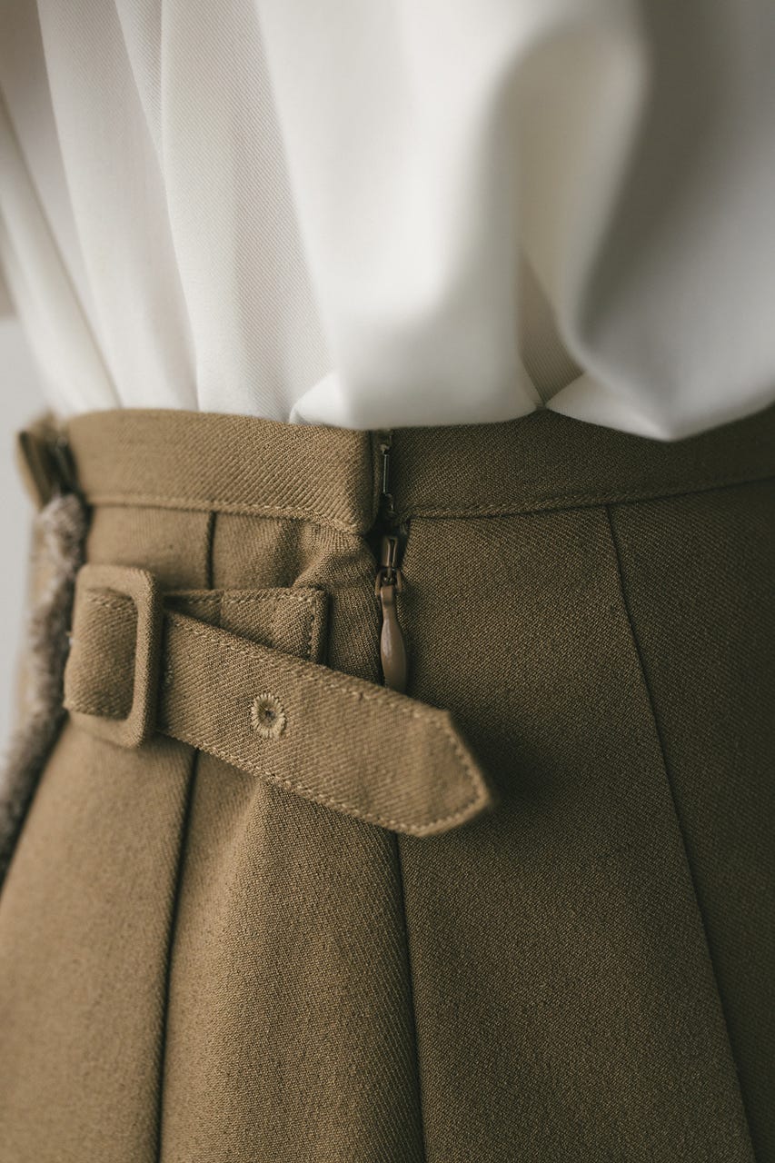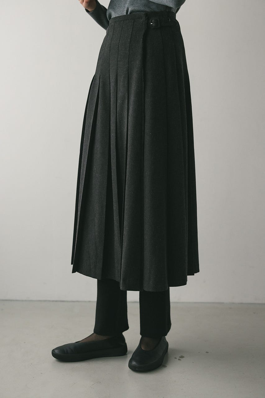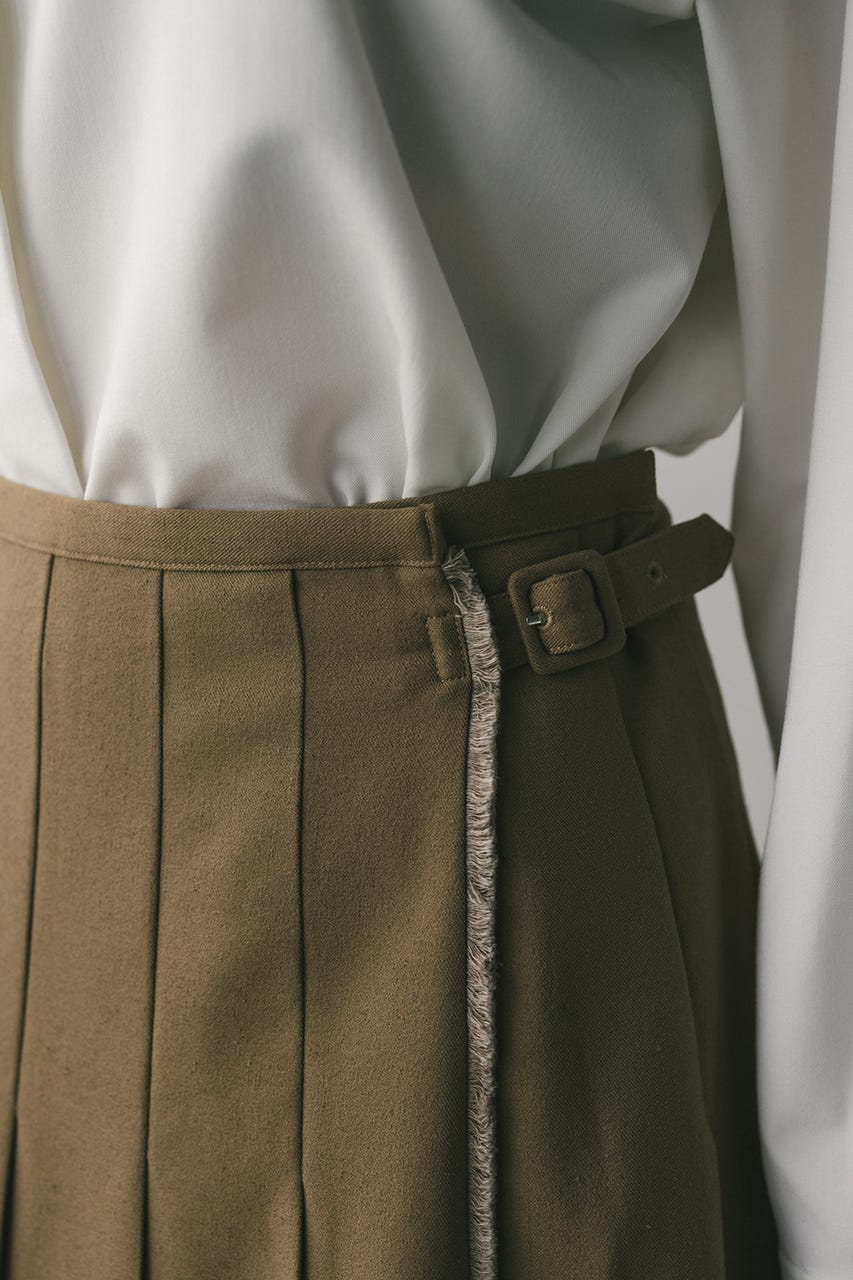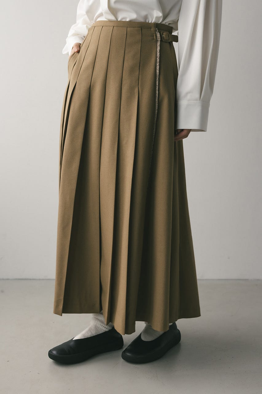 タックとベルトデザインでマニッシュな印象に導くラップスカート。