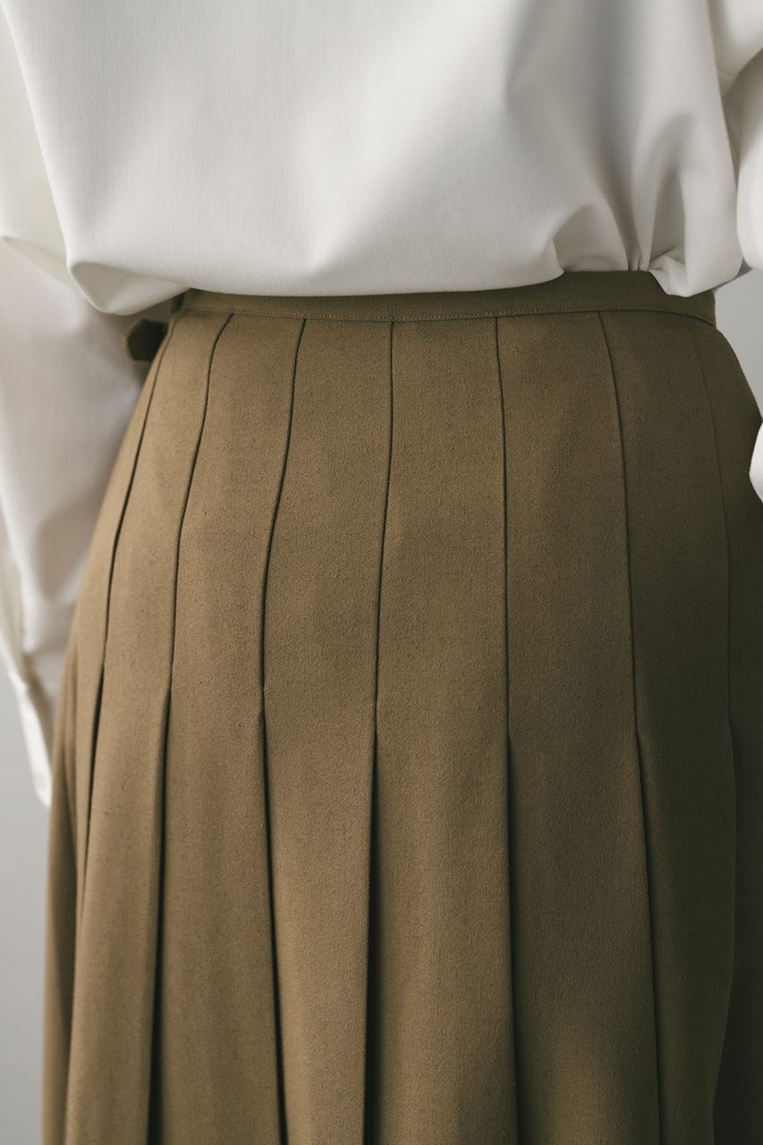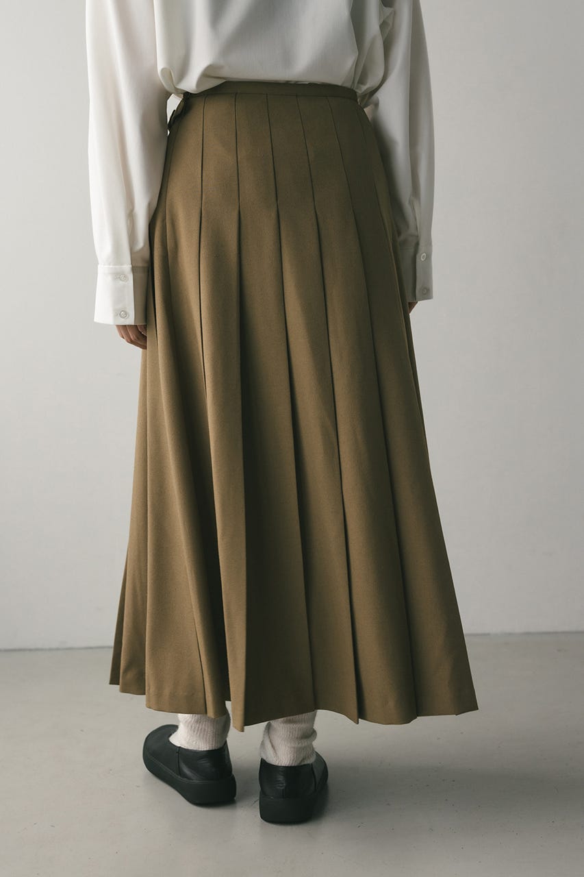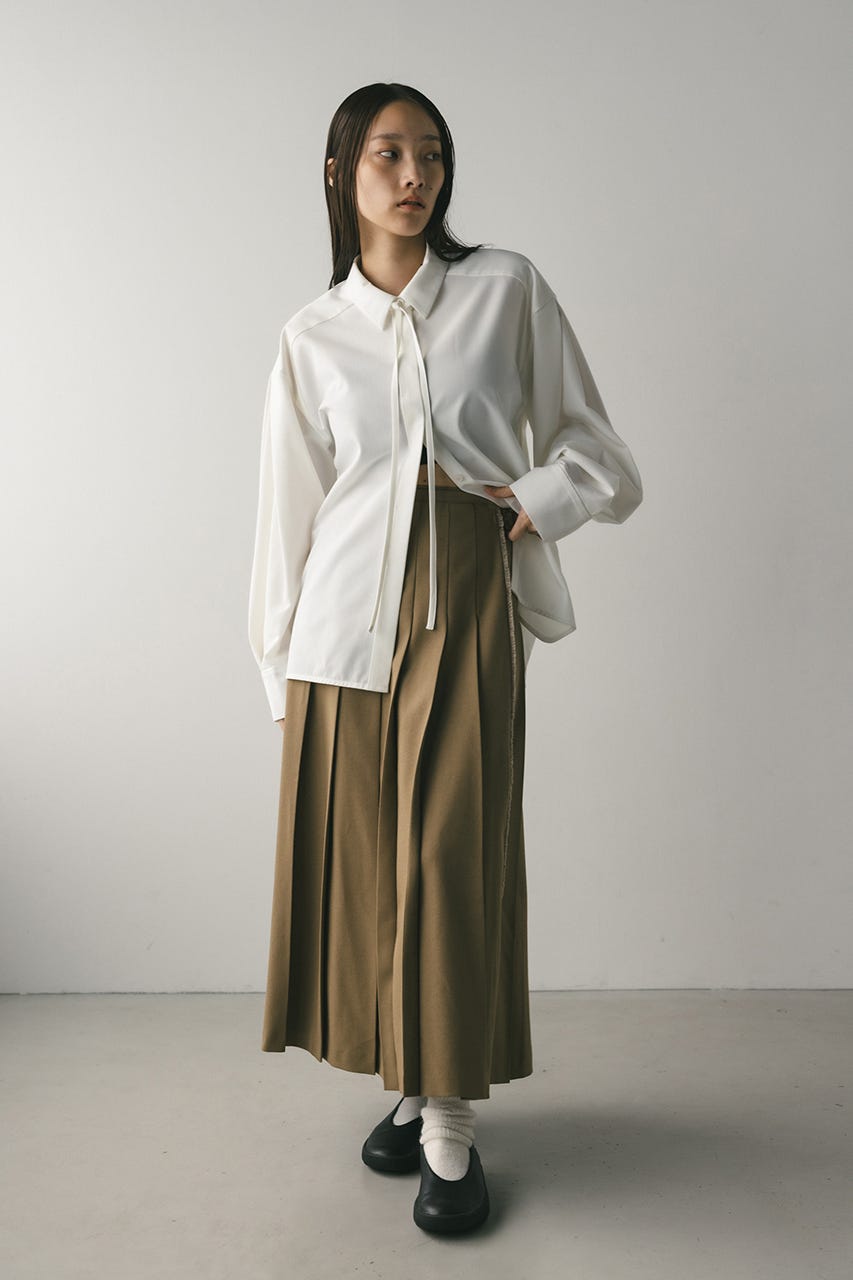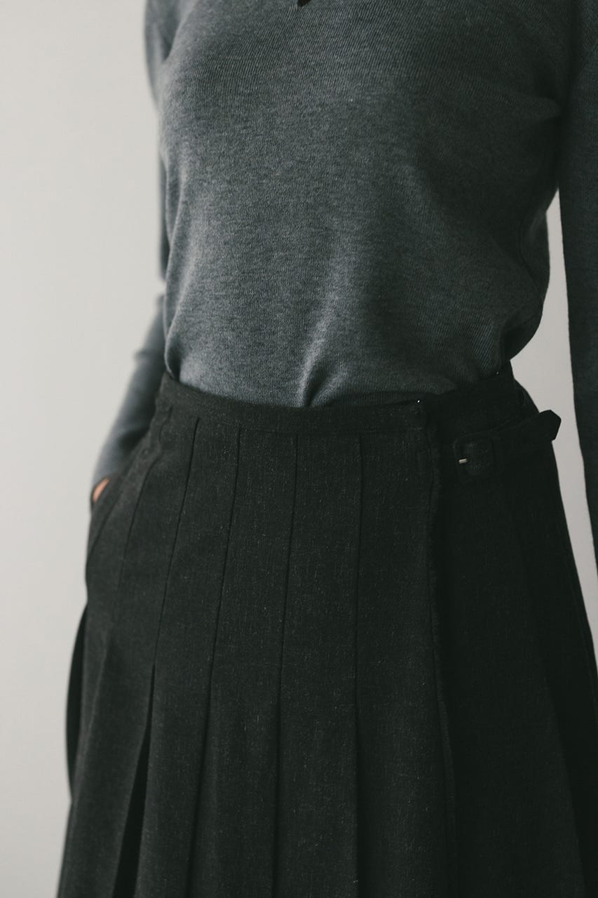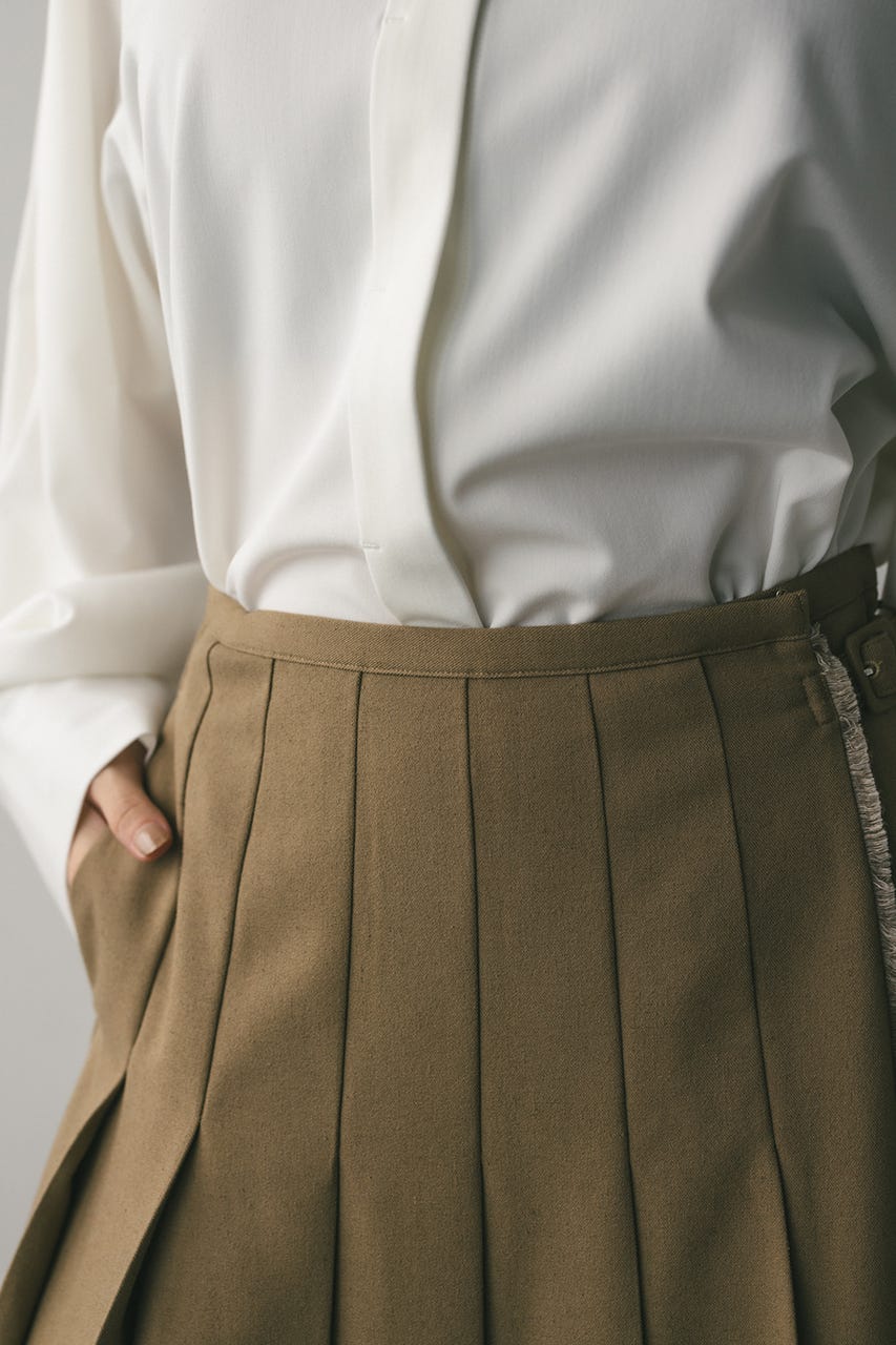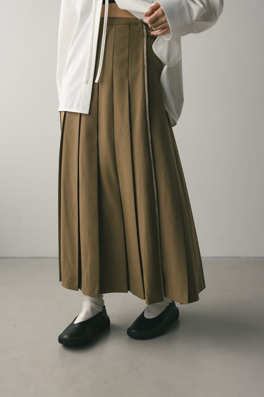 タックとベルトデザインでマニッシュな印象に導くラップスカート。