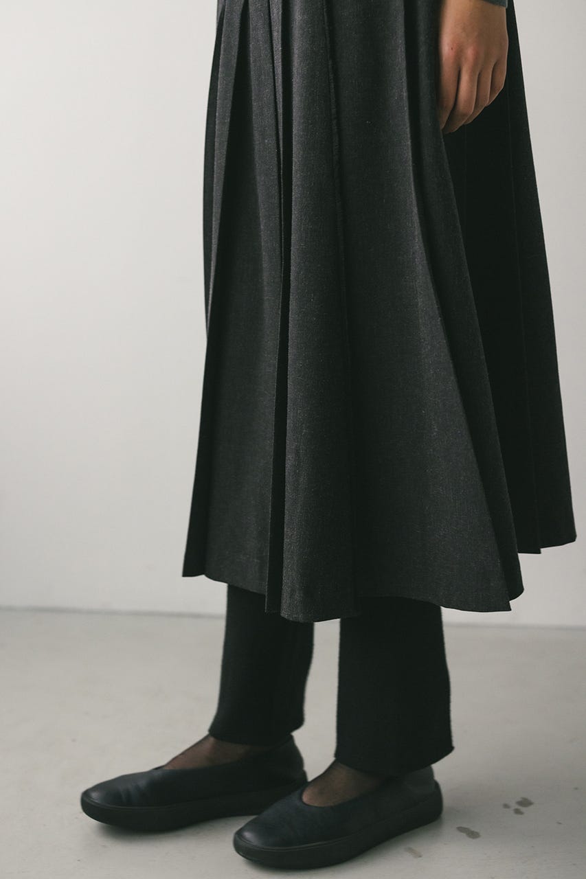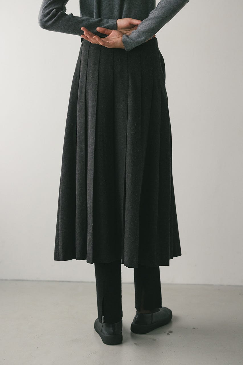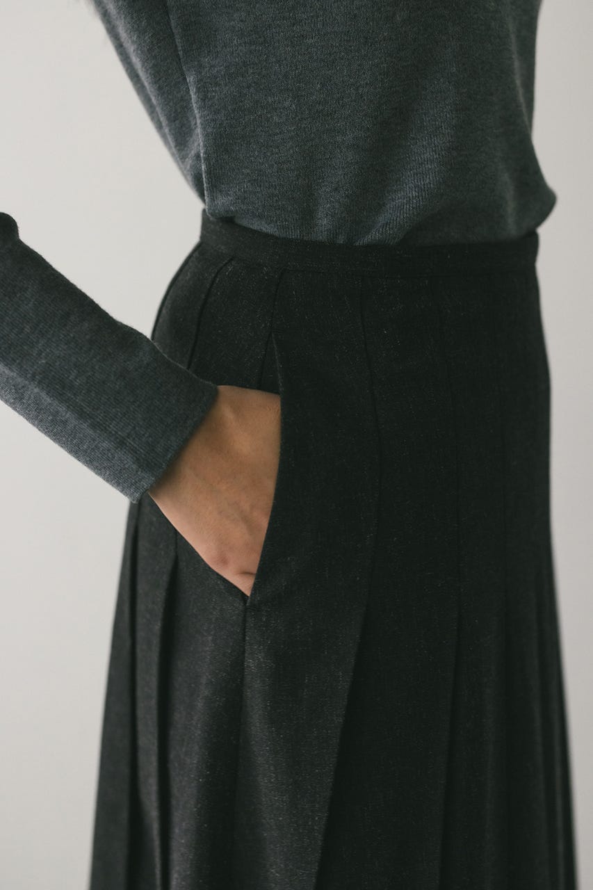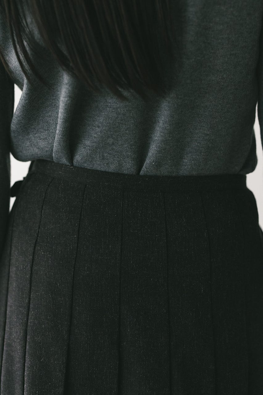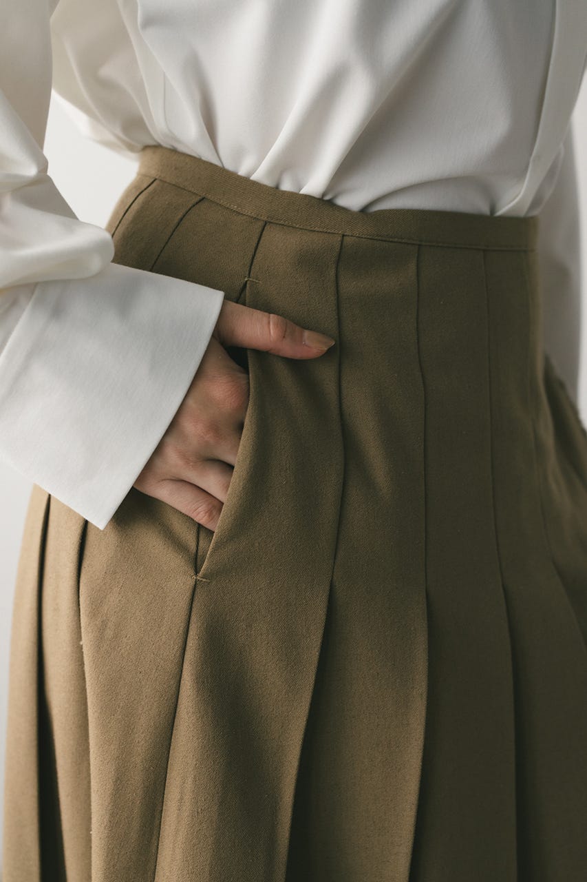 タックとベルトデザインでマニッシュな印象に導くラップスカート。