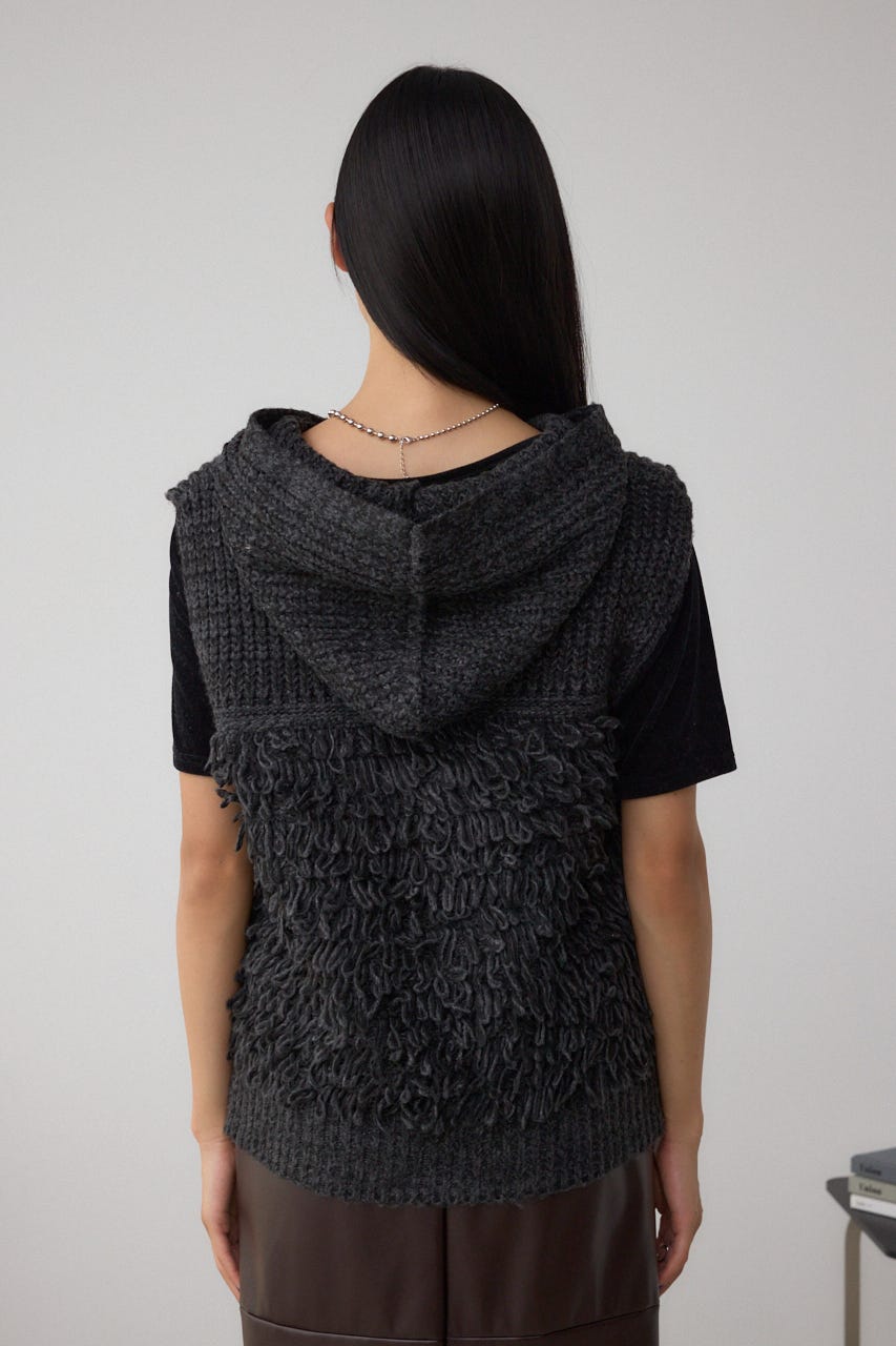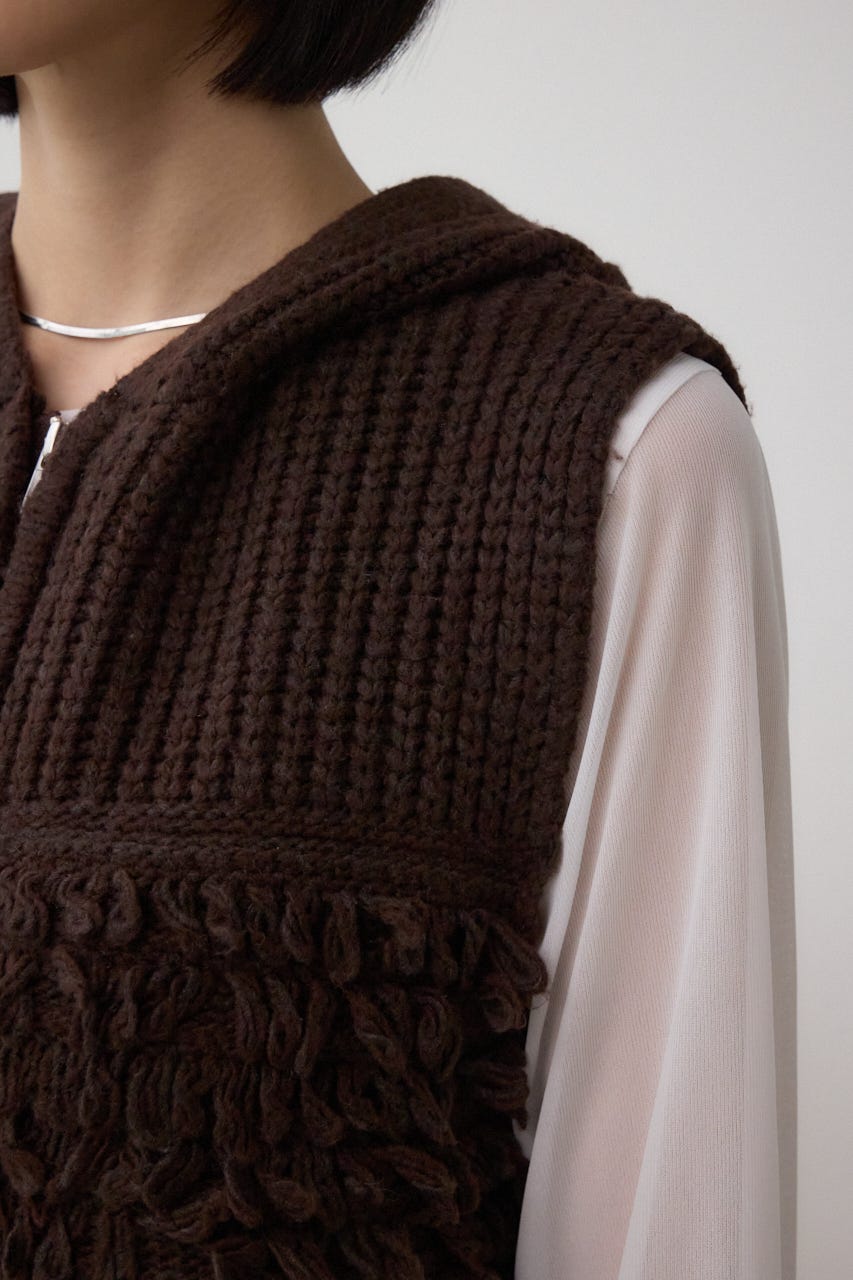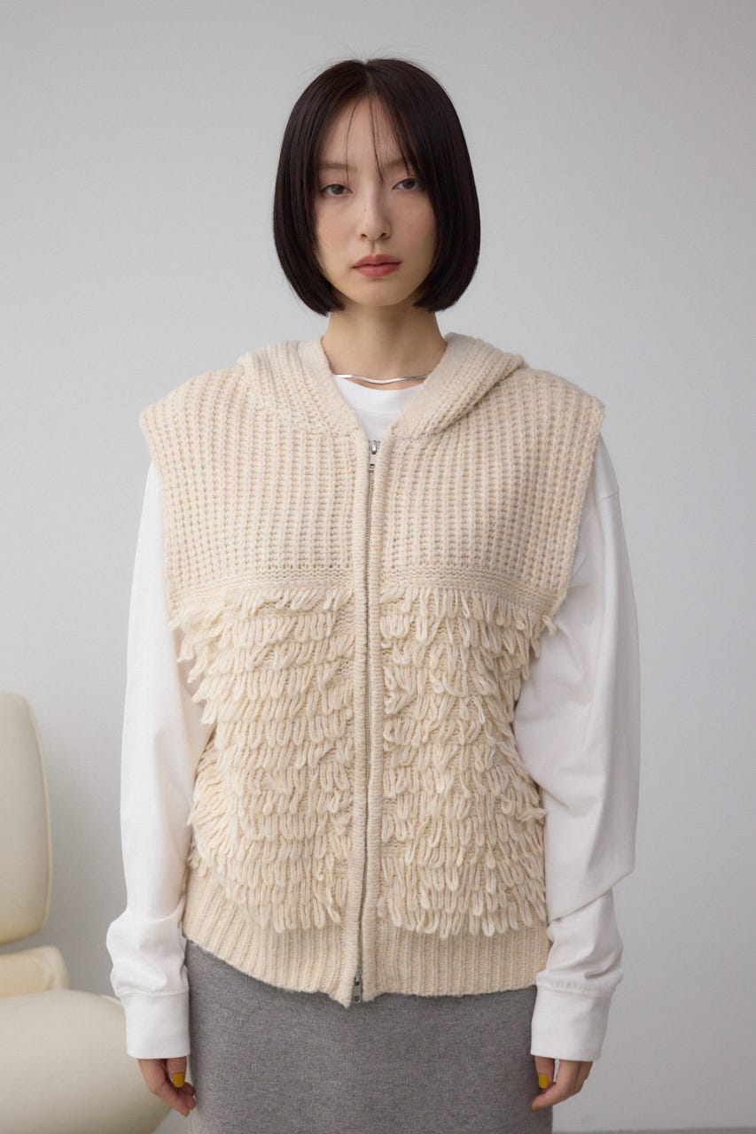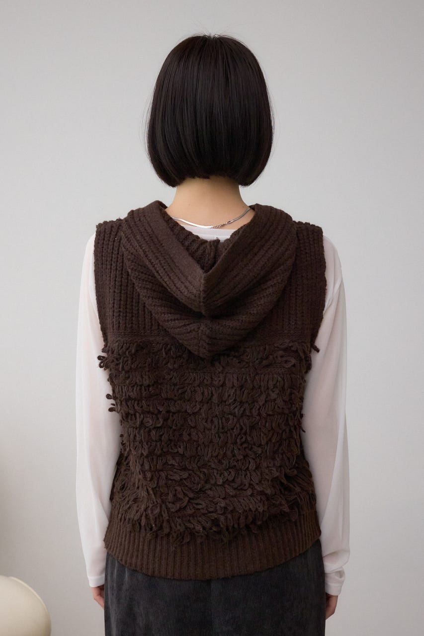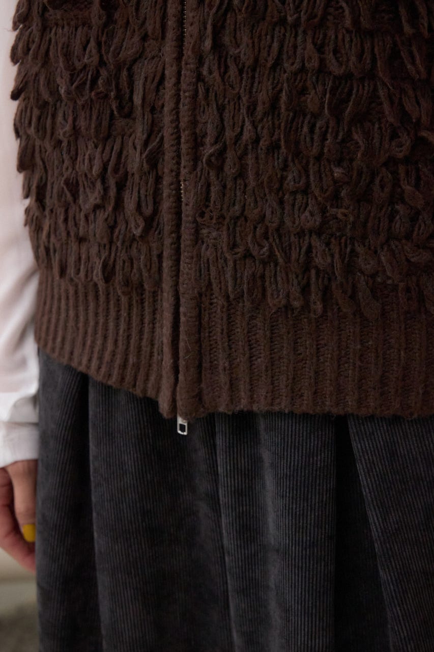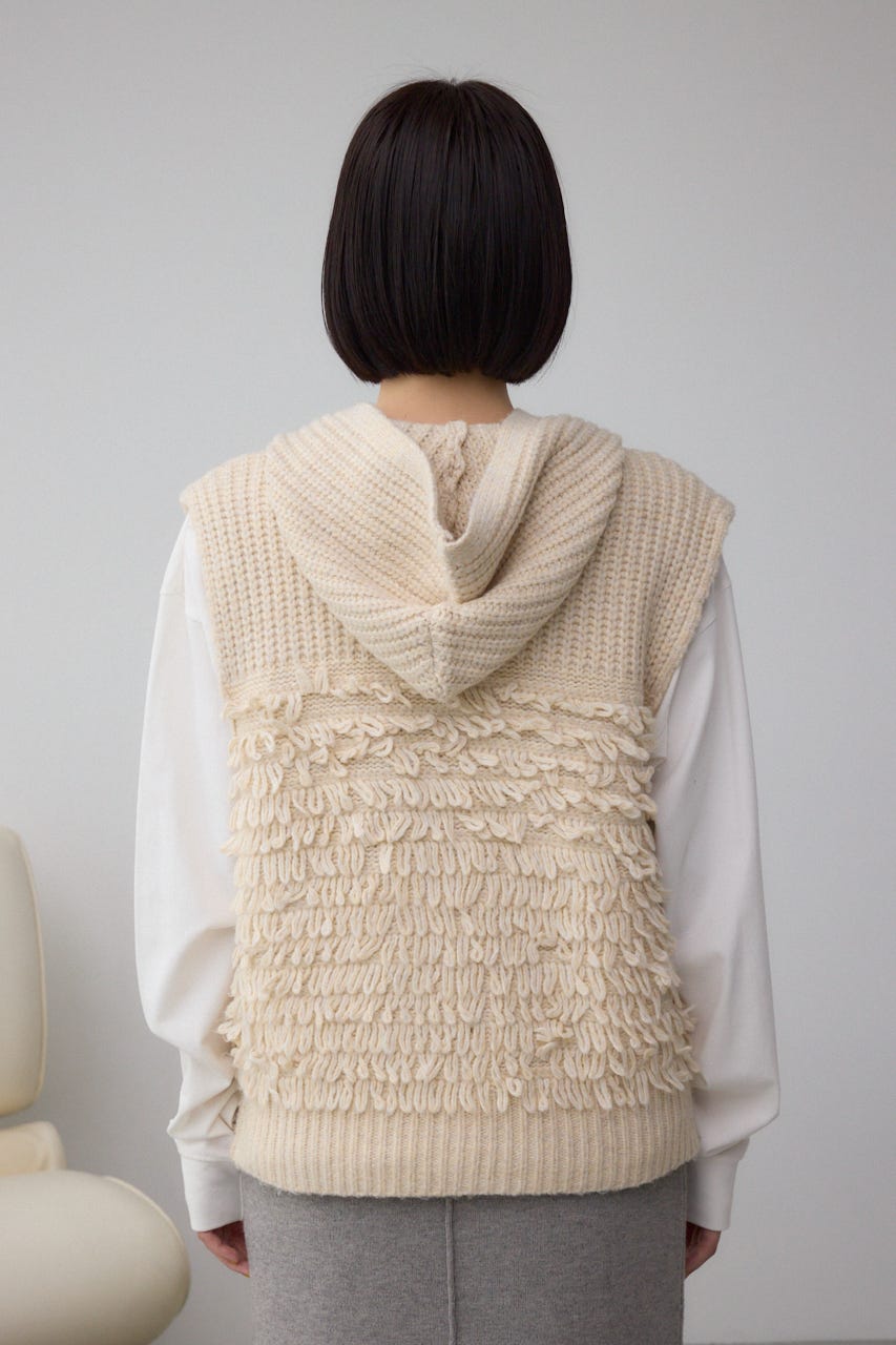 微配色の糸をループに編み立てた、表情のある編地が特徴のニットベスト。