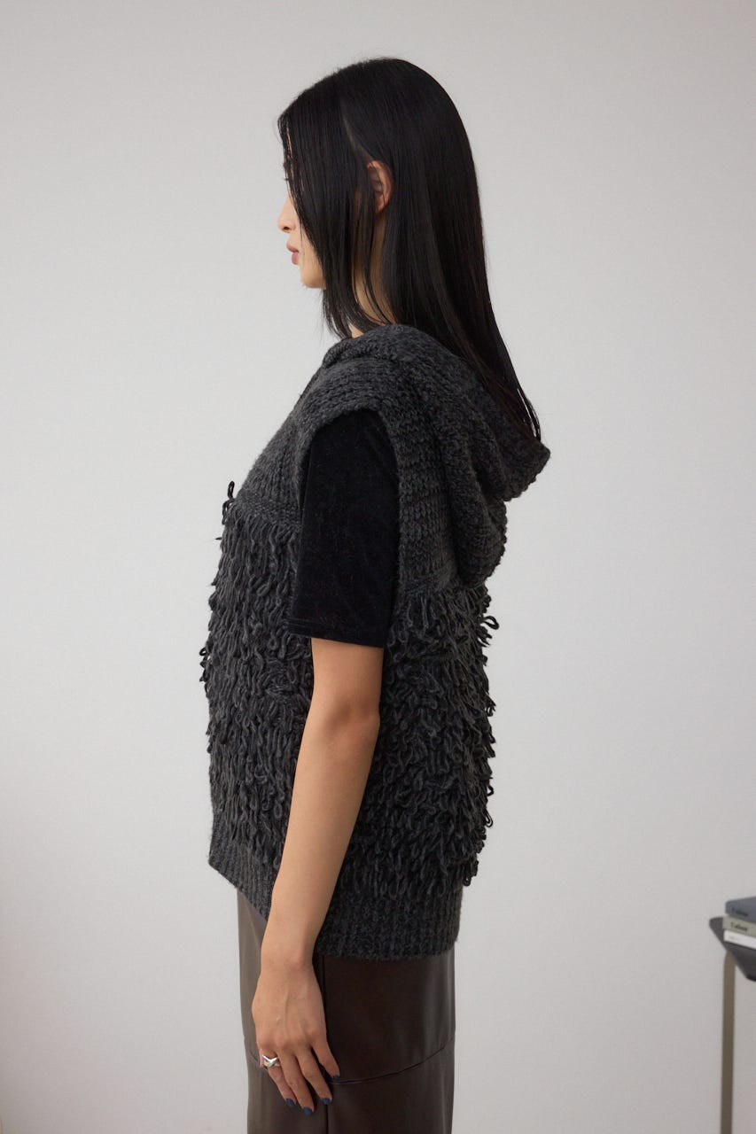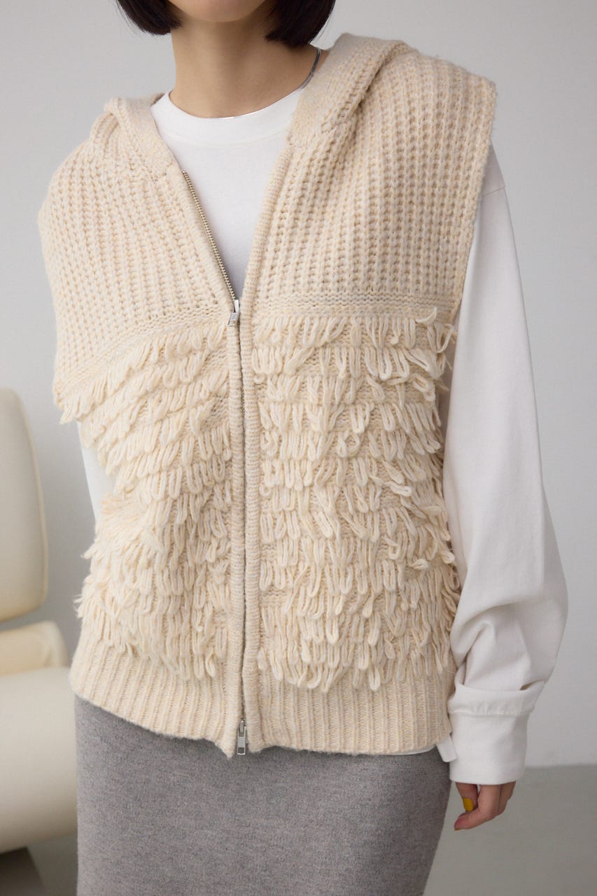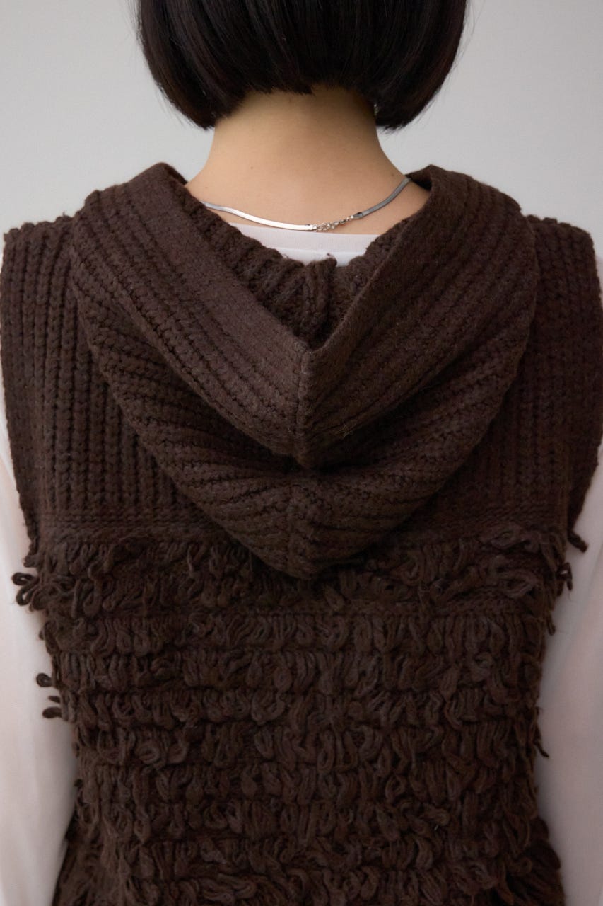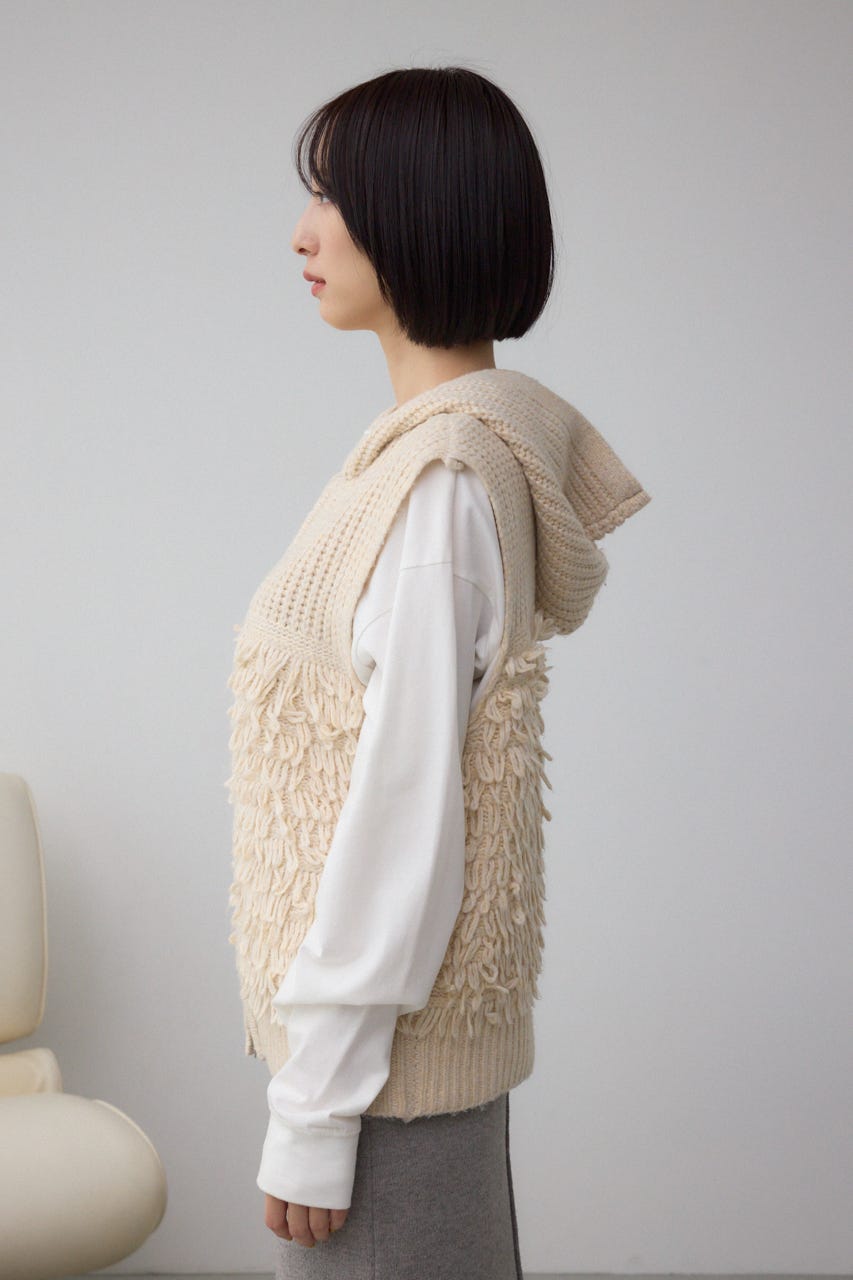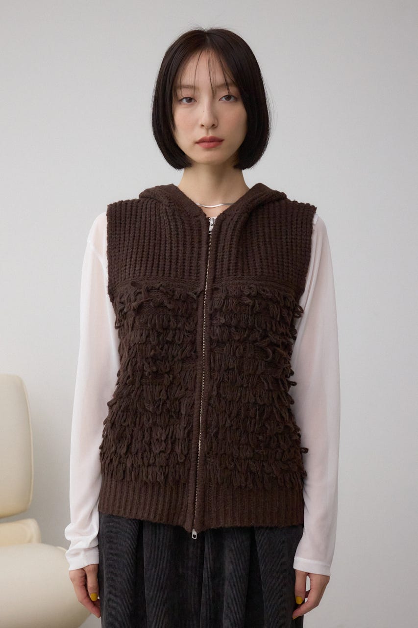 微配色の糸をループに編み立てた、表情のある編地が特徴のニットベスト。