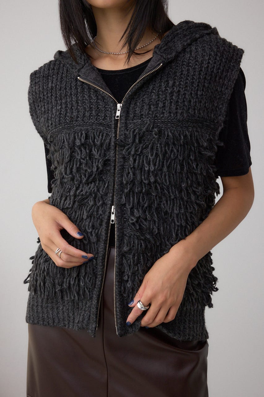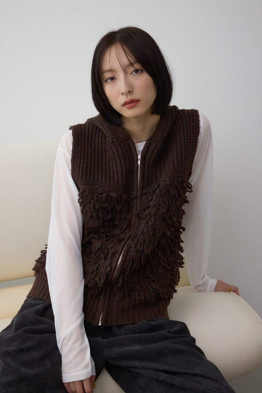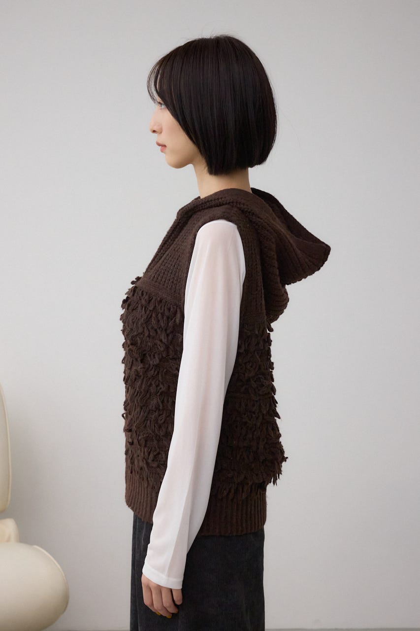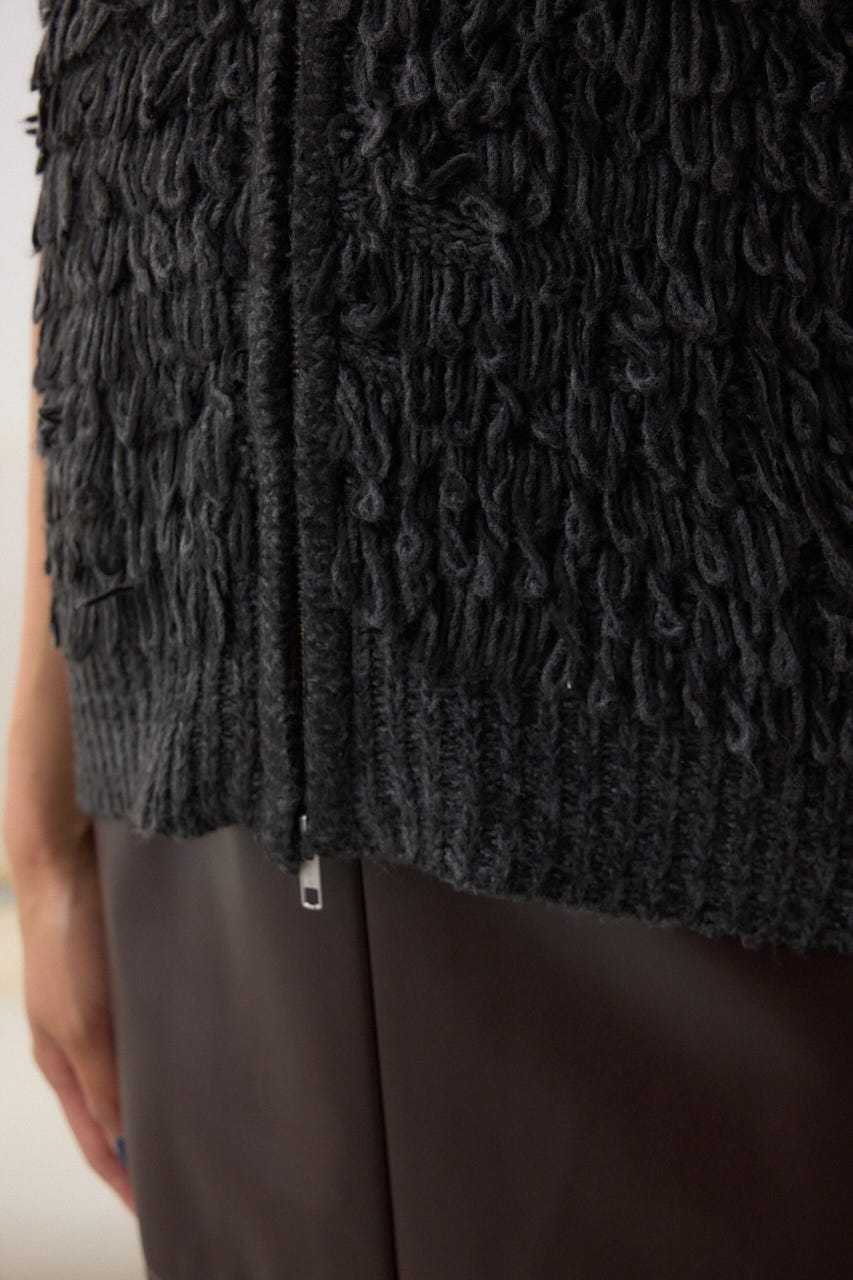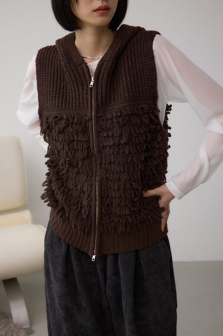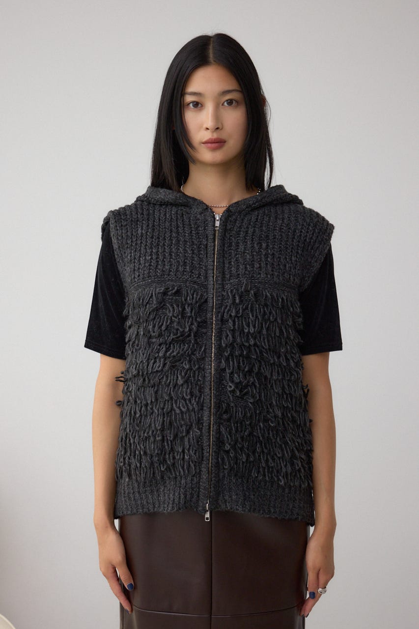 微配色の糸をループに編み立てた、表情のある編地が特徴のニットベスト。