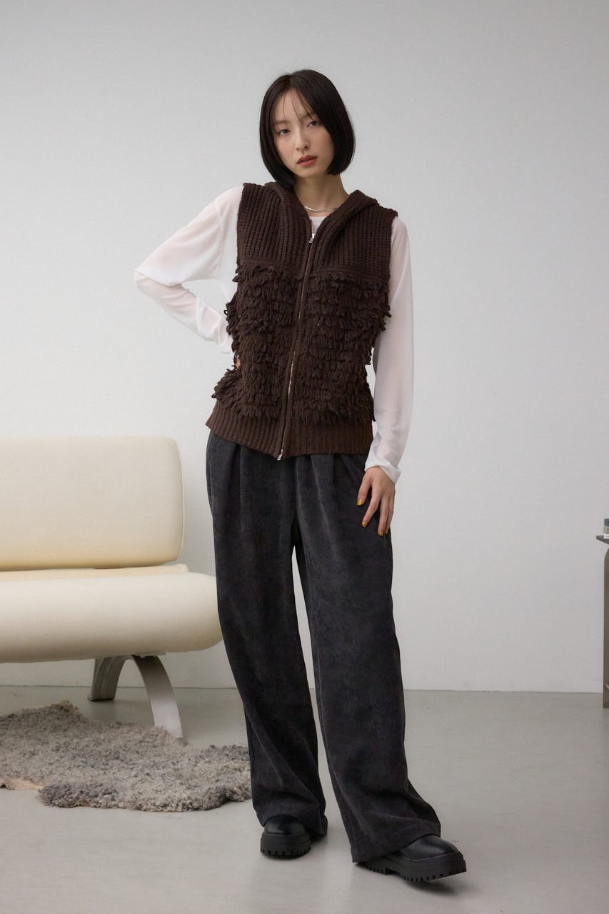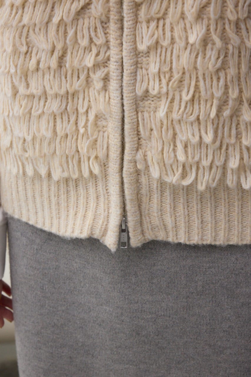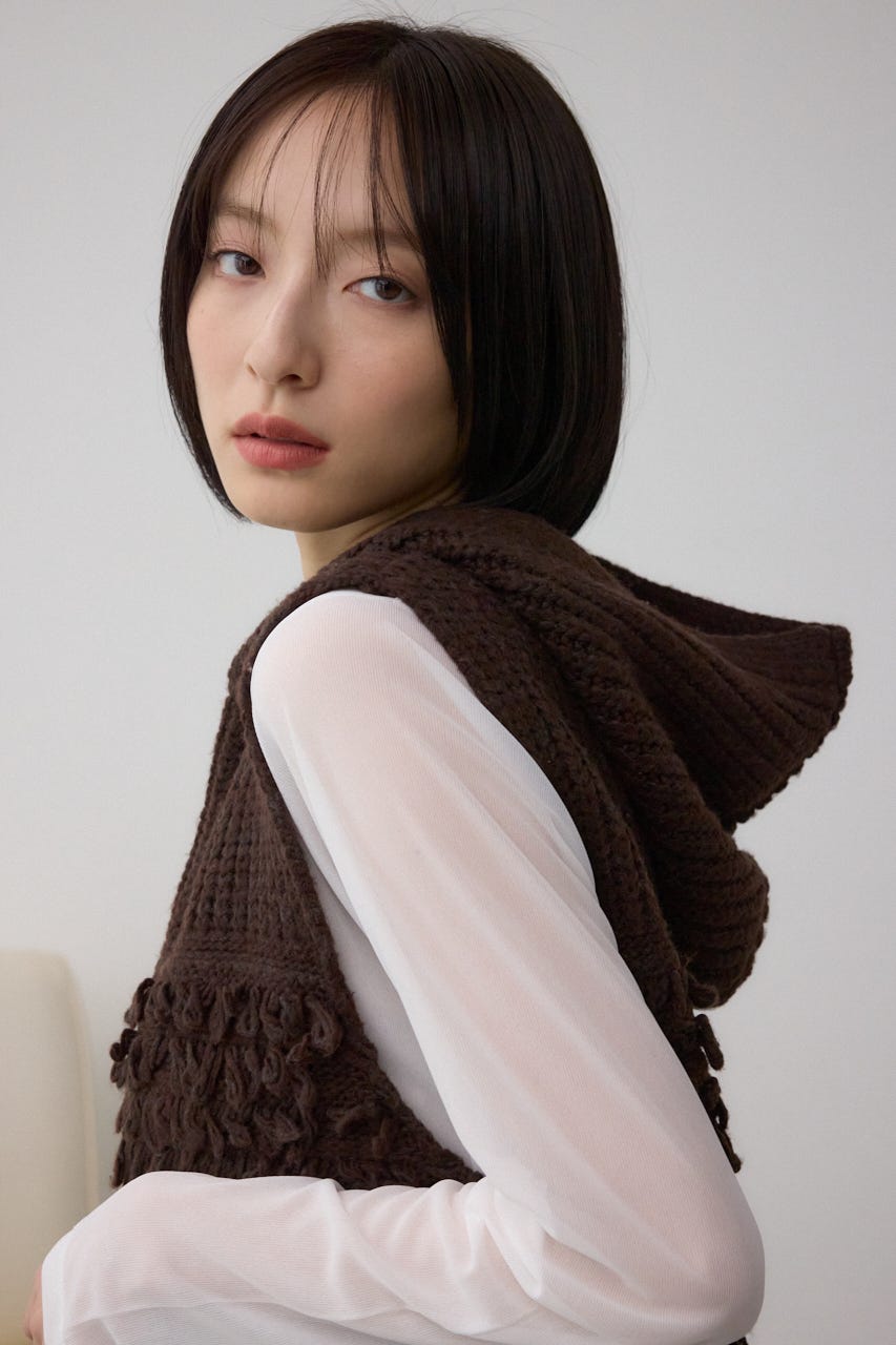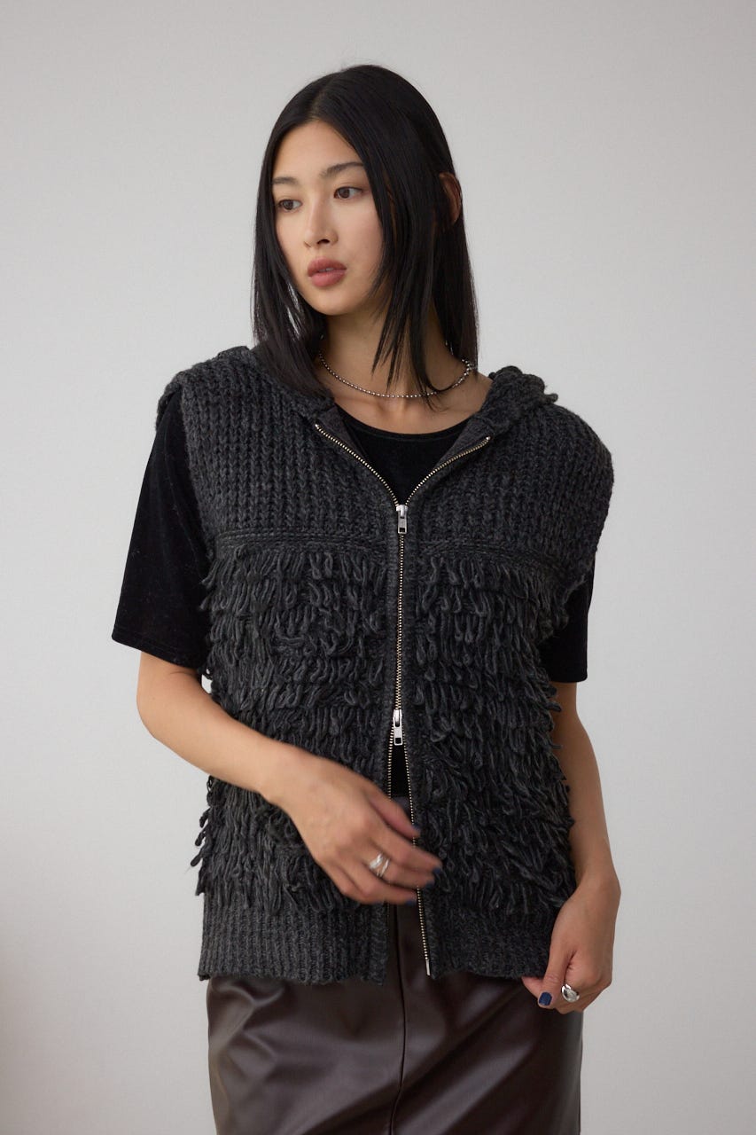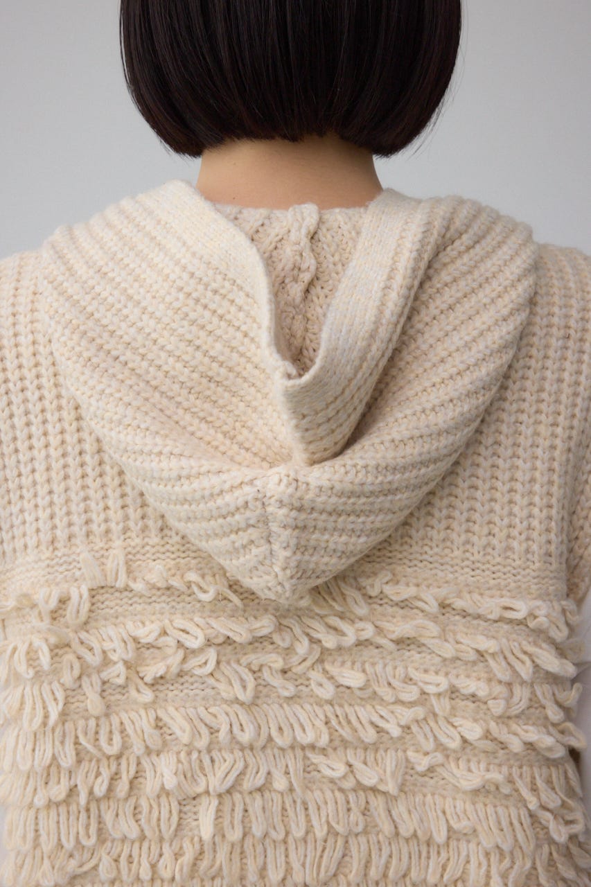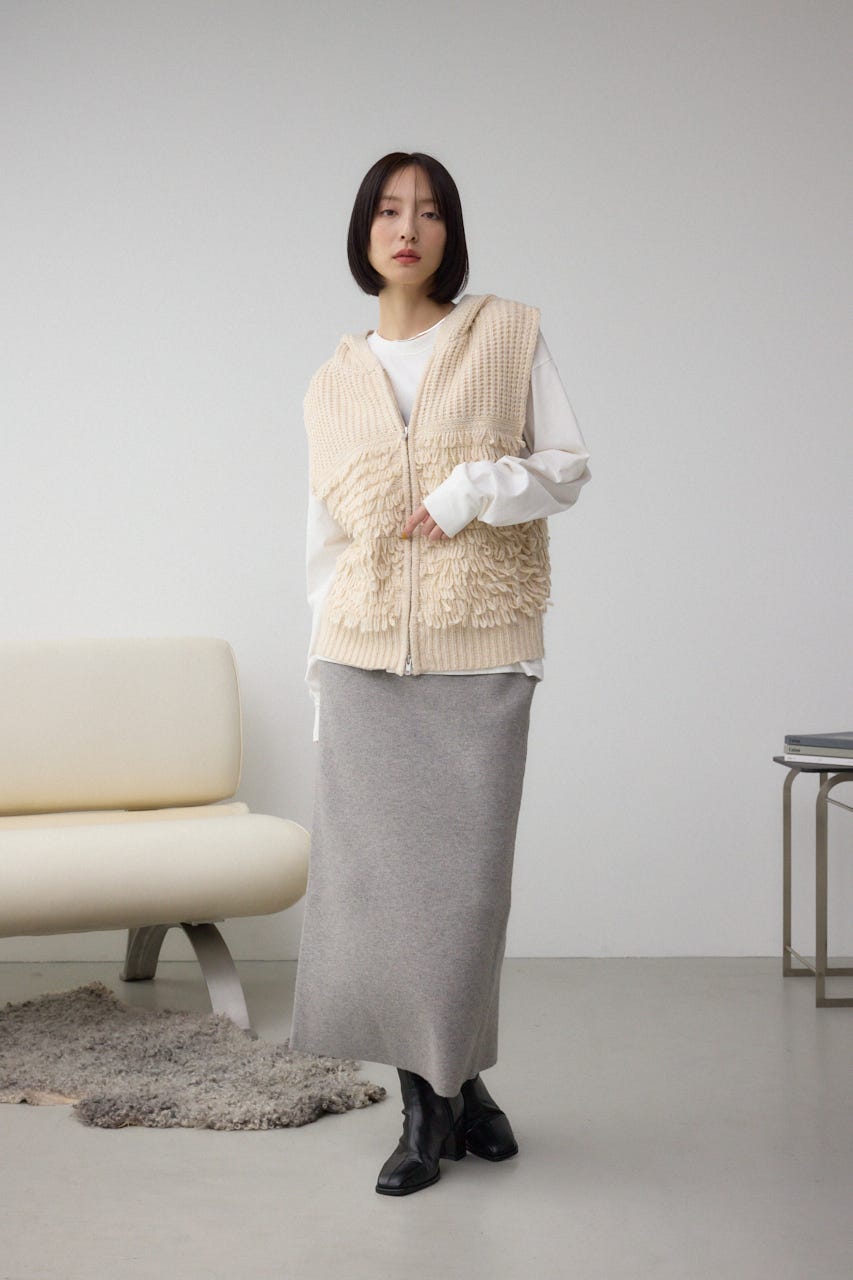 微配色の糸をループに編み立てた、表情のある編地が特徴のニットベスト。
