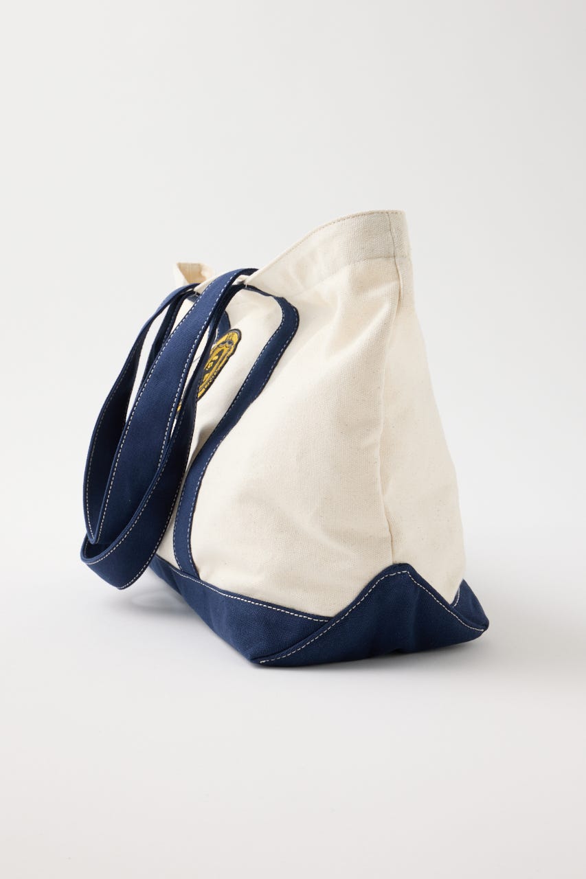 クラシックなキャンバスバッグにオリジナルのエンブレムと両ブランドのロゴが刺繍で施されています。