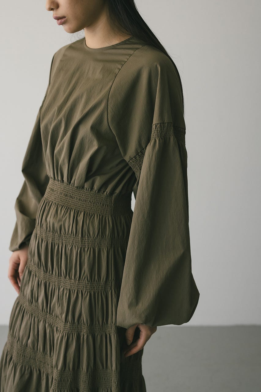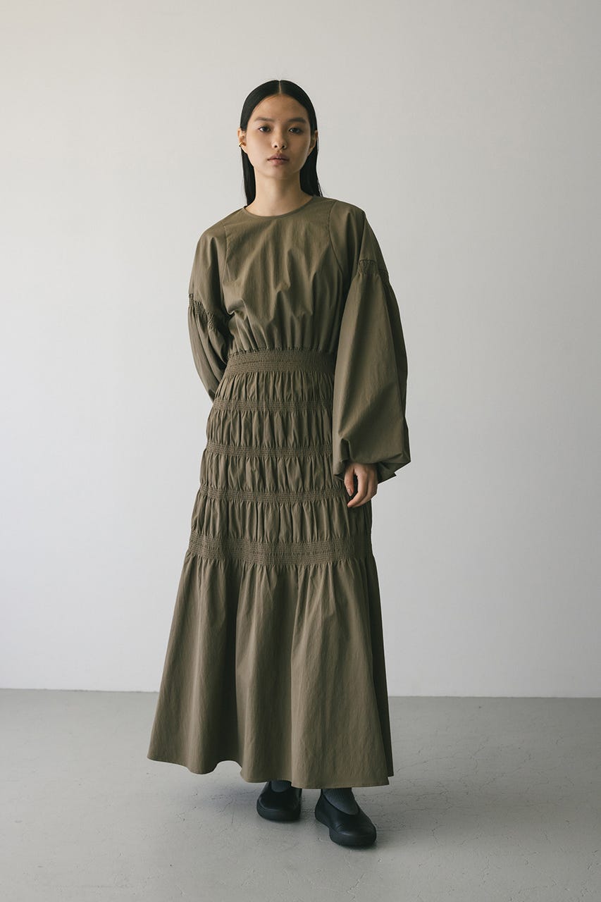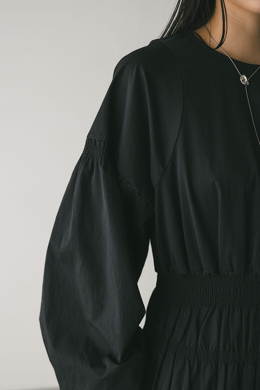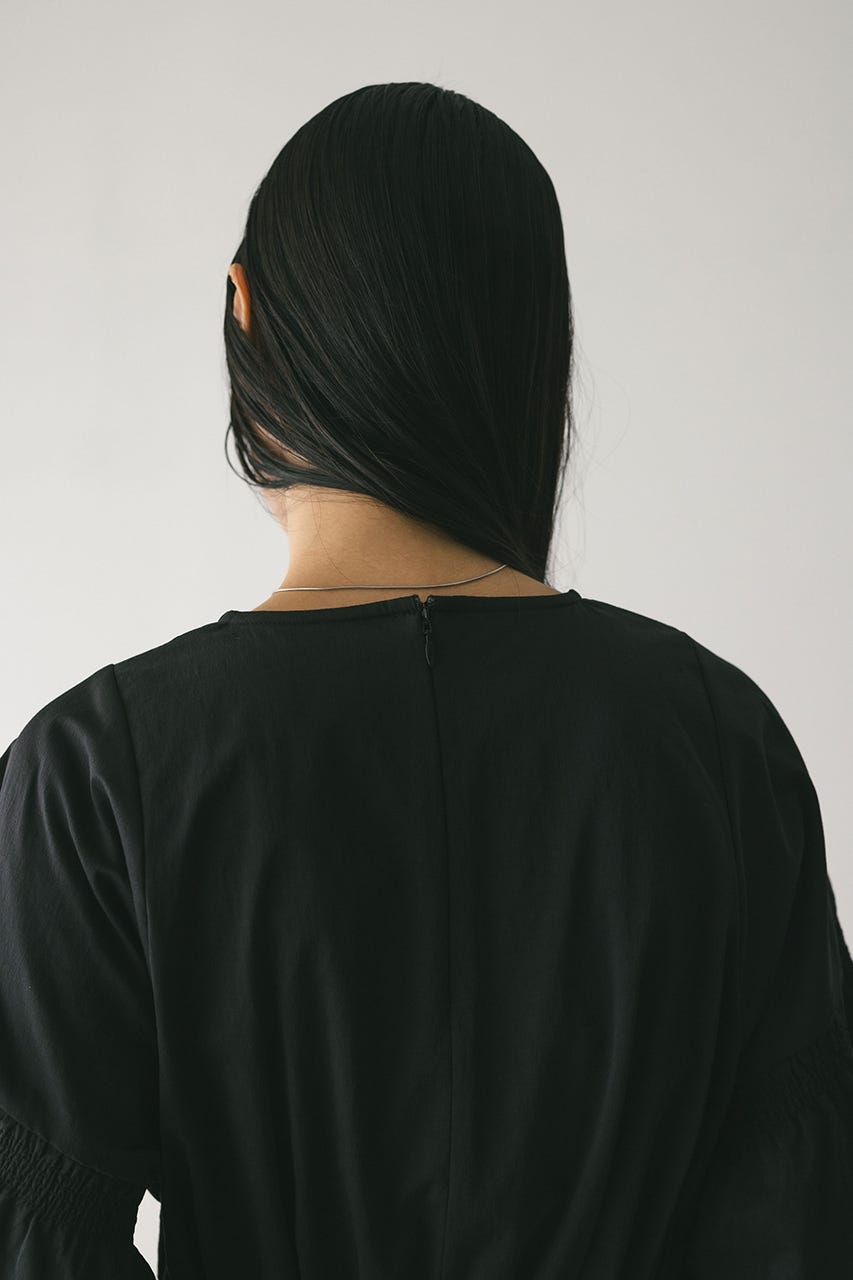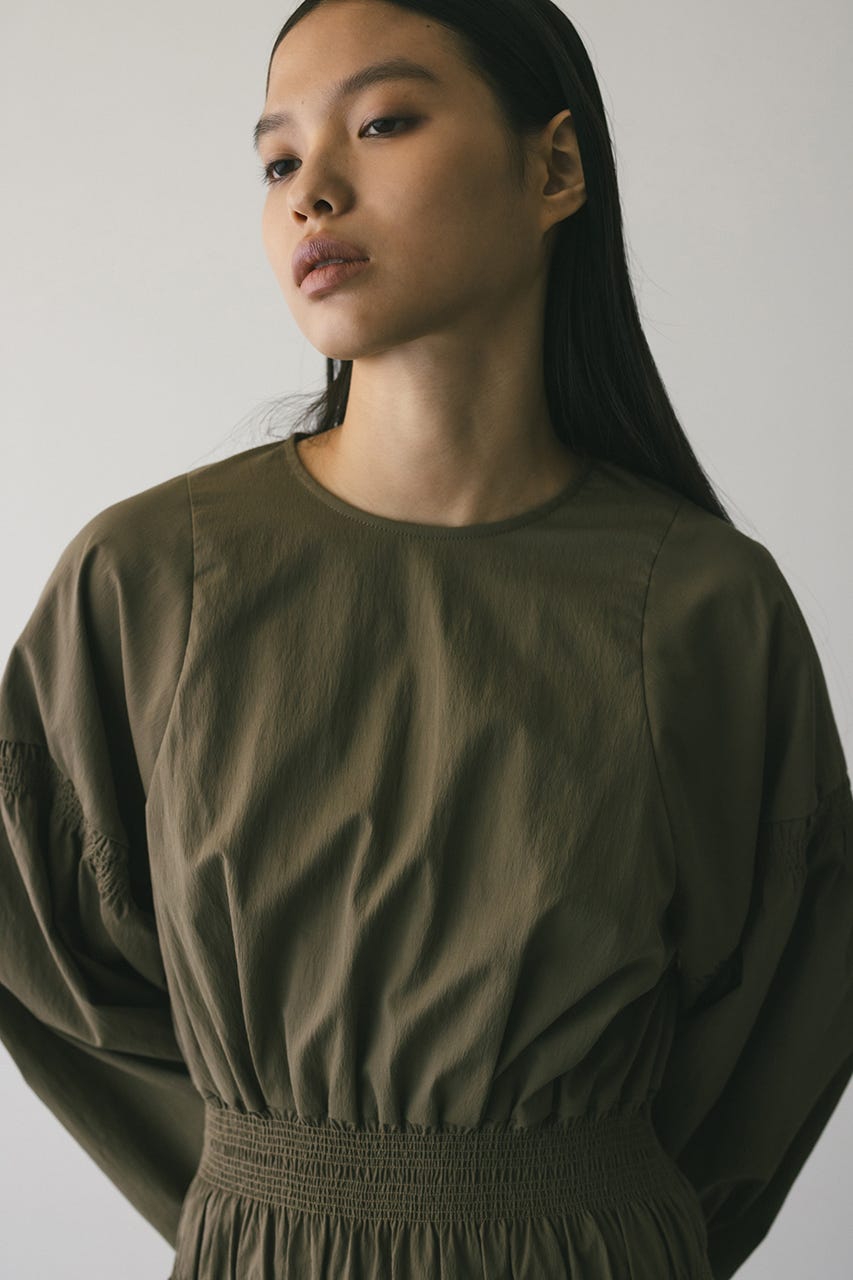 袖にふんわりとしたボリュームを持たせたバルーンスリーブとボディーのシャーリングから自然に広がるフレアラインがポイントのワンピース。