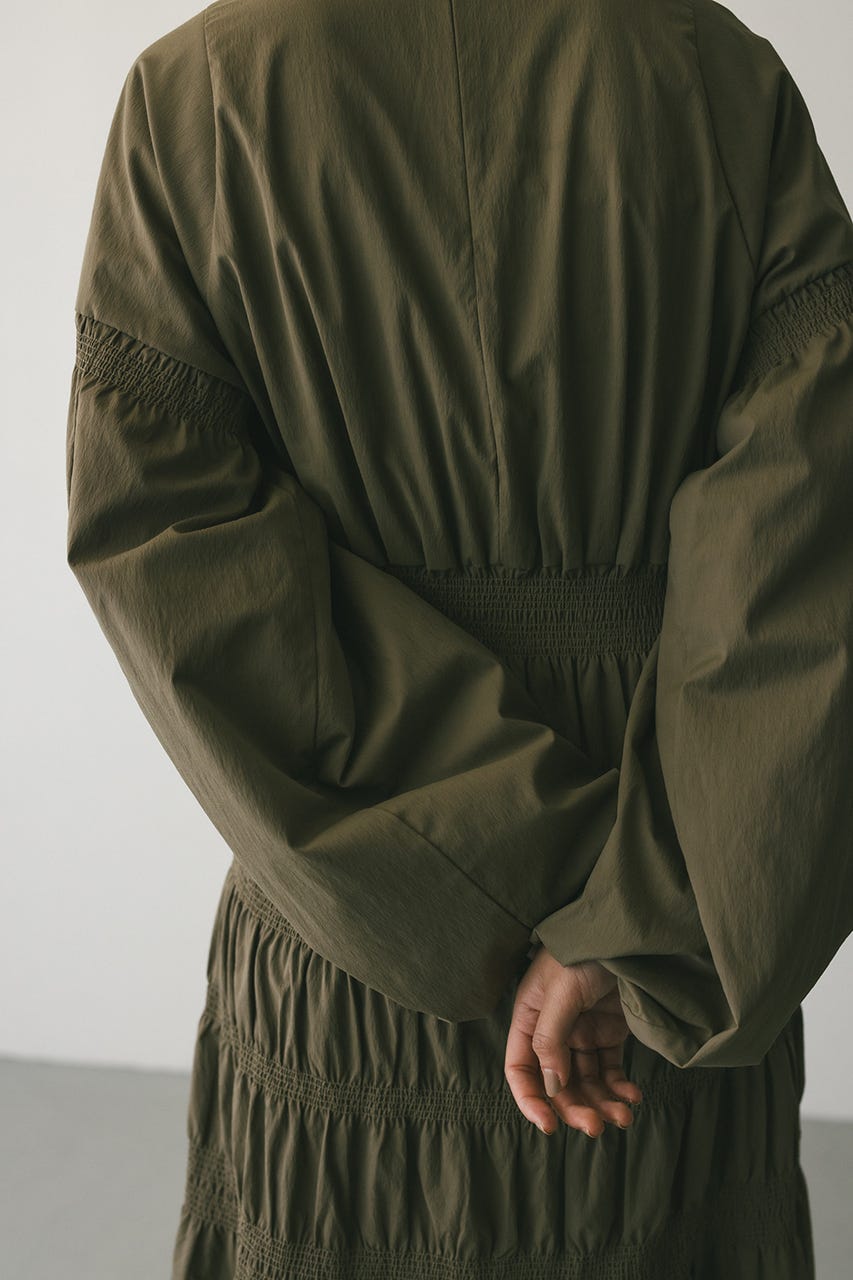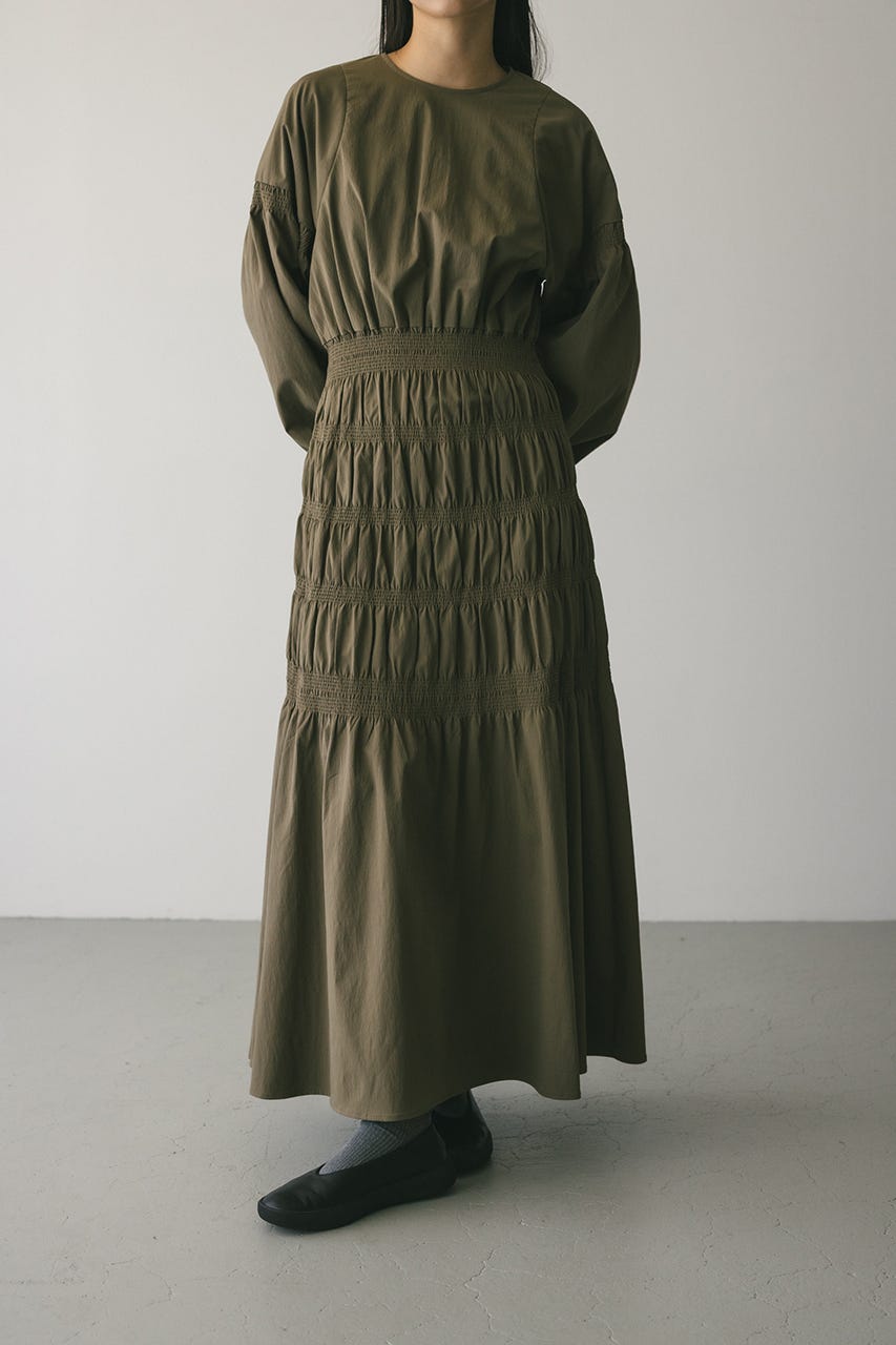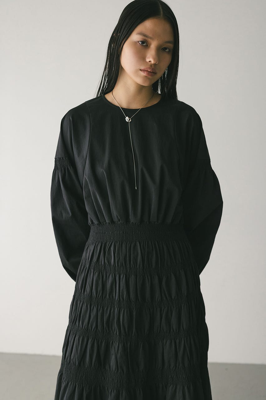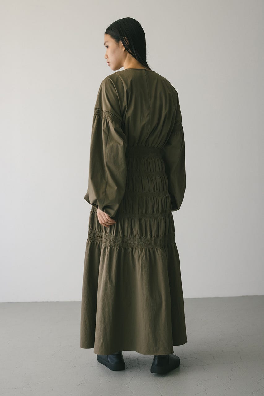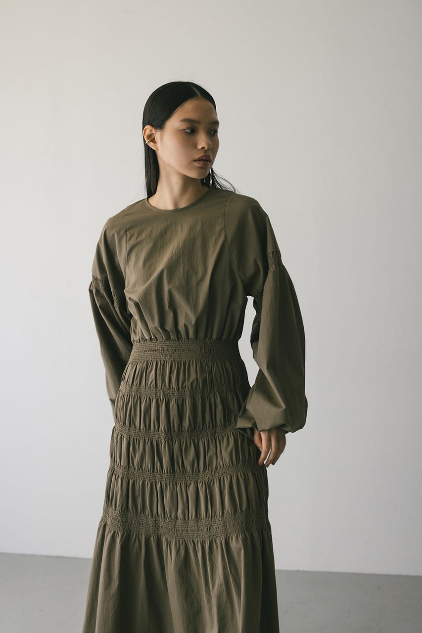 袖にふんわりとしたボリュームを持たせたバルーンスリーブとボディーのシャーリングから自然に広がるフレアラインがポイントのワンピース。