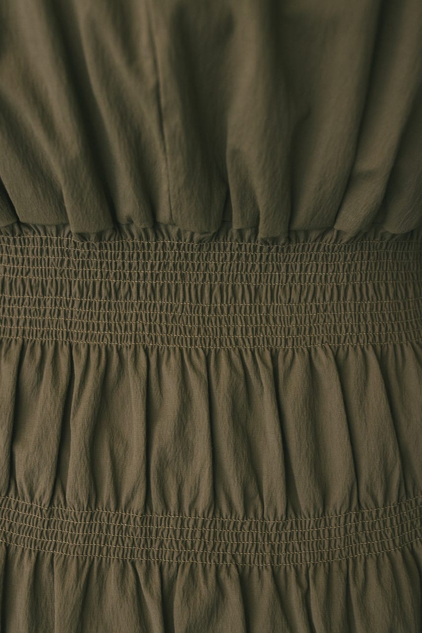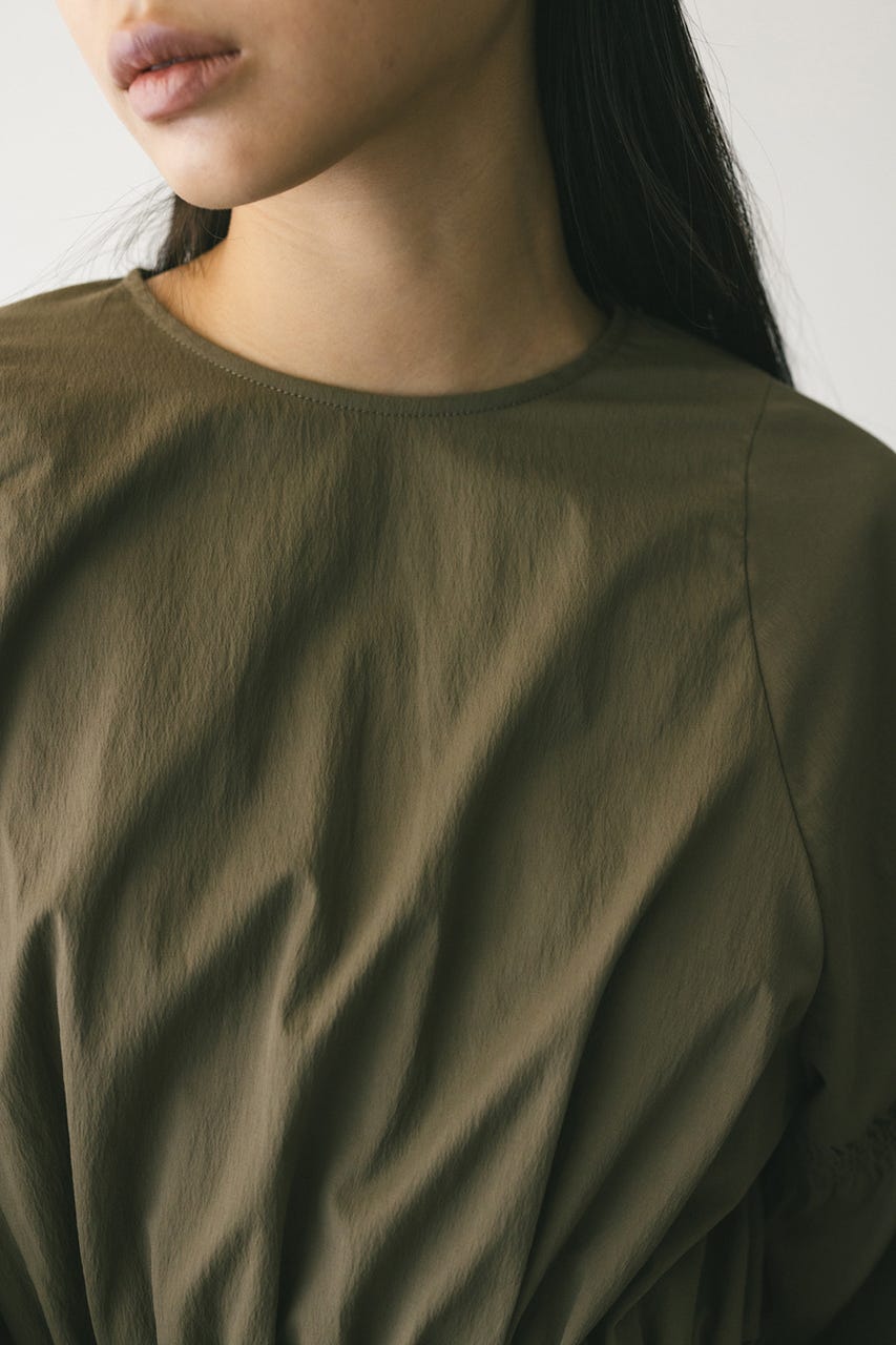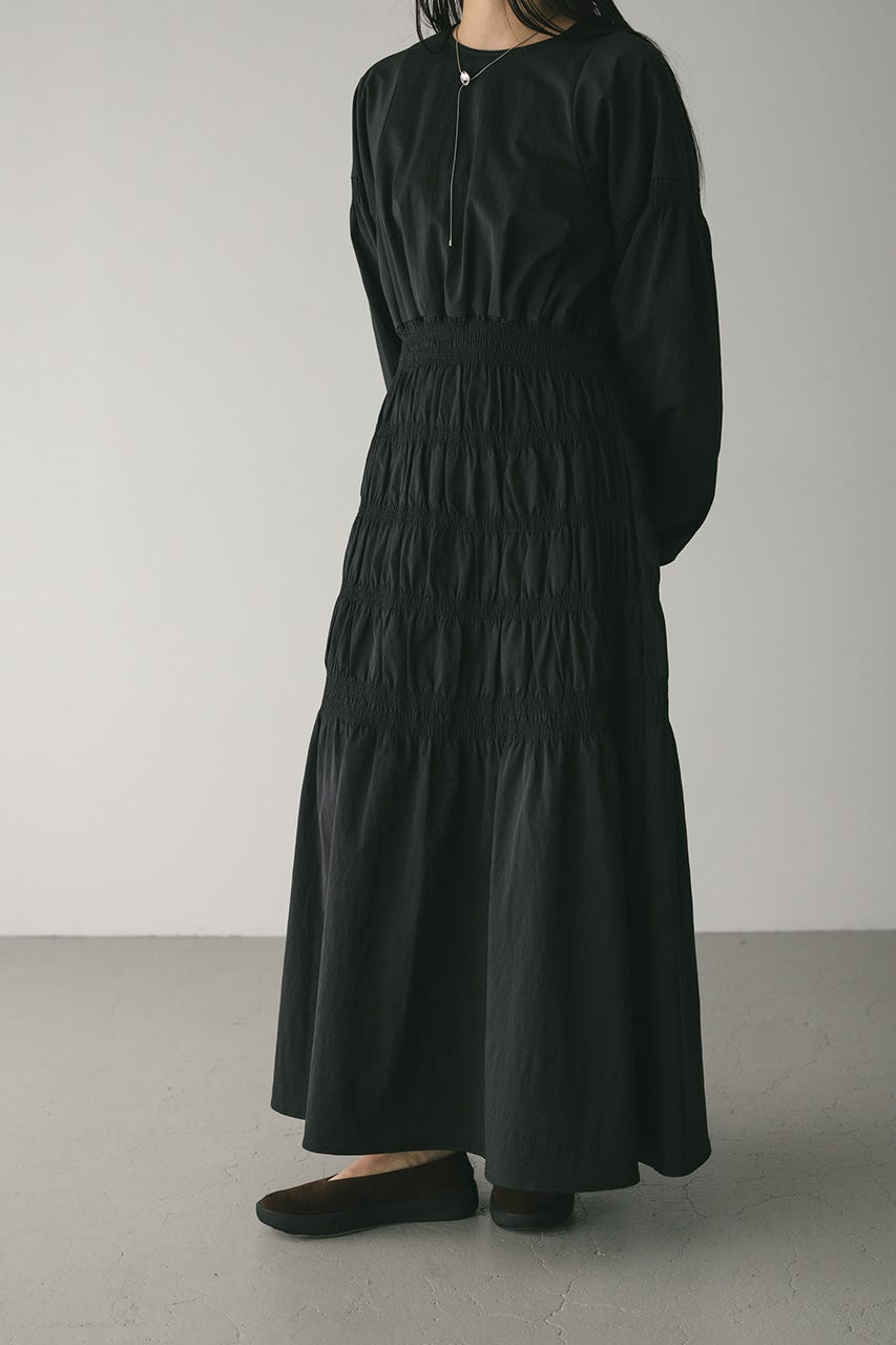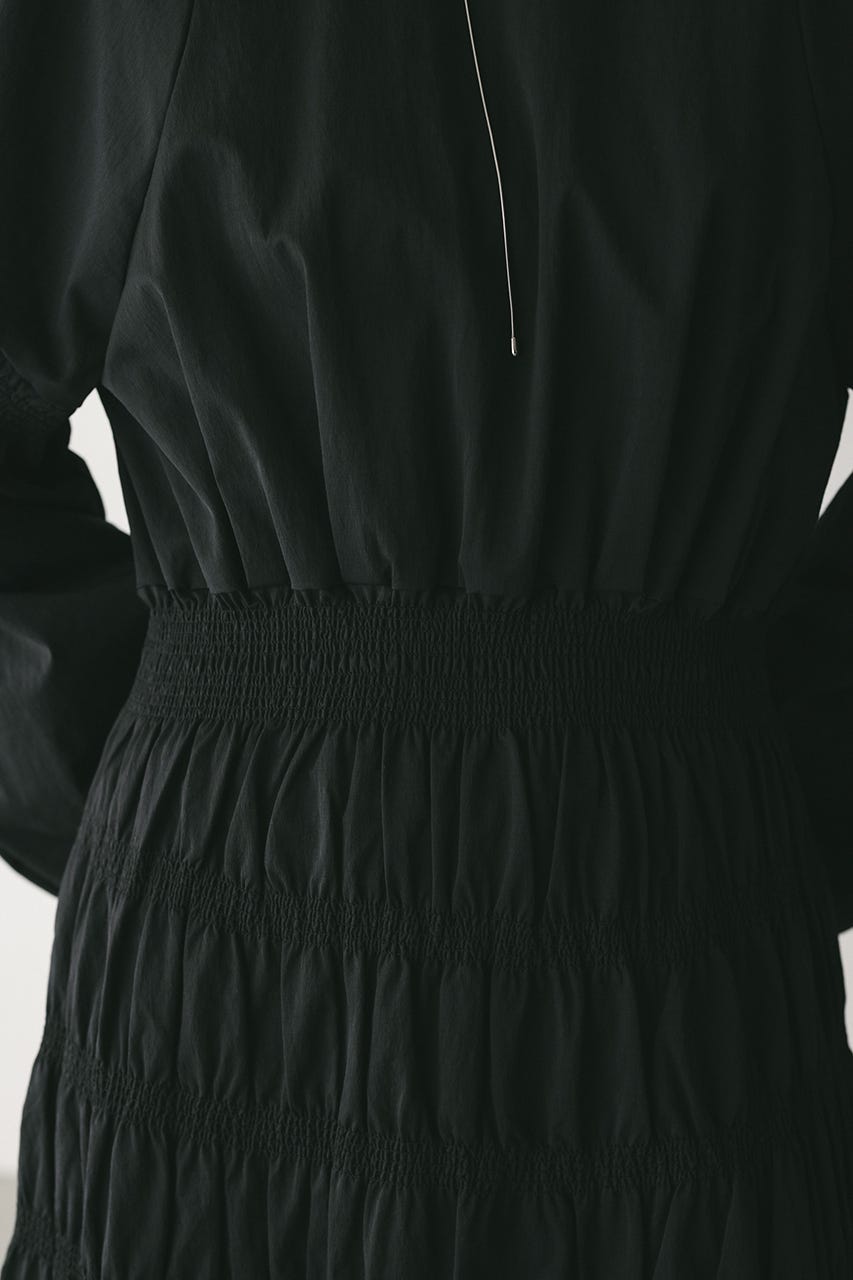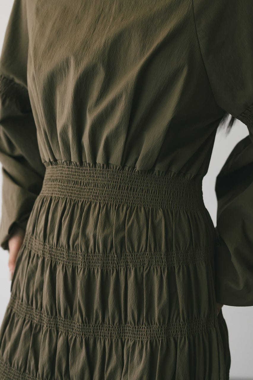袖にふんわりとしたボリュームを持たせたバルーンスリーブとボディーのシャーリングから自然に広がるフレアラインがポイントのワンピース。