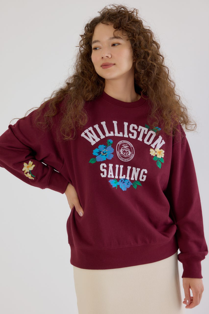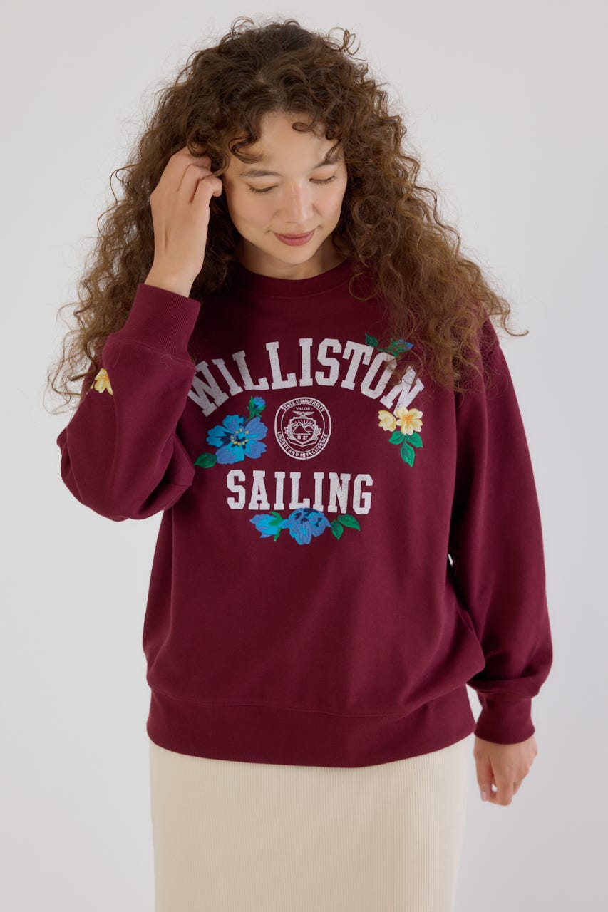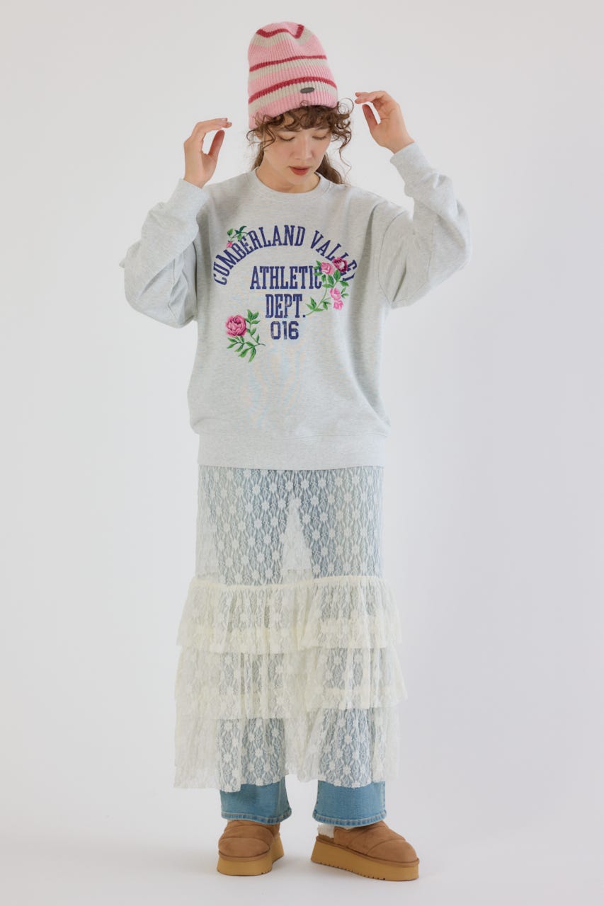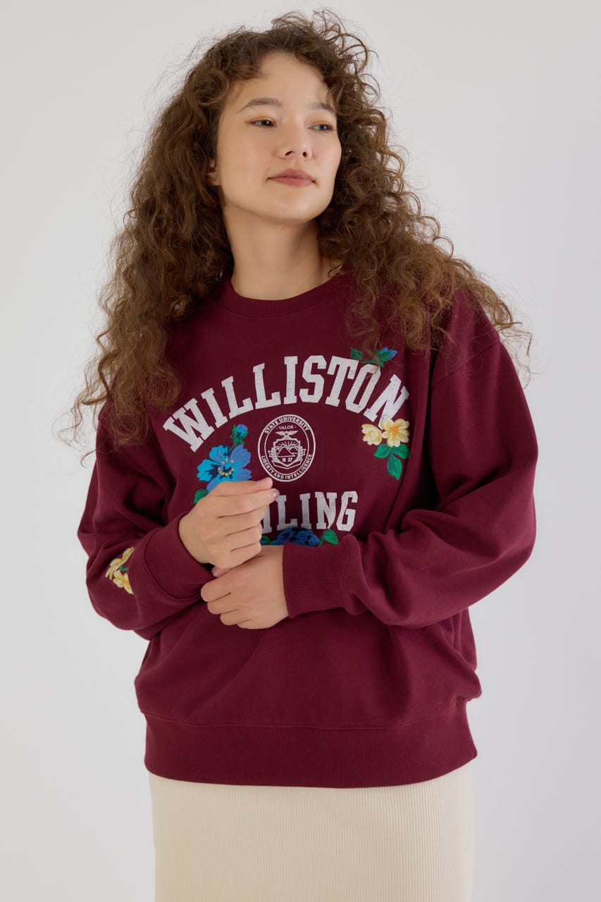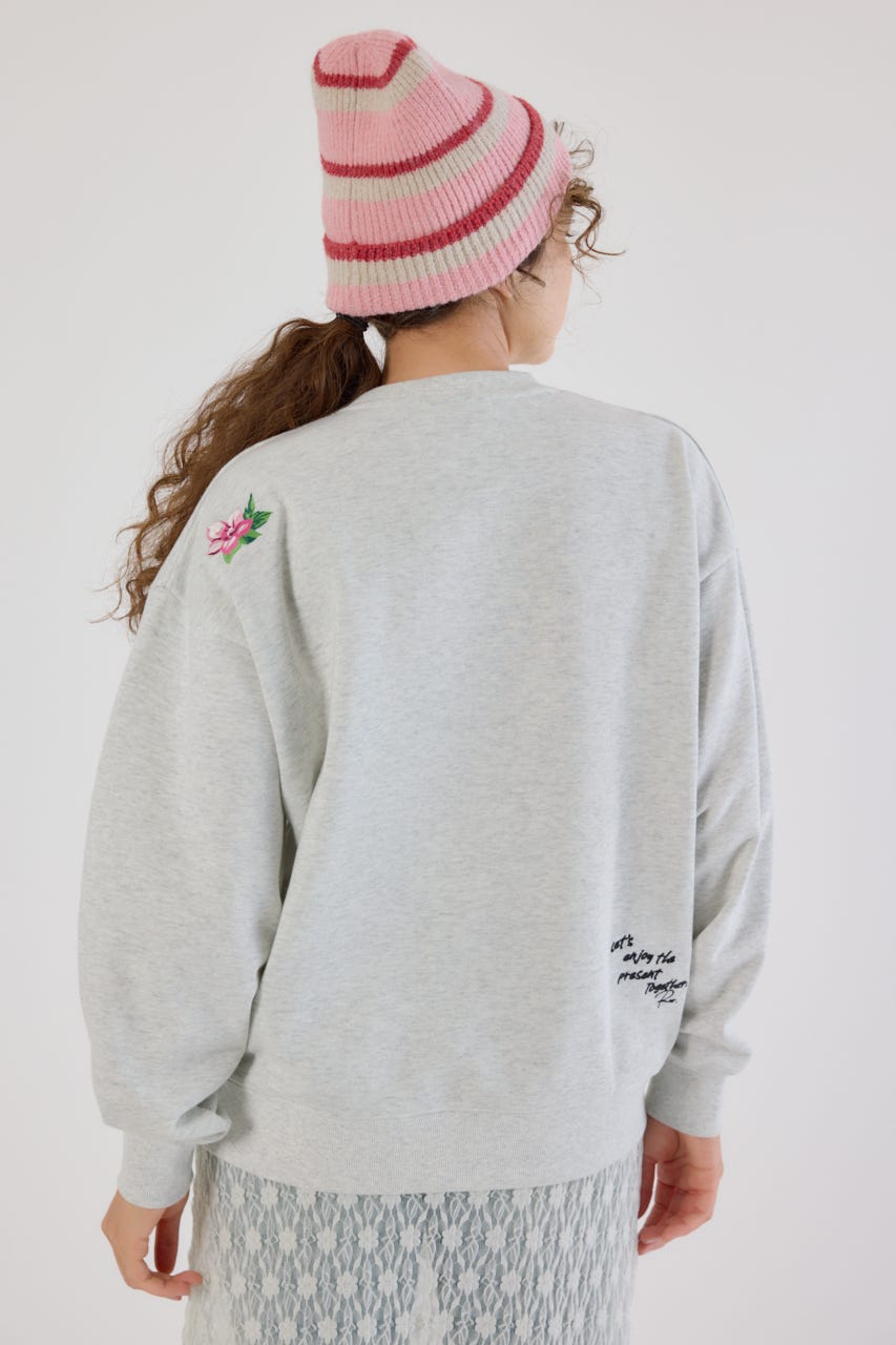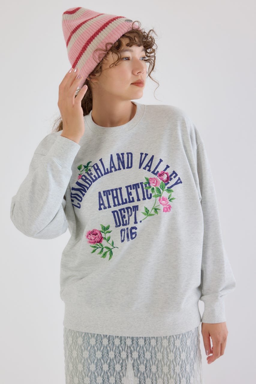 カレッジプリントの上にフラワー刺繍を施したスウェットトップス。