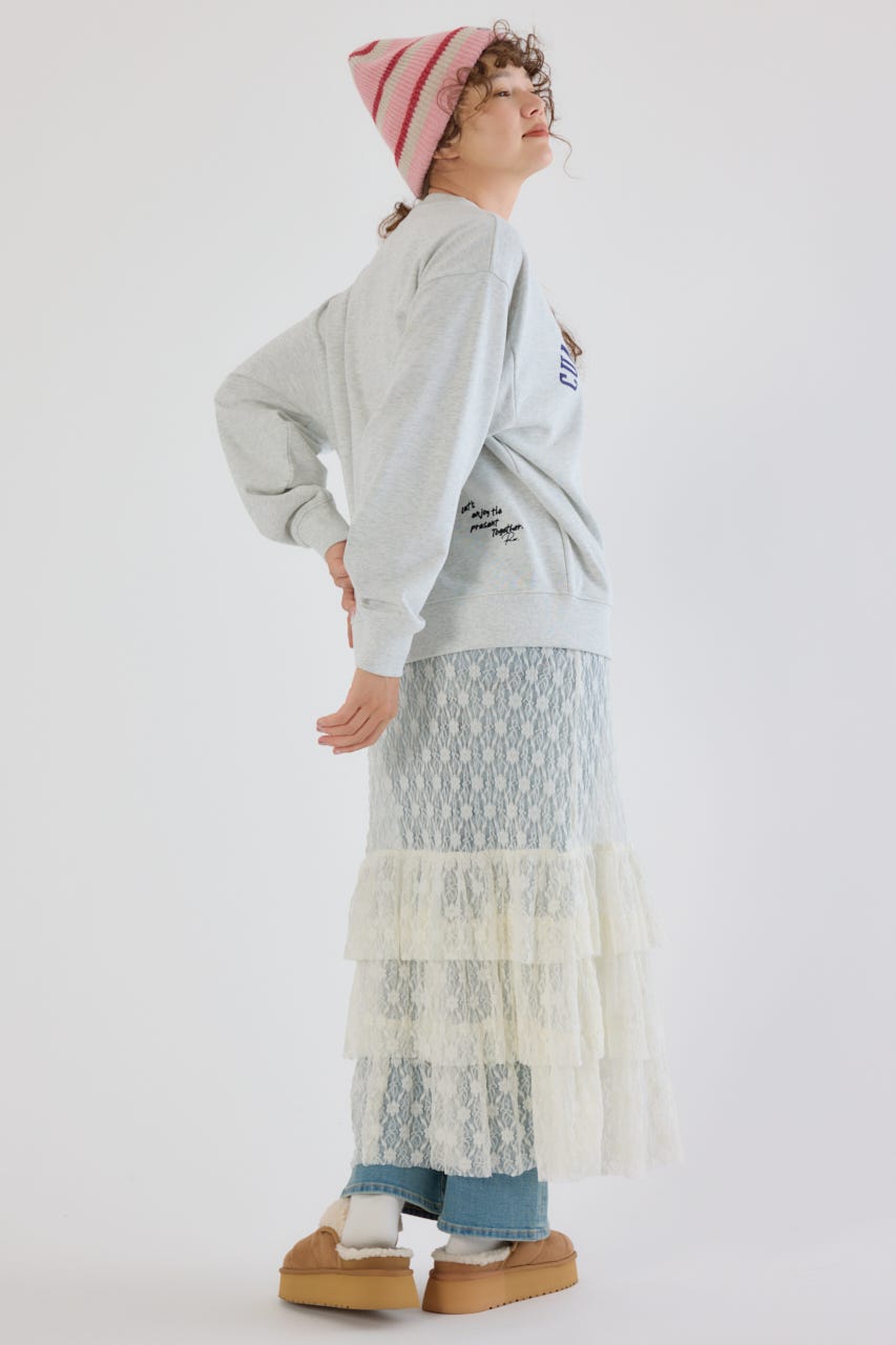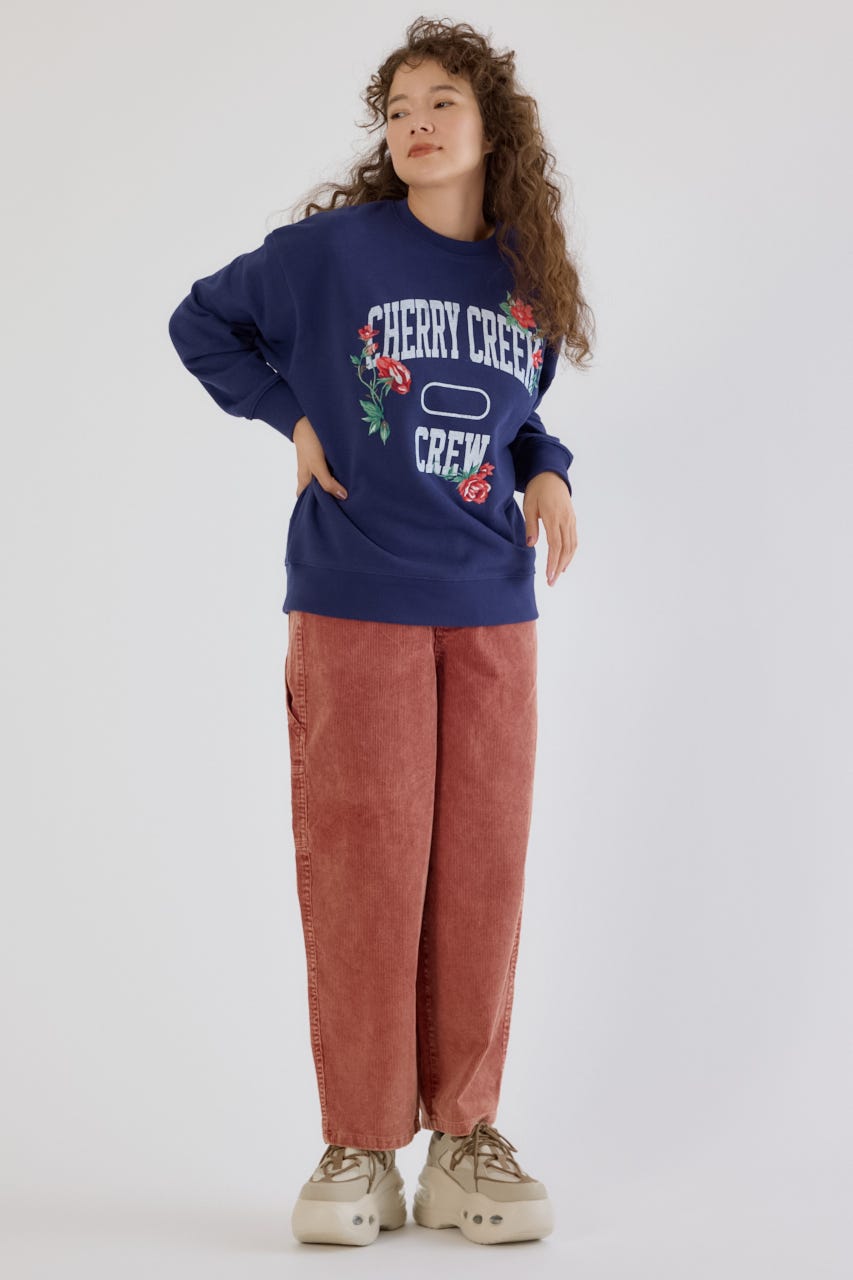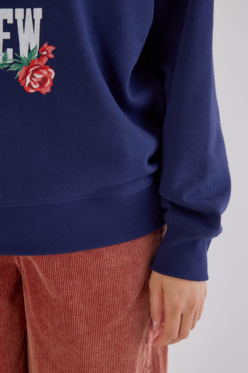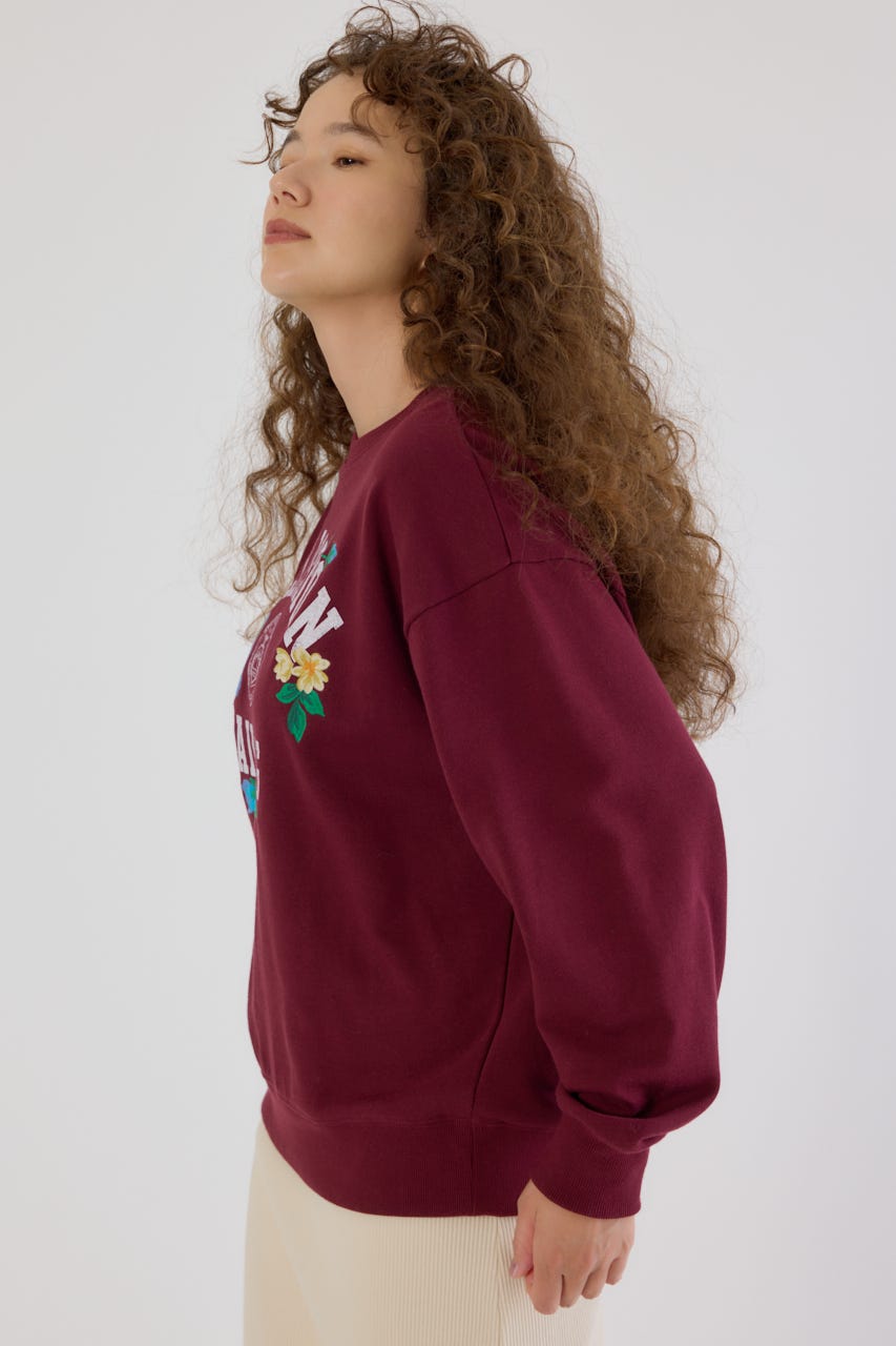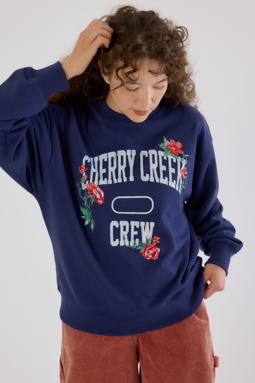 カレッジプリントの上にフラワー刺繍を施したスウェットトップス。