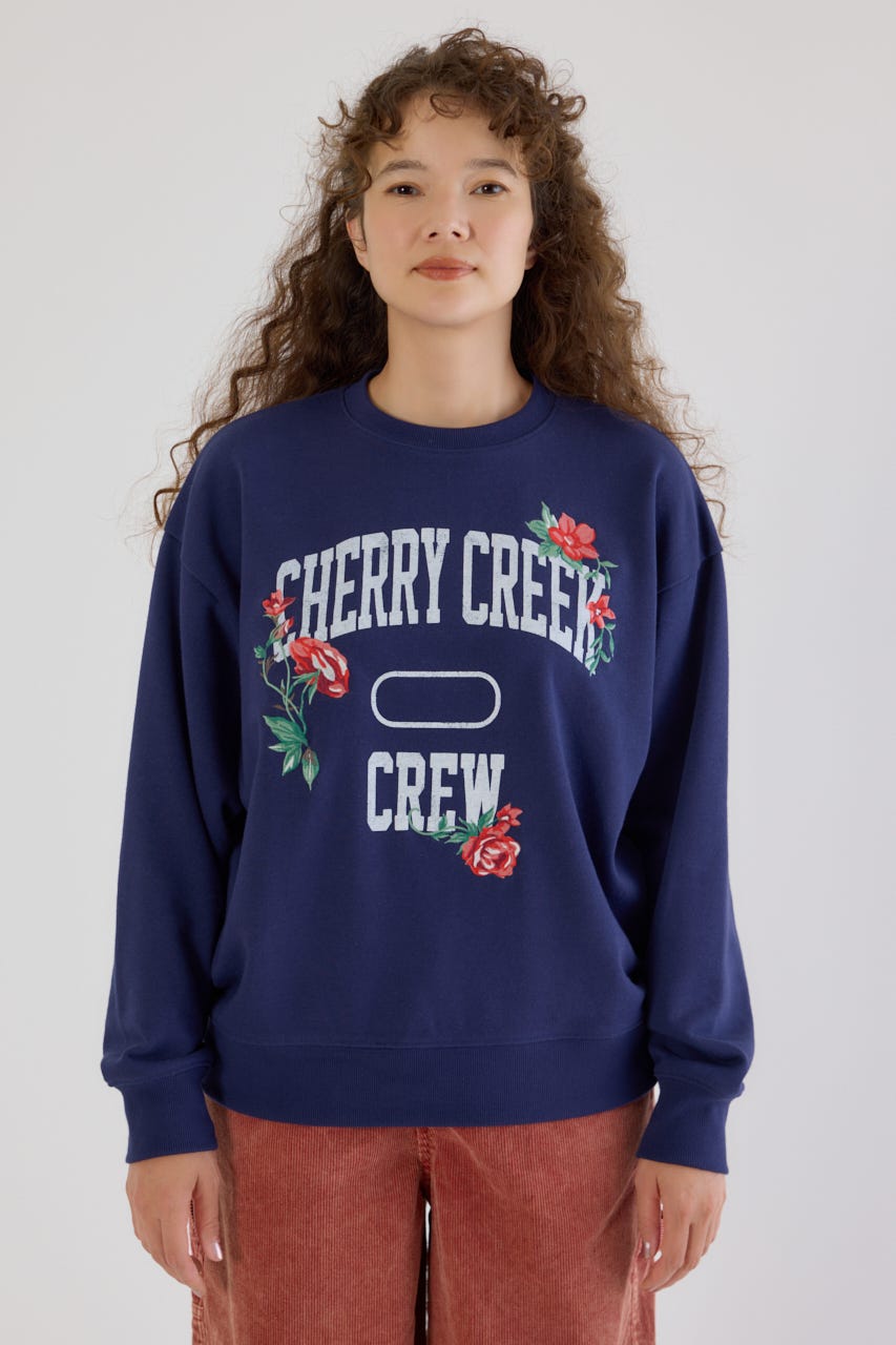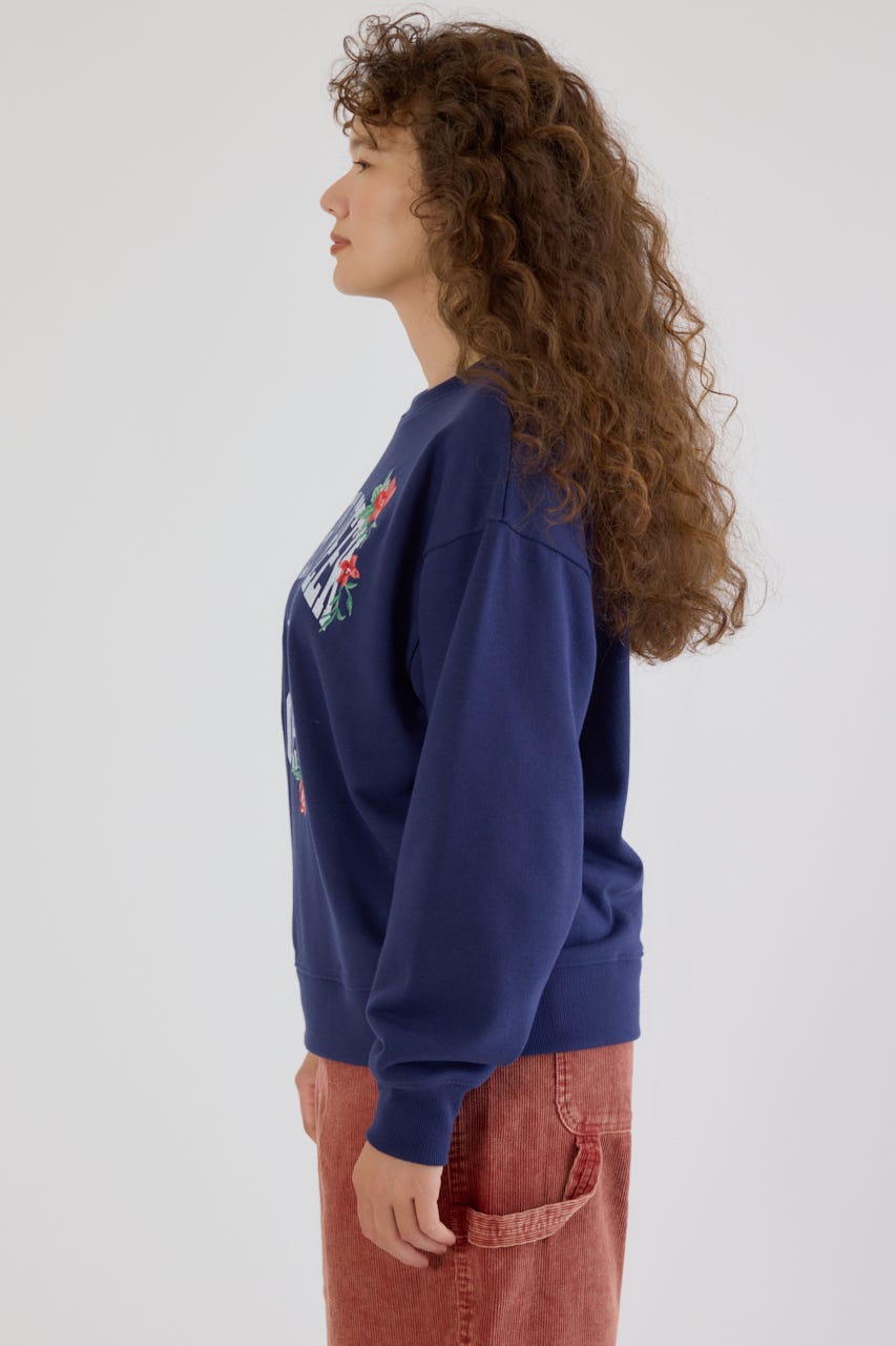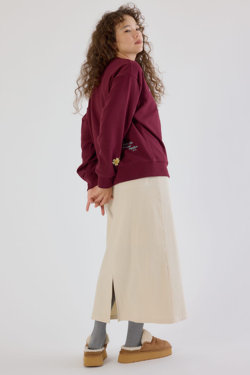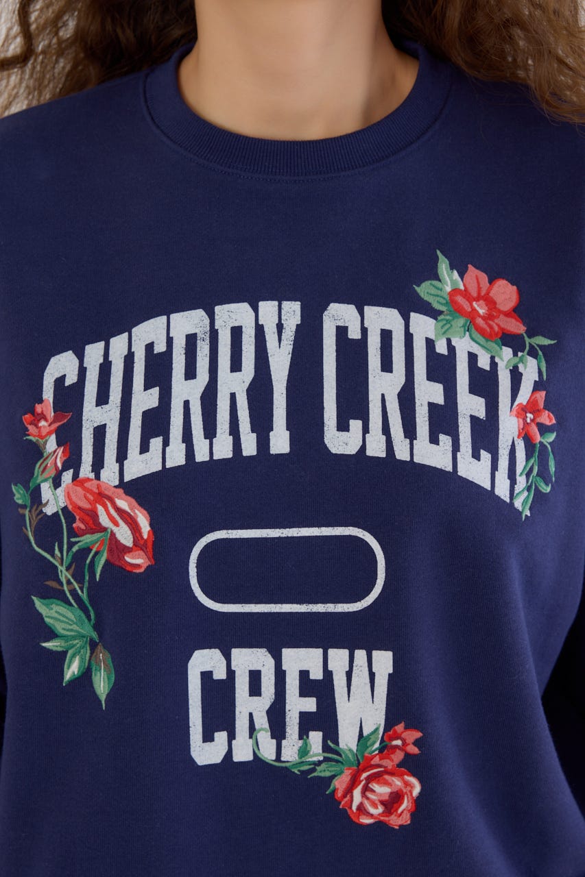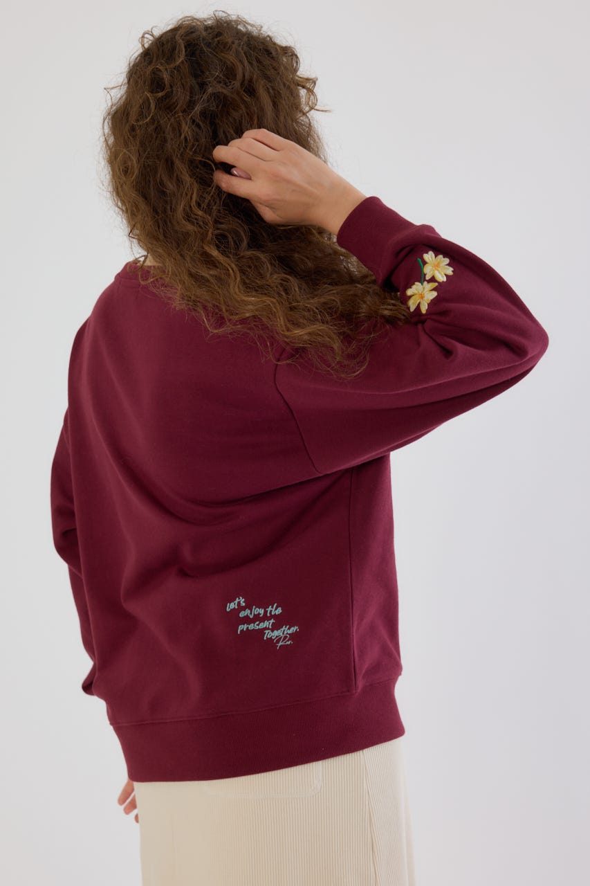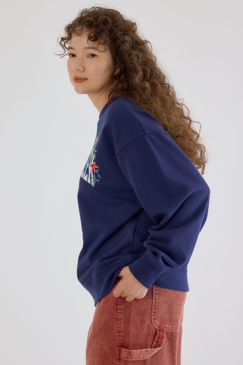 カレッジプリントの上にフラワー刺繍を施したスウェットトップス。