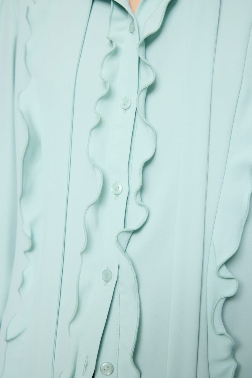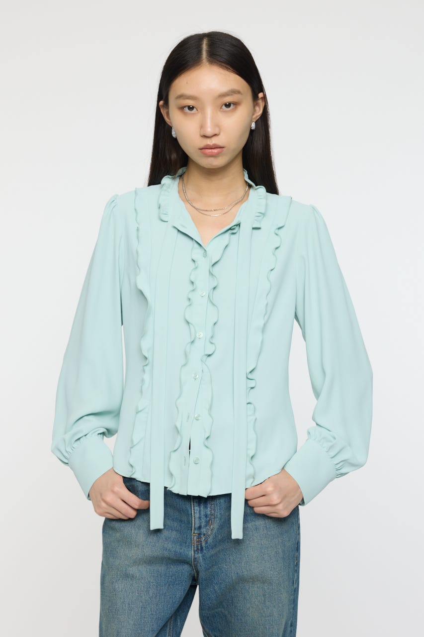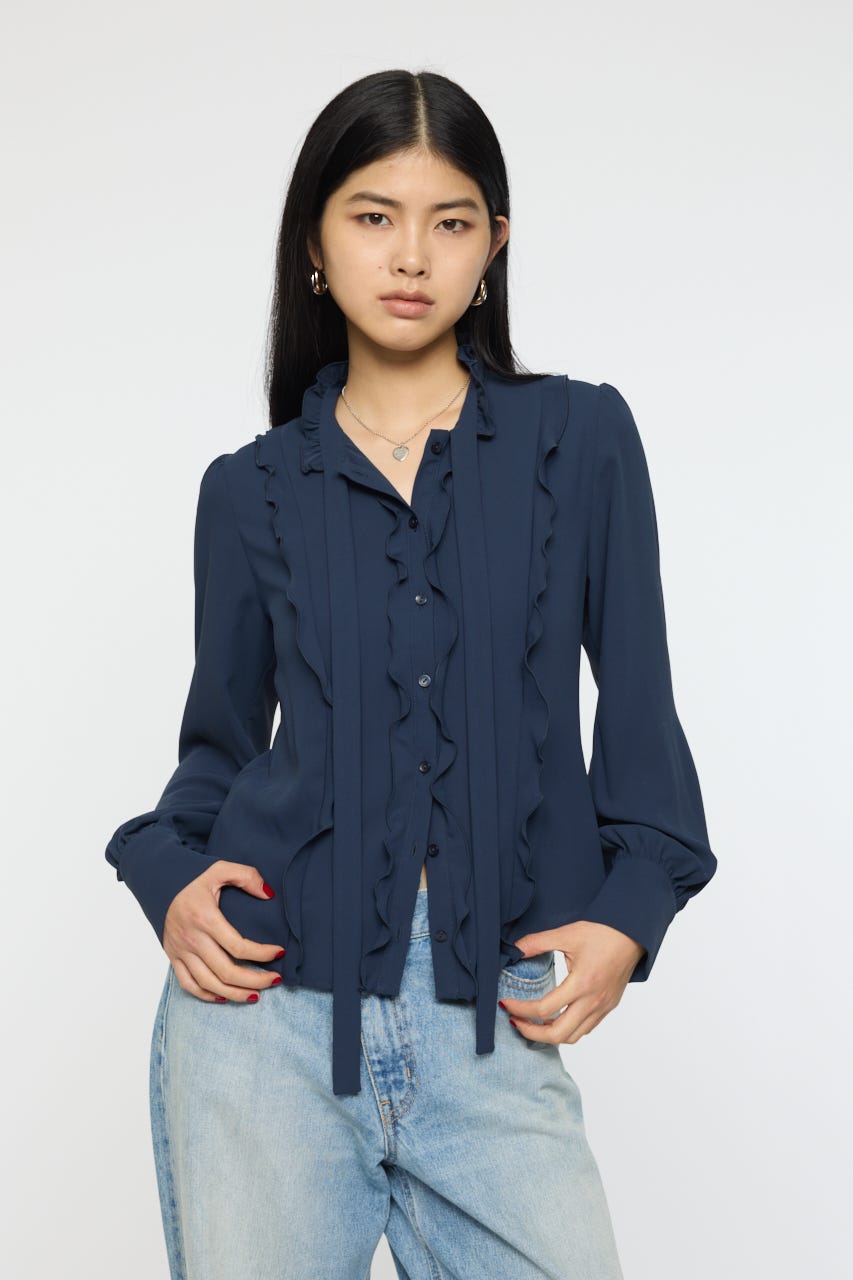 フロントのフリルがフェミニンな印象のジョーゼットフリルブラウス。