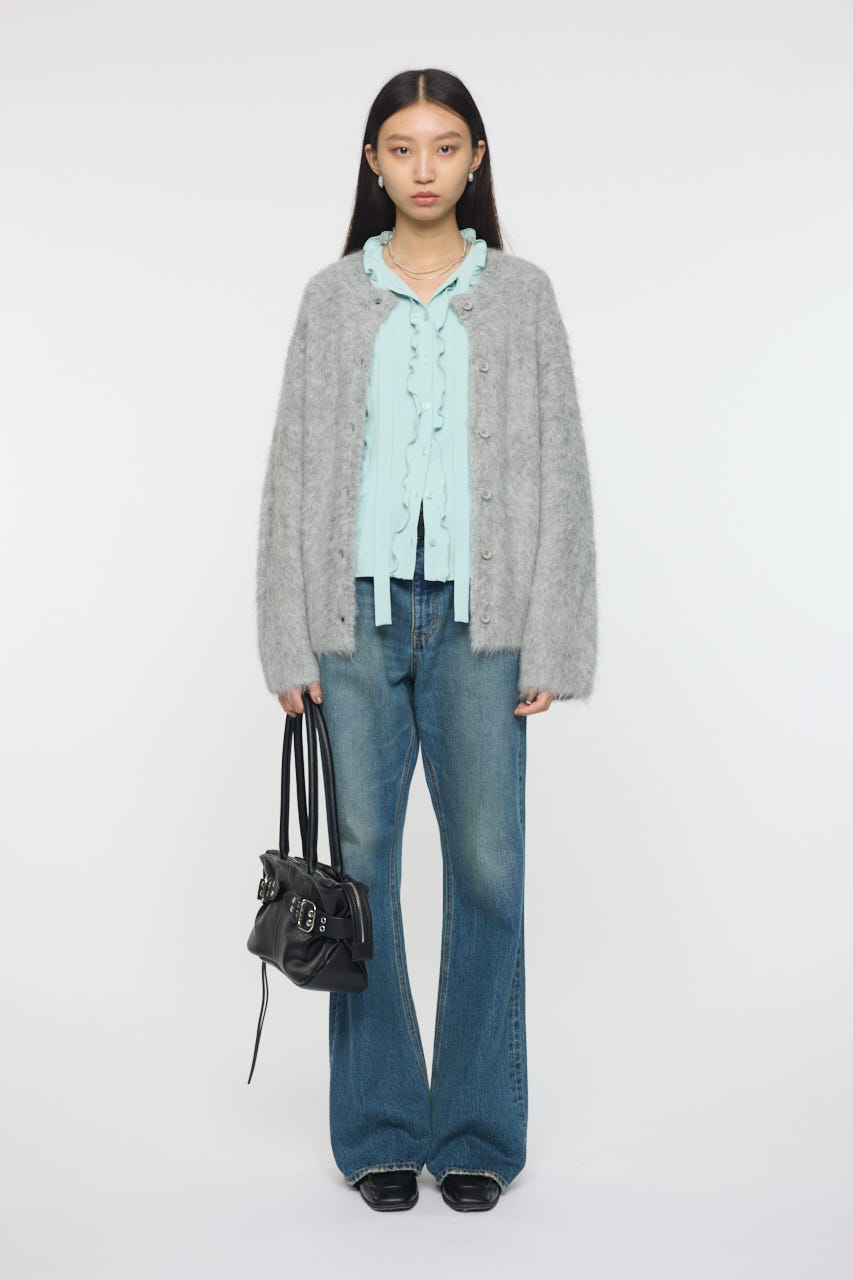グレーのカーディガンと細身のデニムで合わせてフェミニンなコーディネートでもレザーやデニムアウターと合わせたMIXコーデもオススメです。