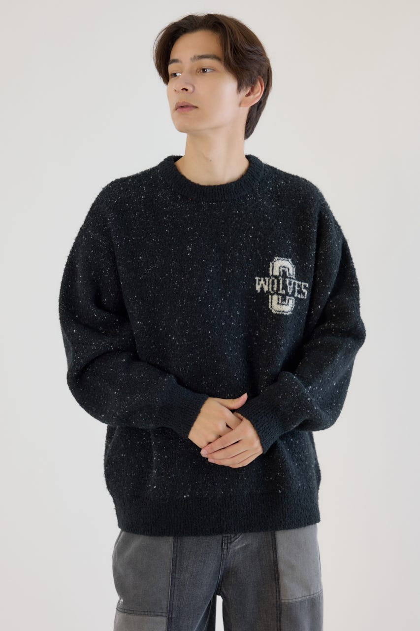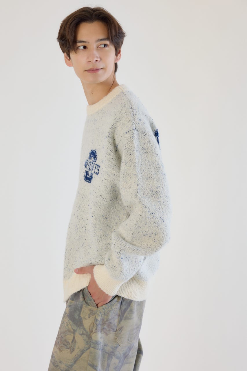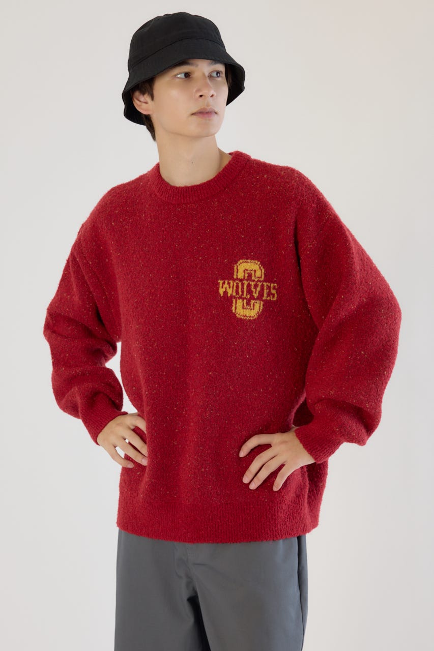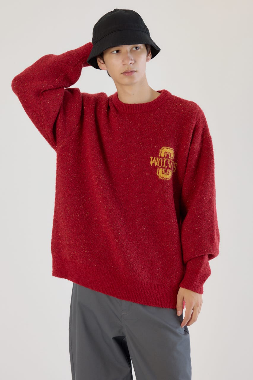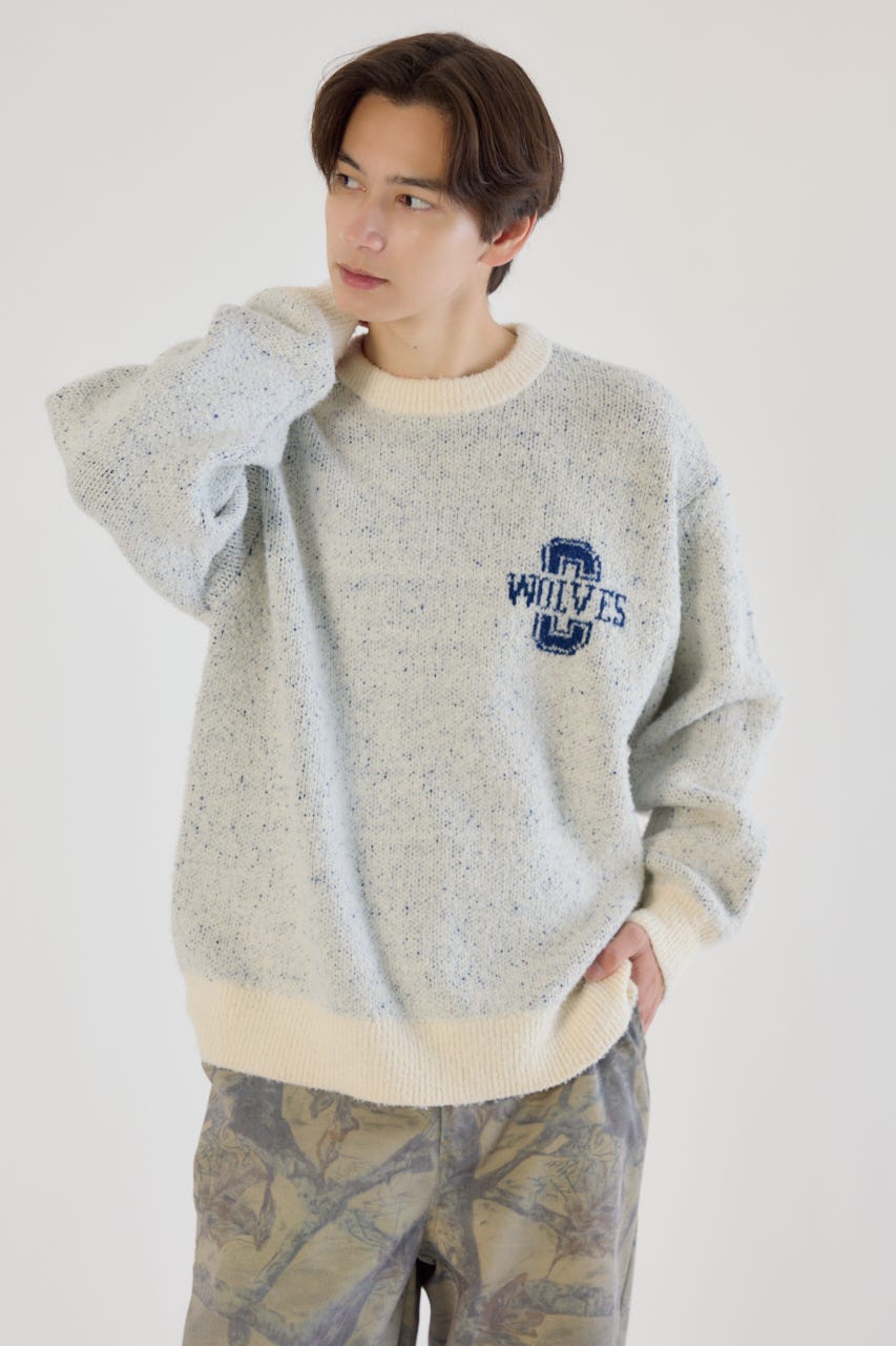 カレッジ調のキャラクターグラフィックをニットで表現した1枚。