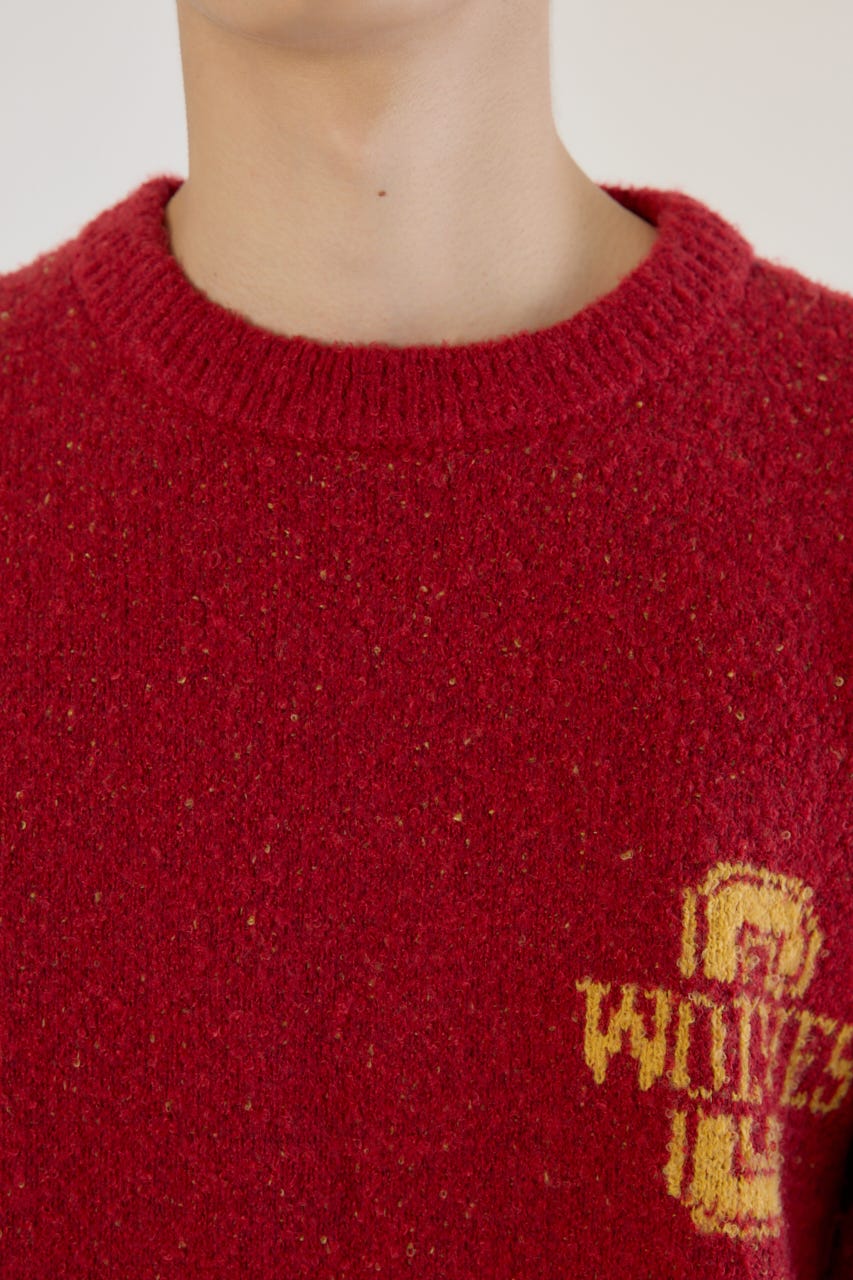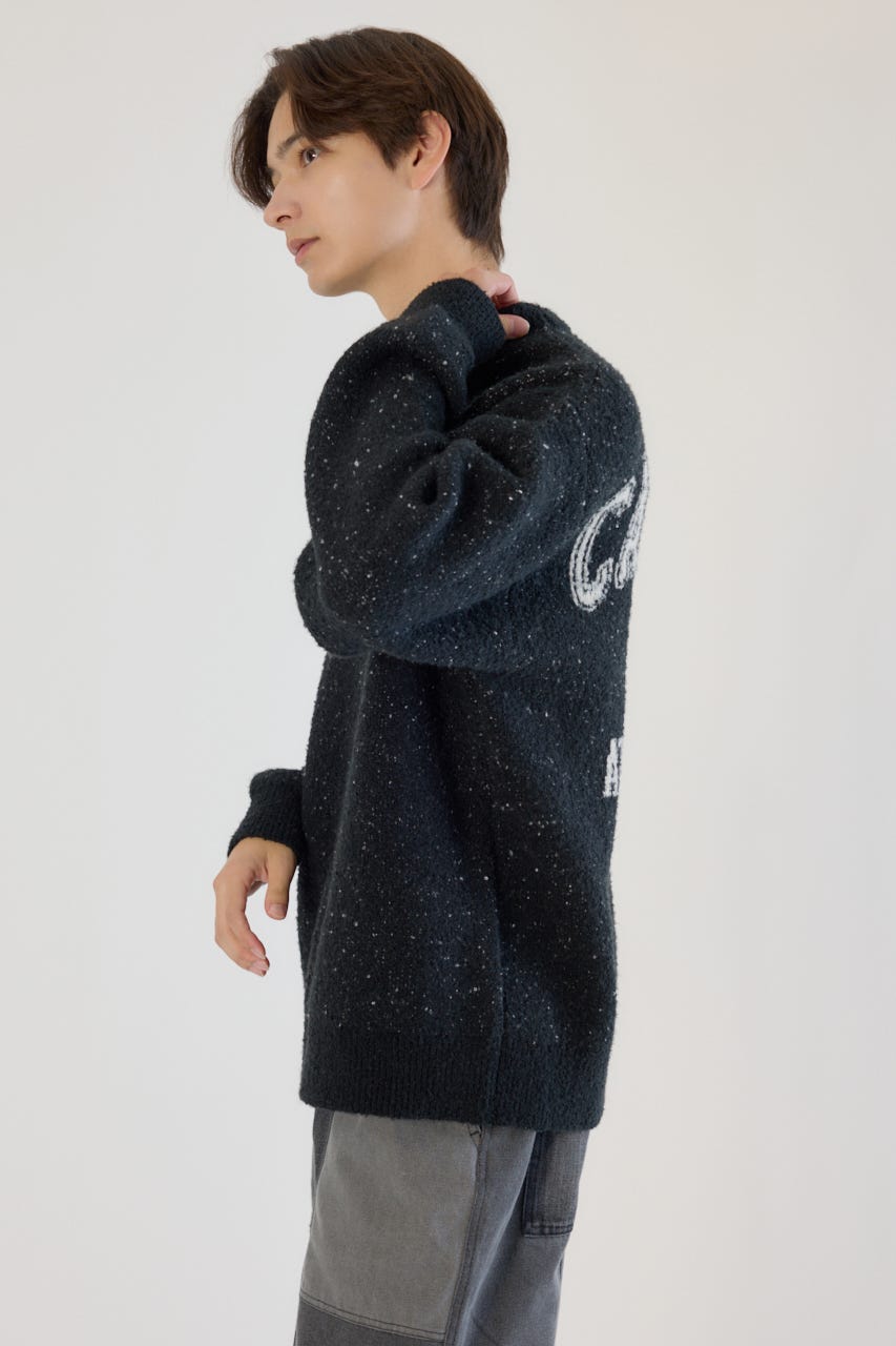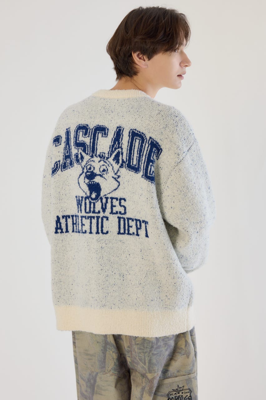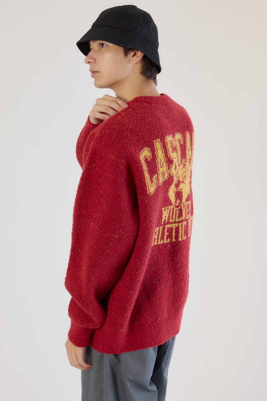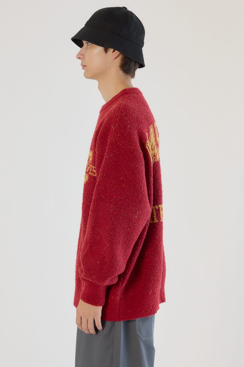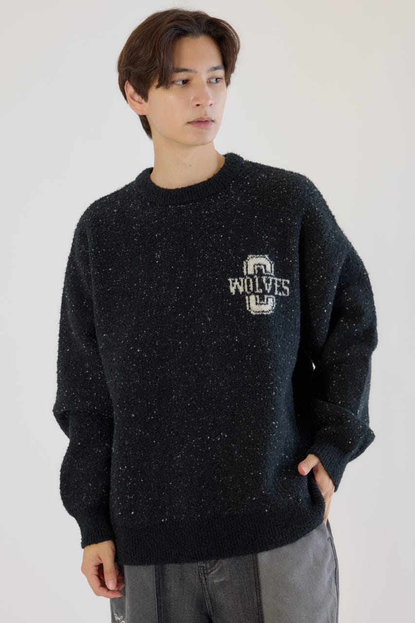 カレッジ調のキャラクターグラフィックをニットで表現した1枚。
