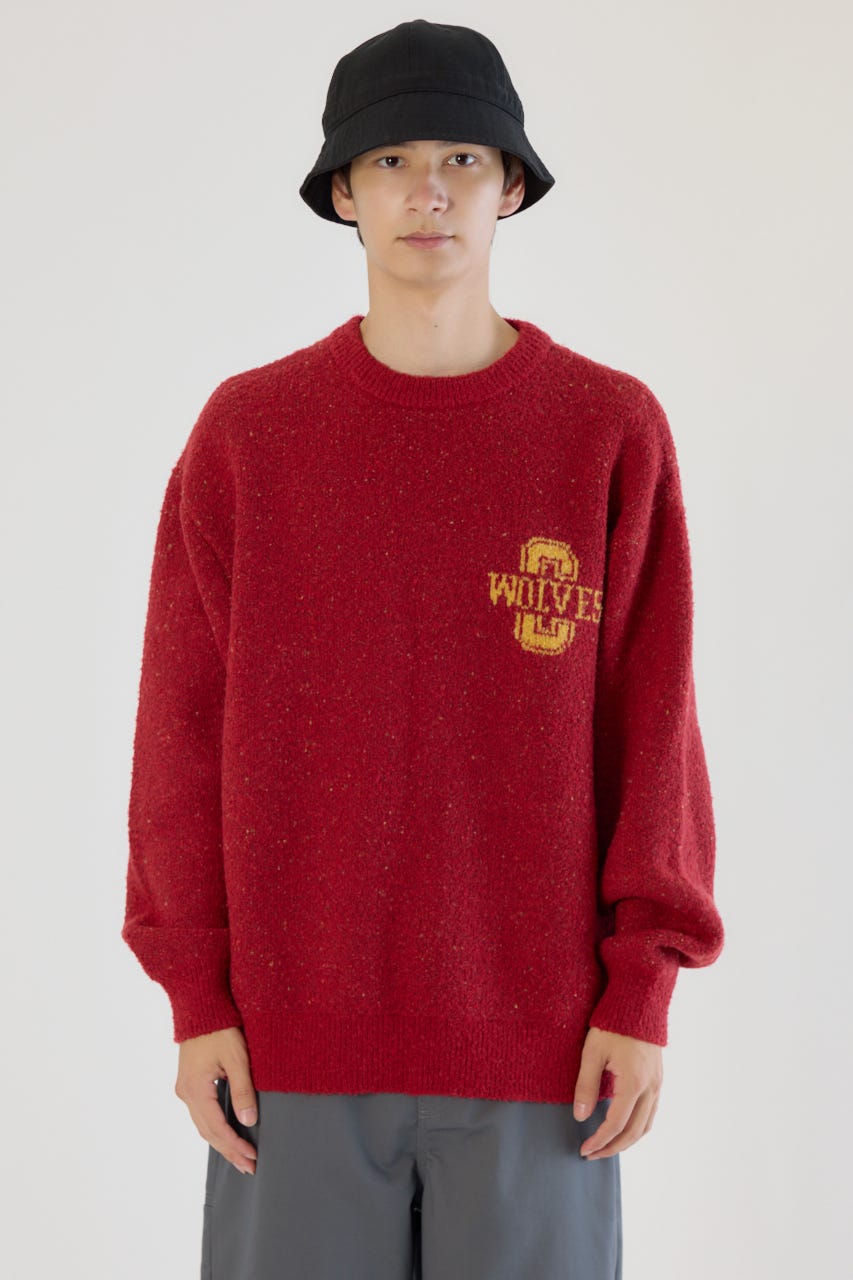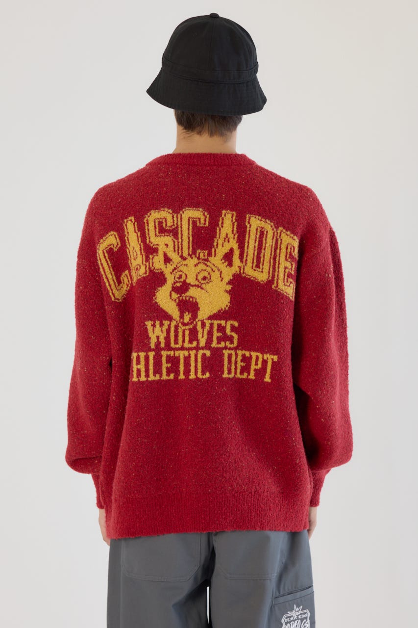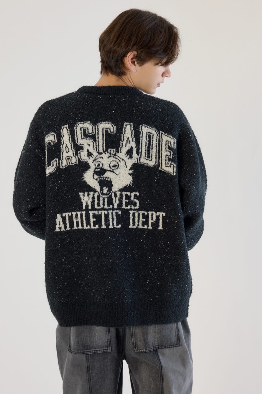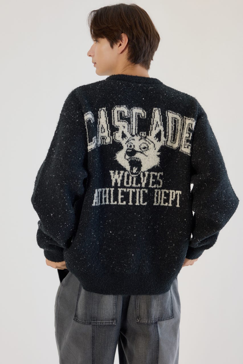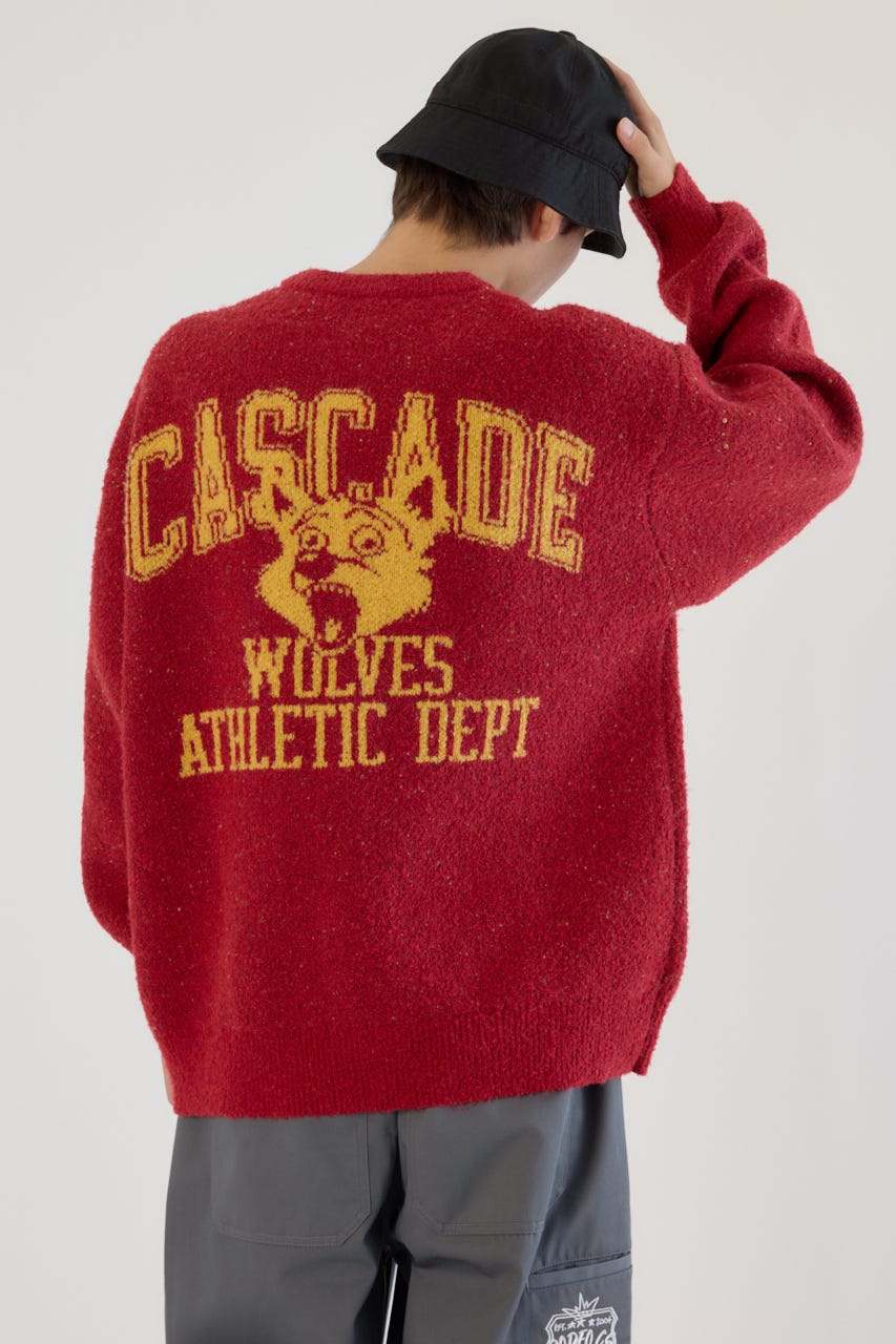カレッジ調のキャラクターグラフィックをニットで表現した1枚。