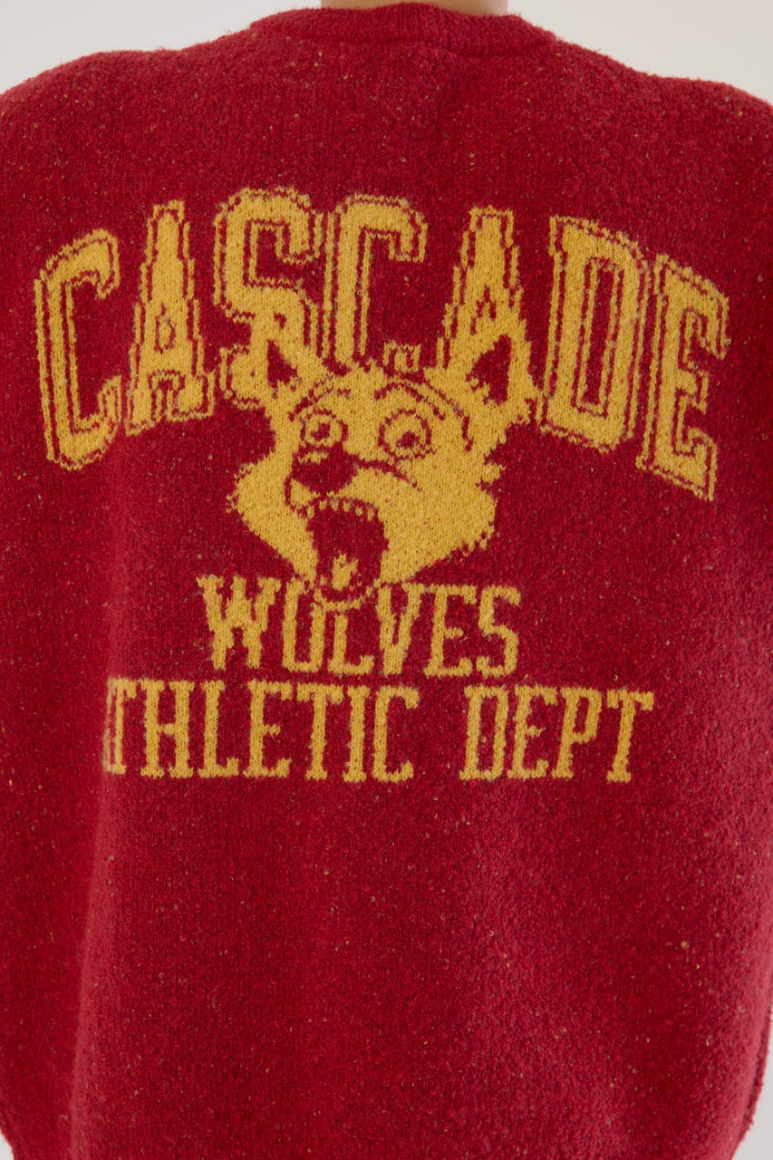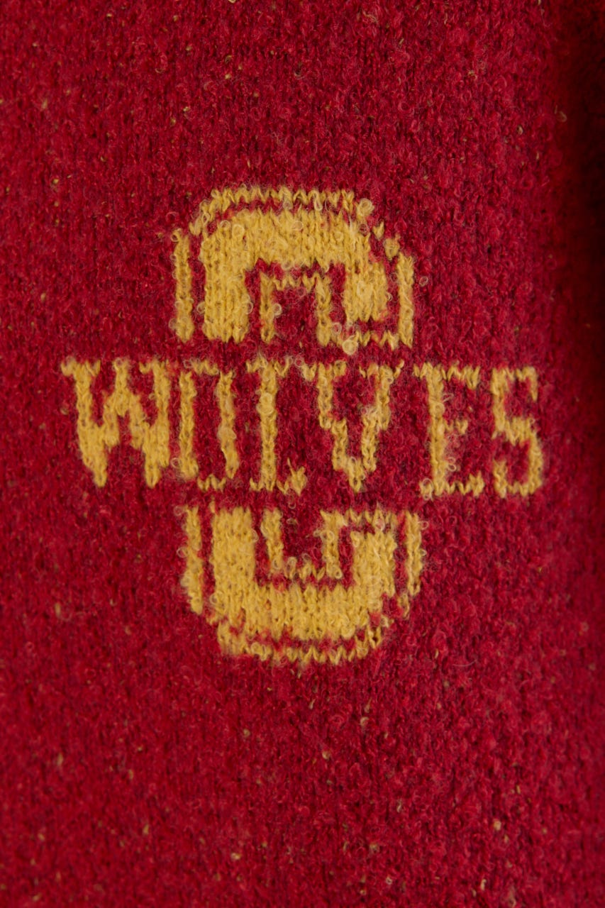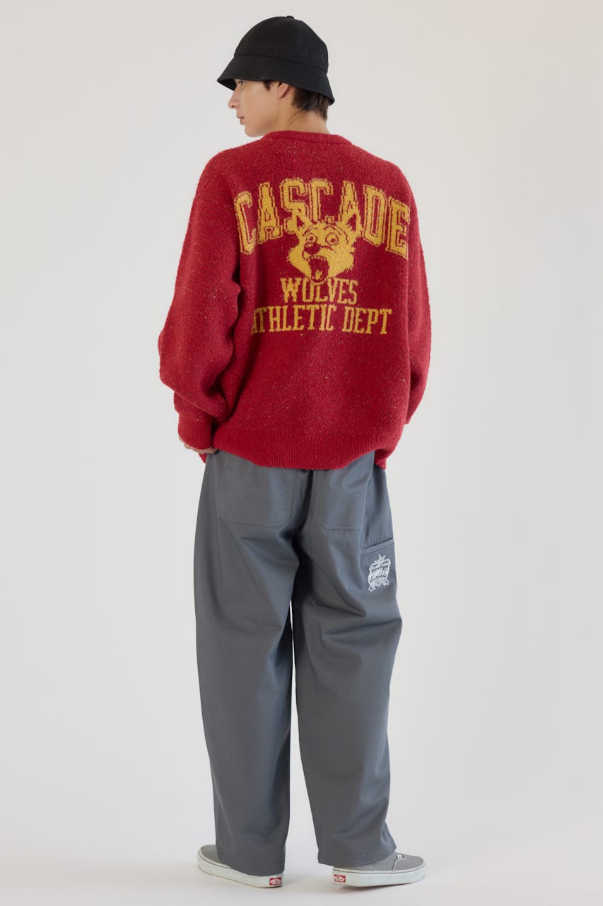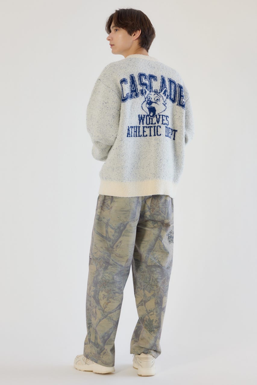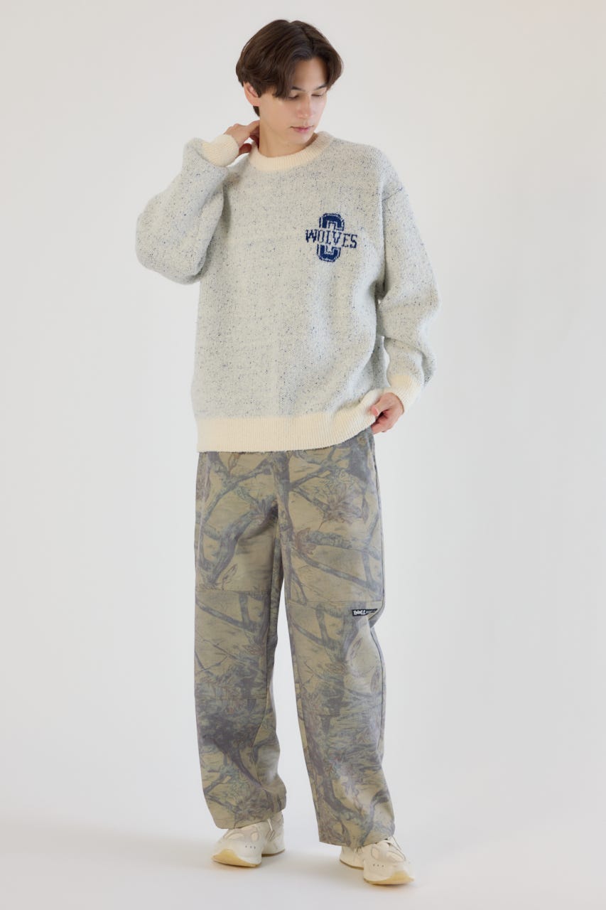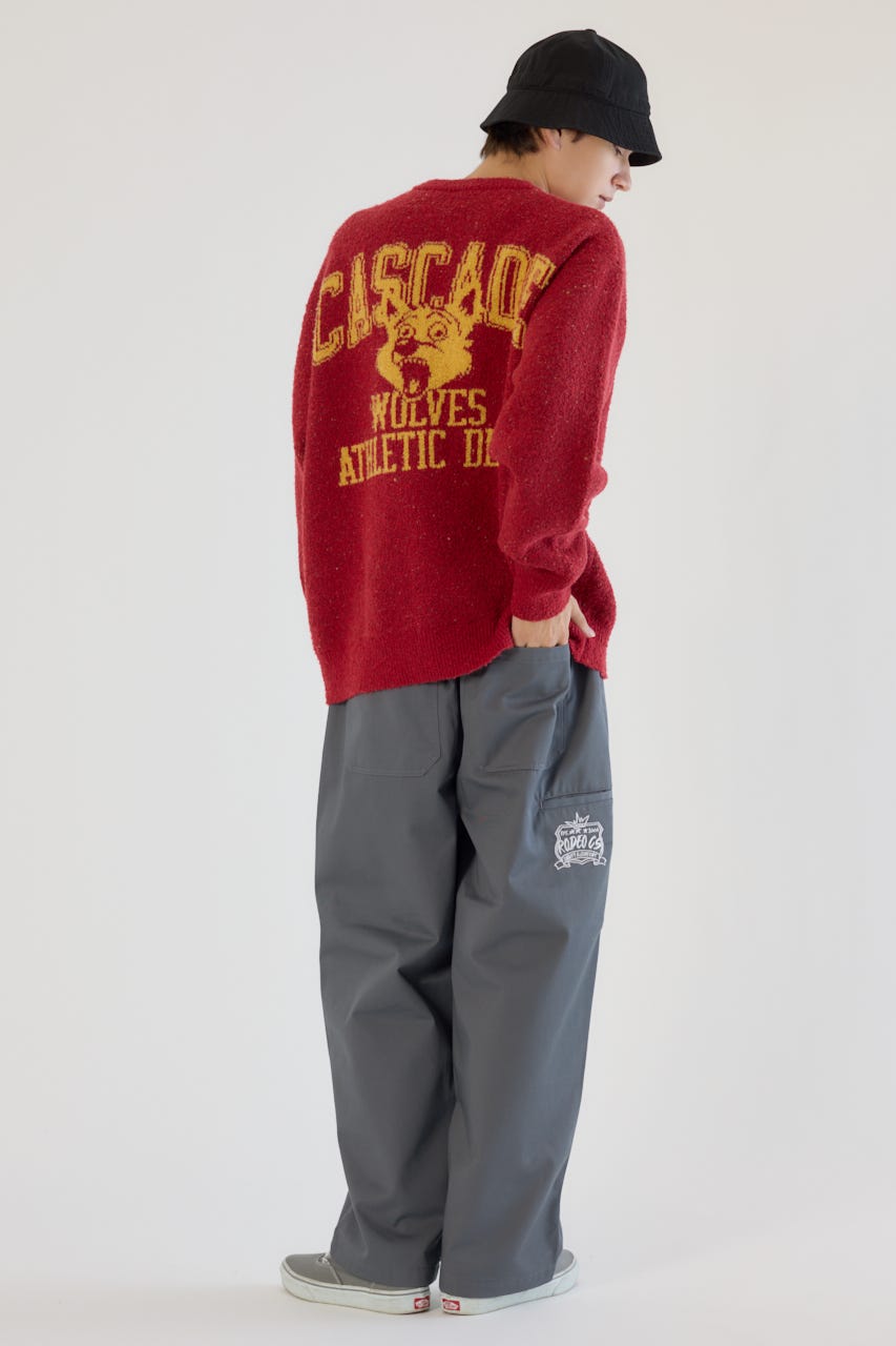 カレッジ調のキャラクターグラフィックをニットで表現した1枚。