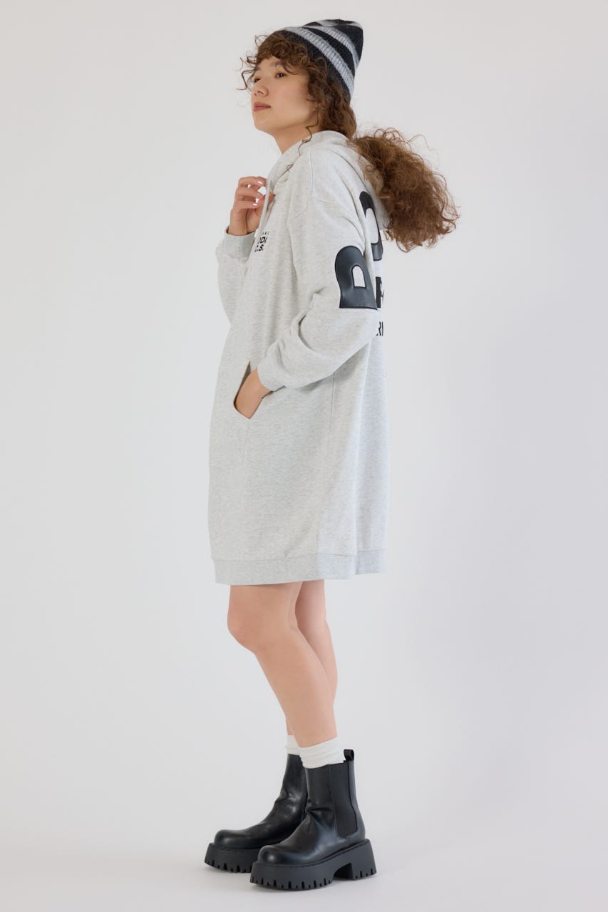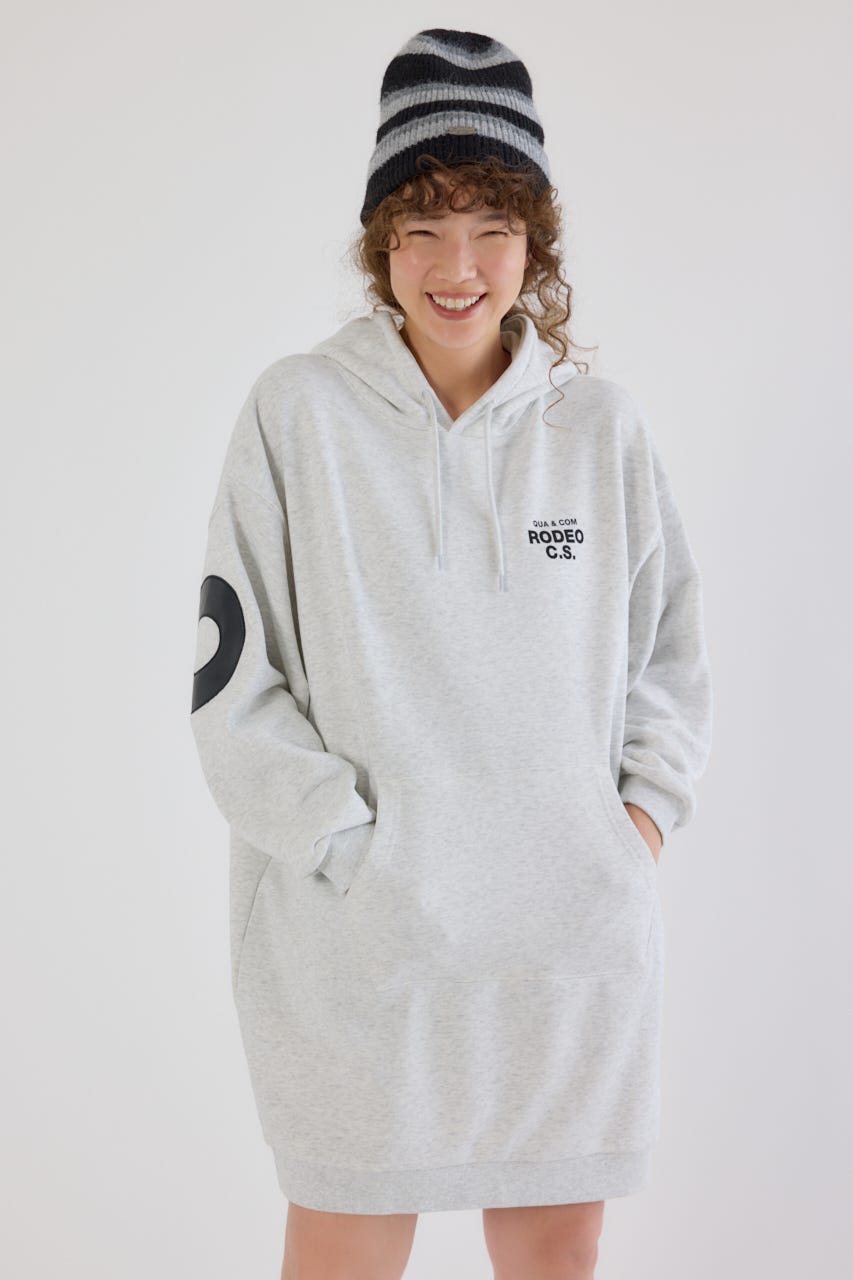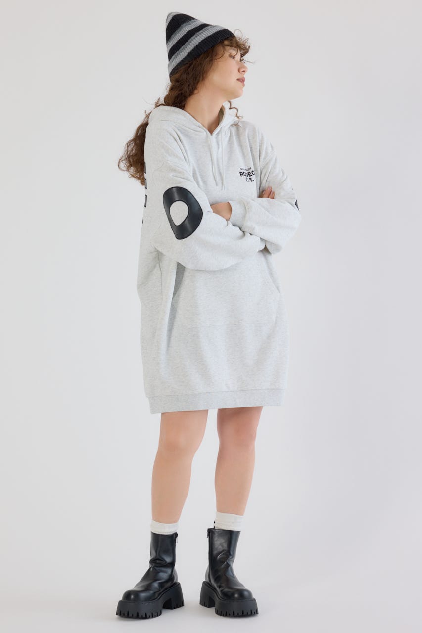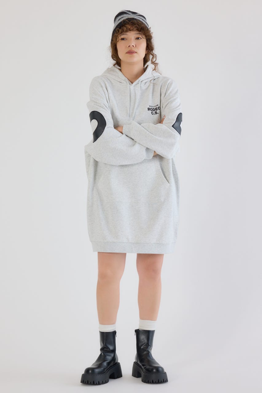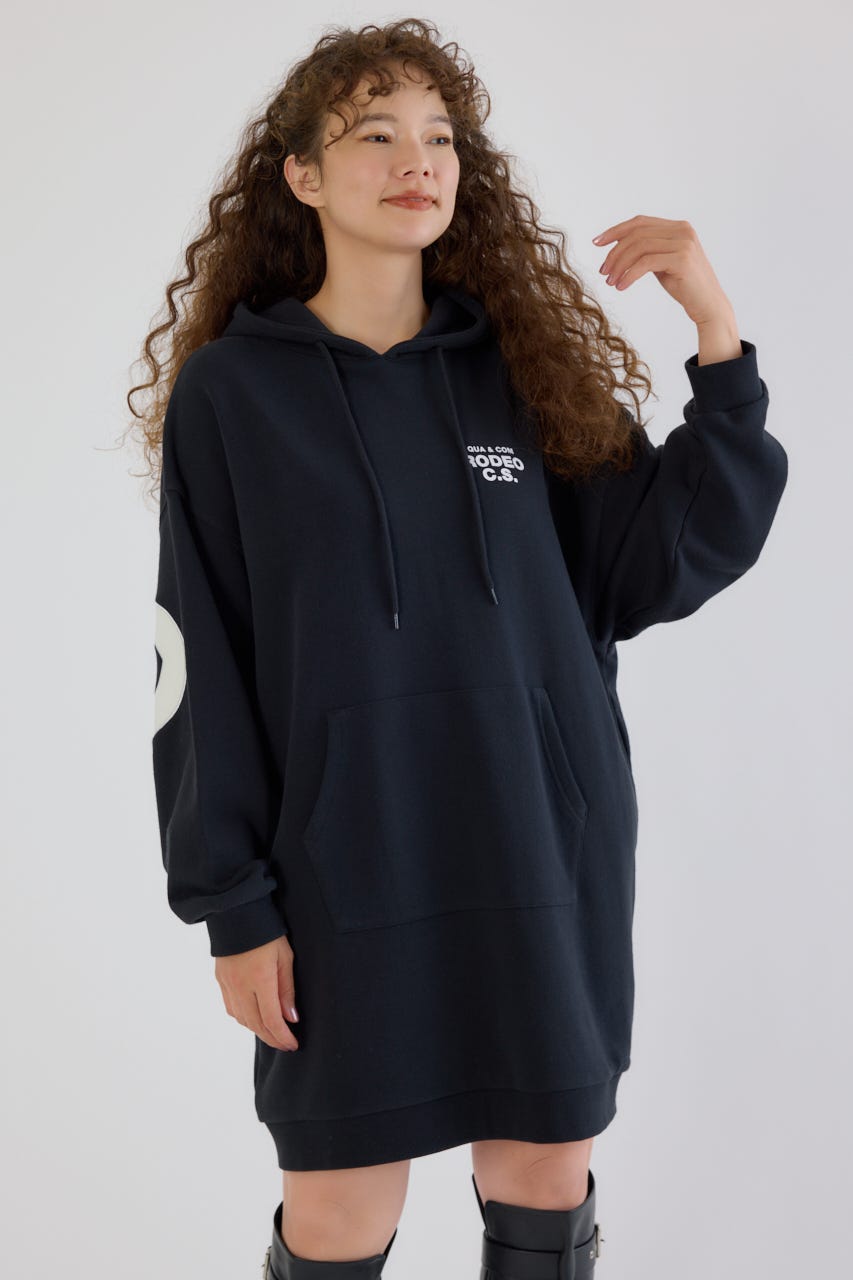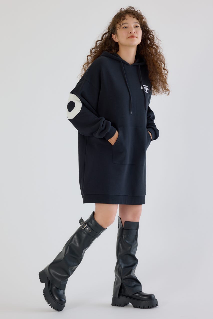 秋冬にぴったりなレザーアップリケがトレンド感があり、かっこいいパーカーワンピースです。