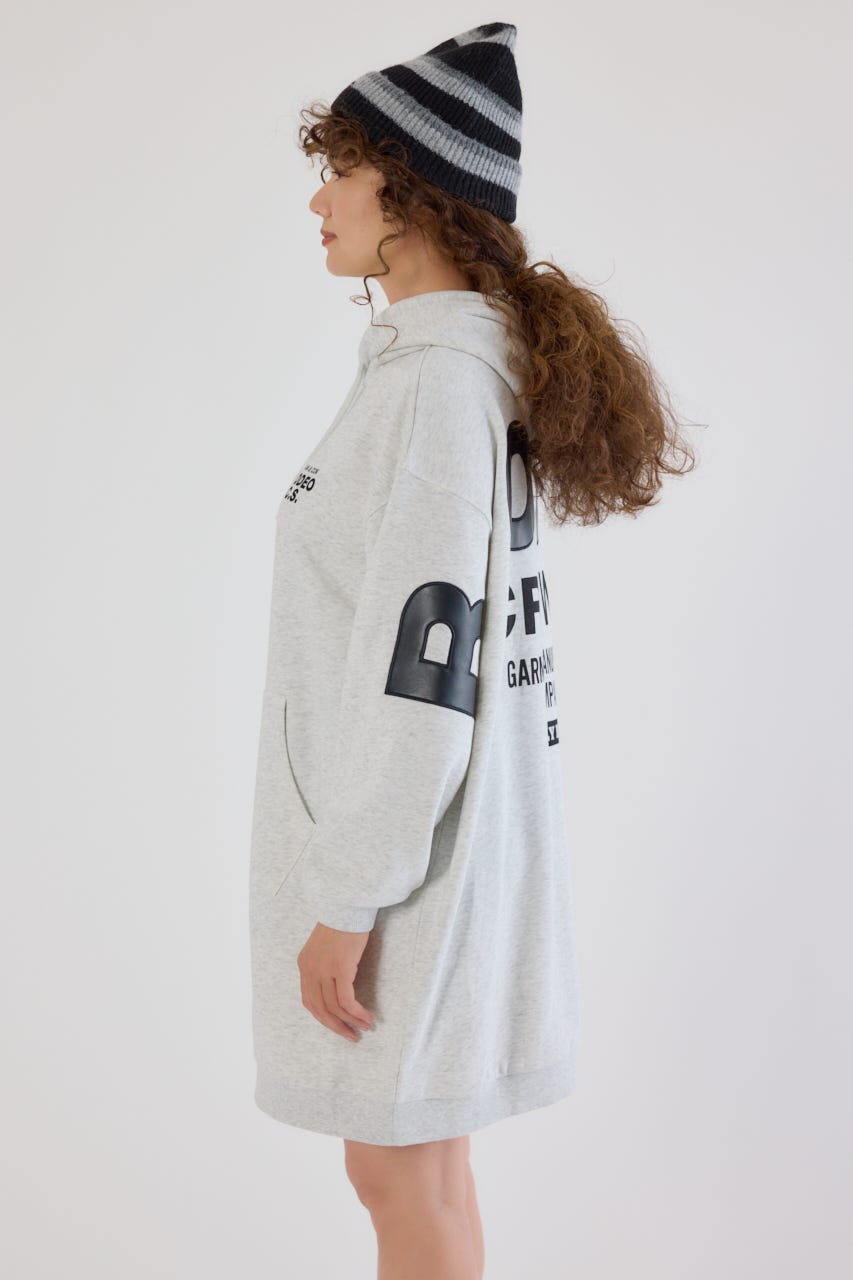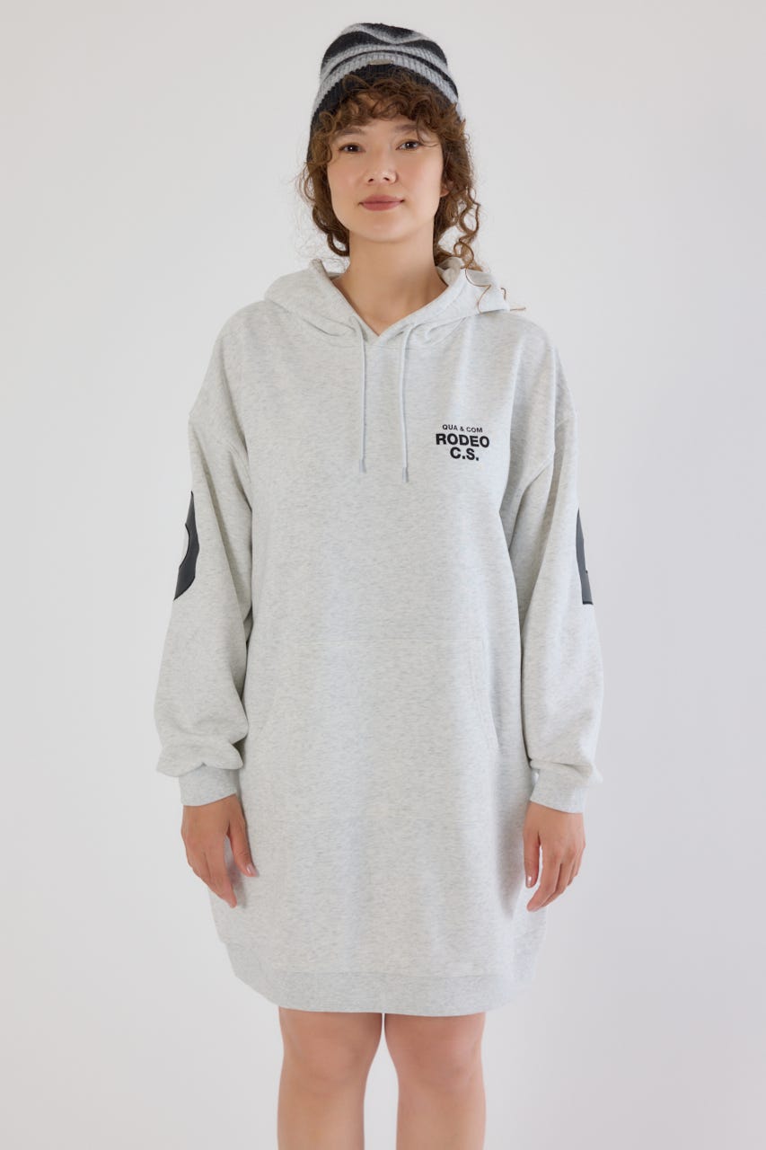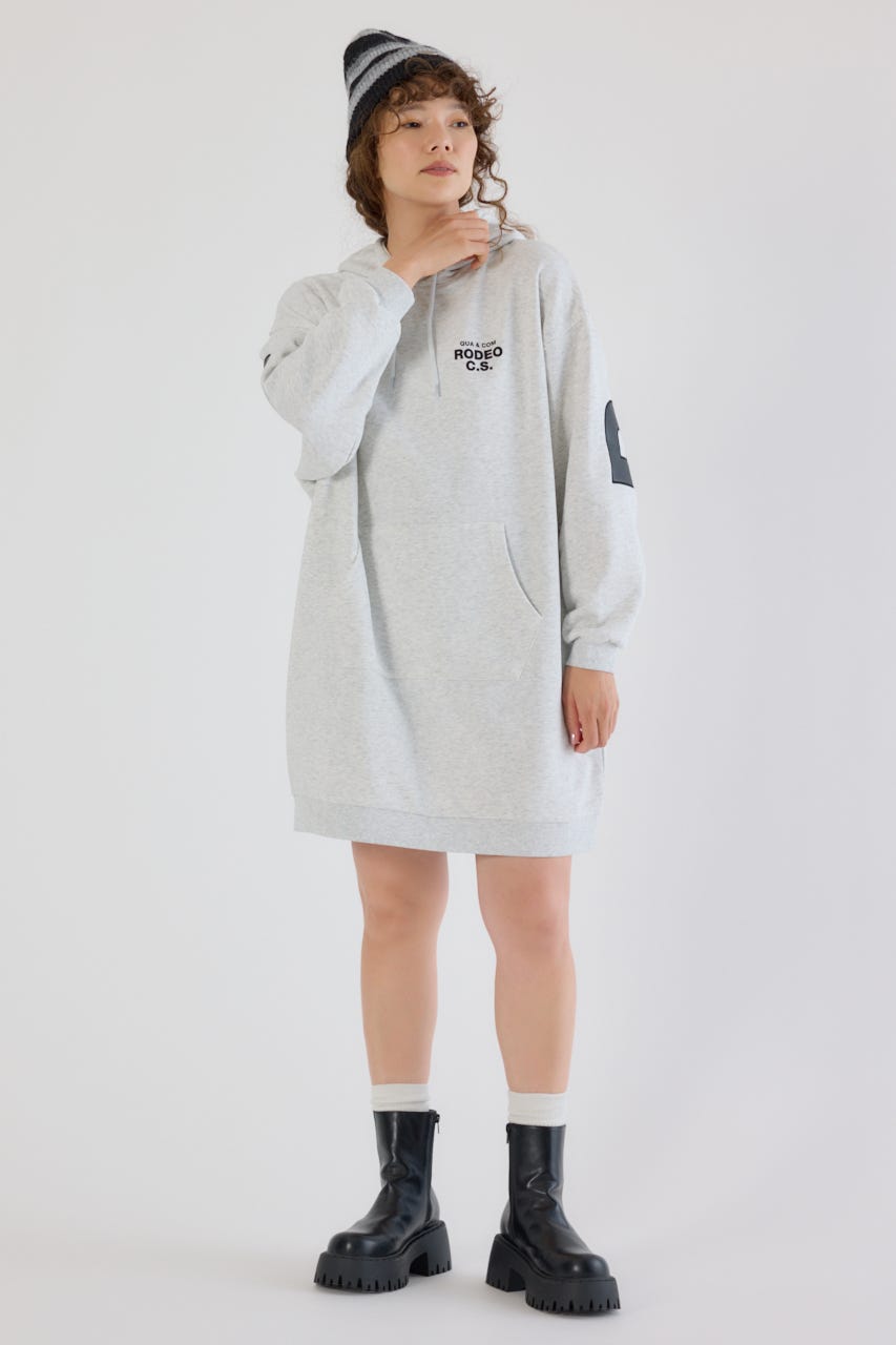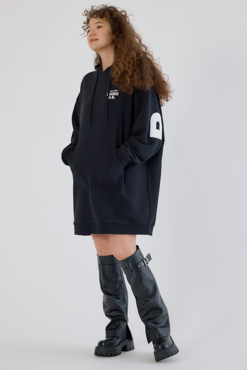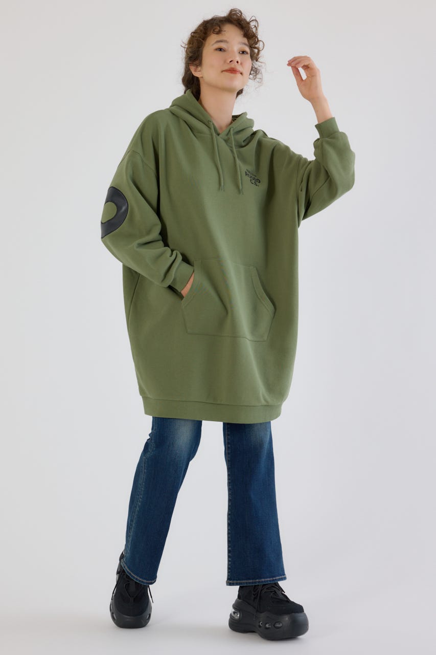 秋冬にぴったりなレザーアップリケがトレンド感があり、かっこいいパーカーワンピースです。