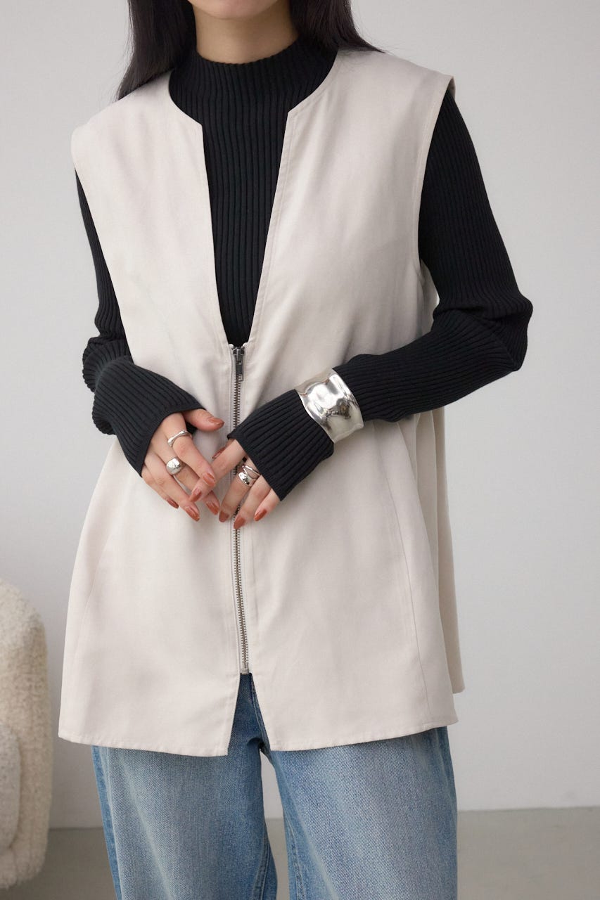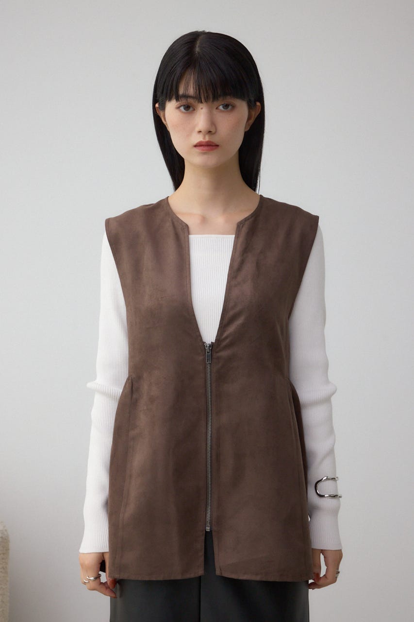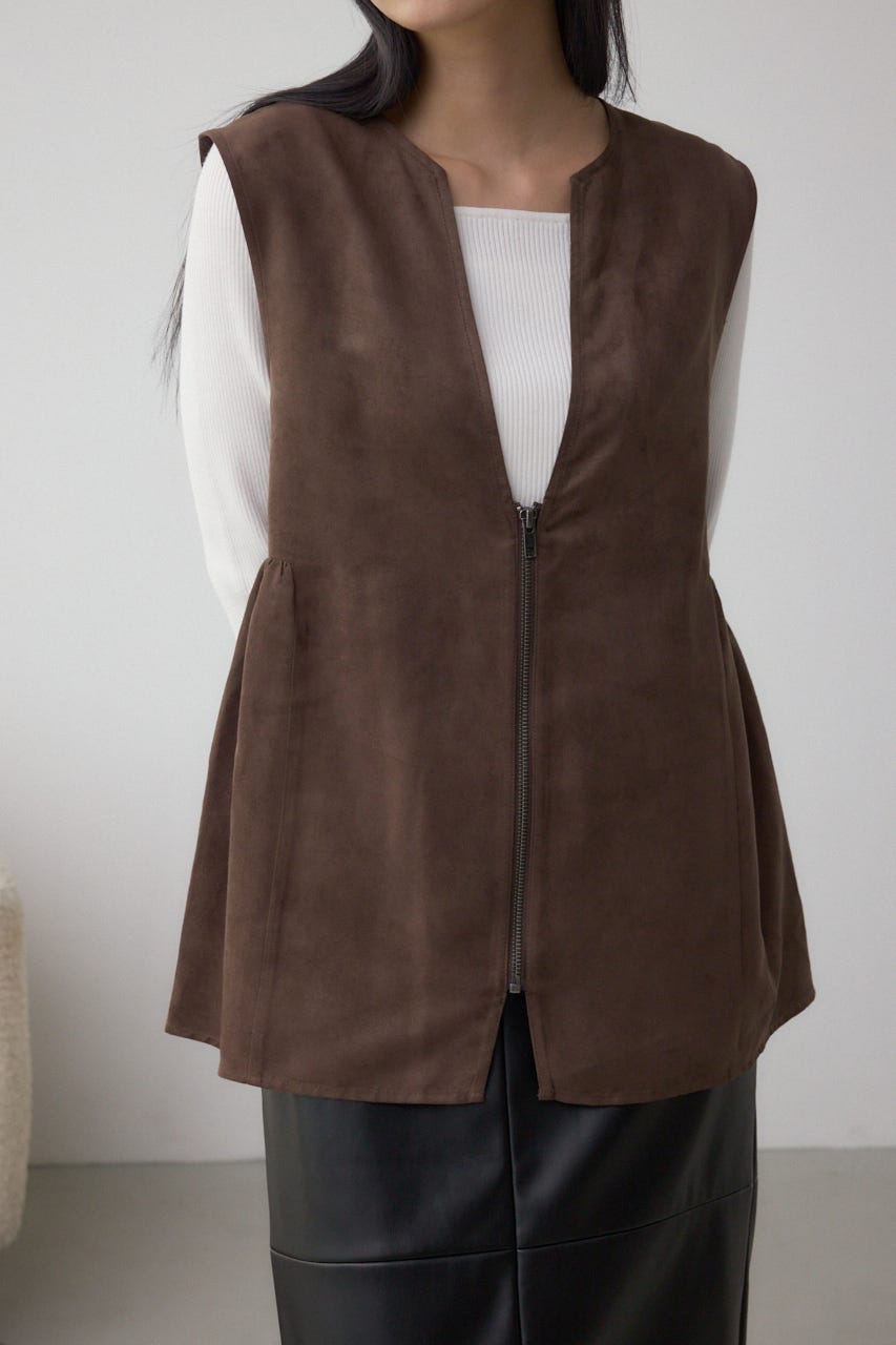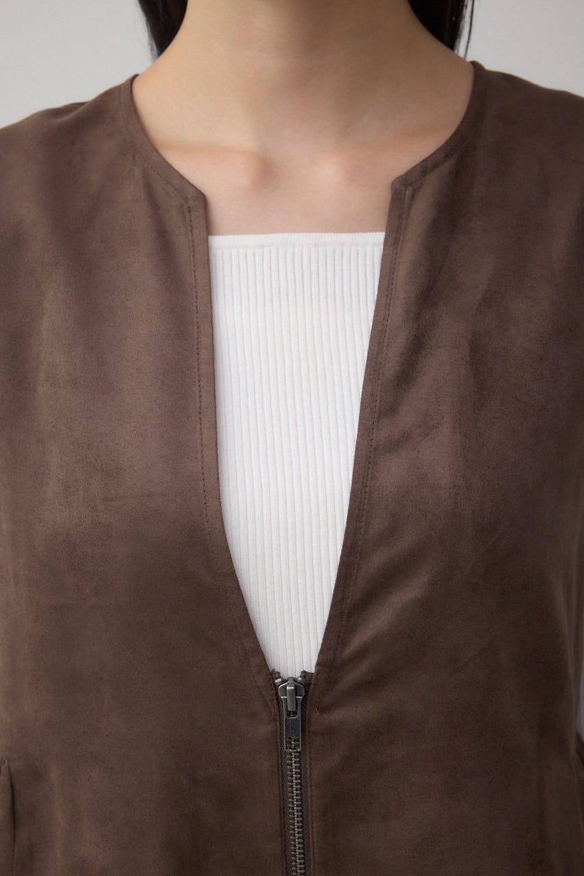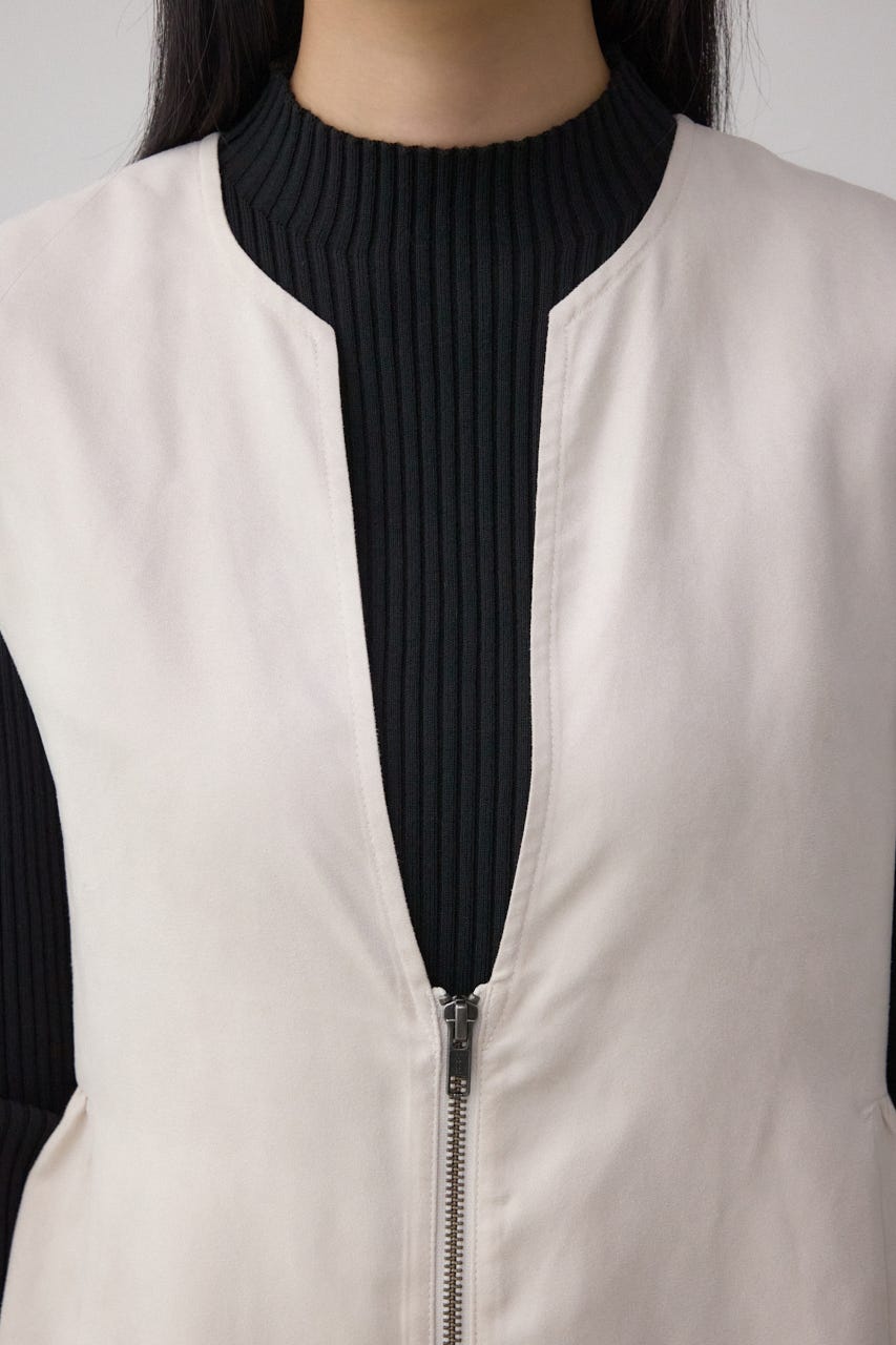 上品なスエード調素材を使用した、シンプルでありながら存在感のあるジップベスト。