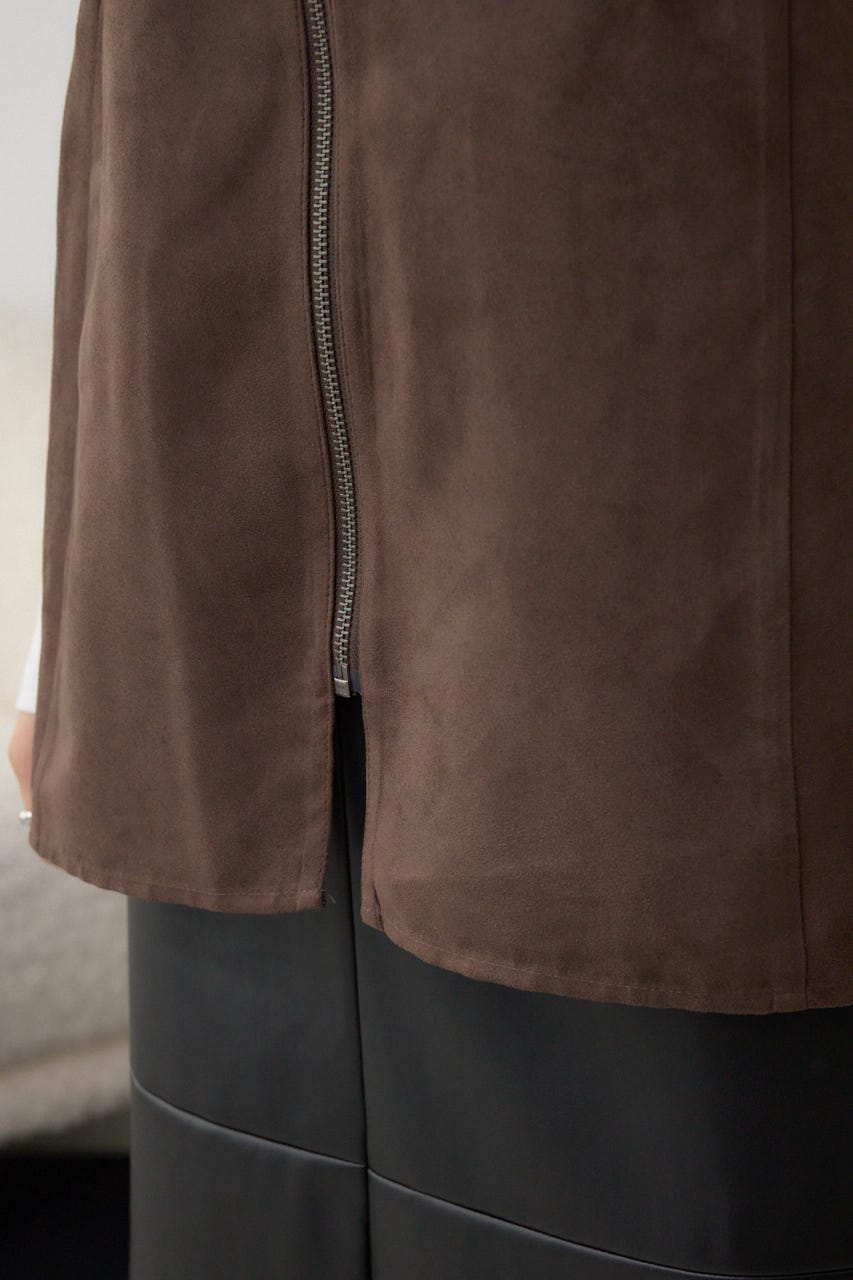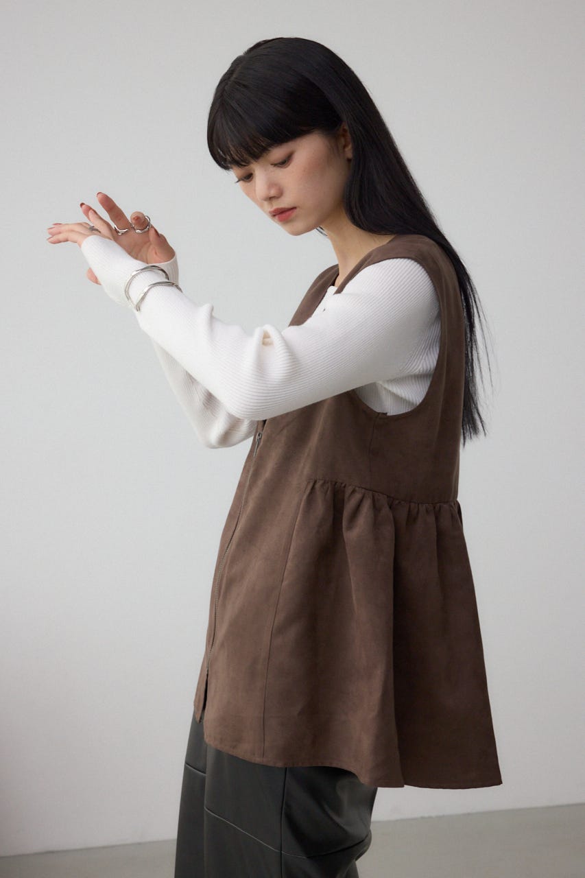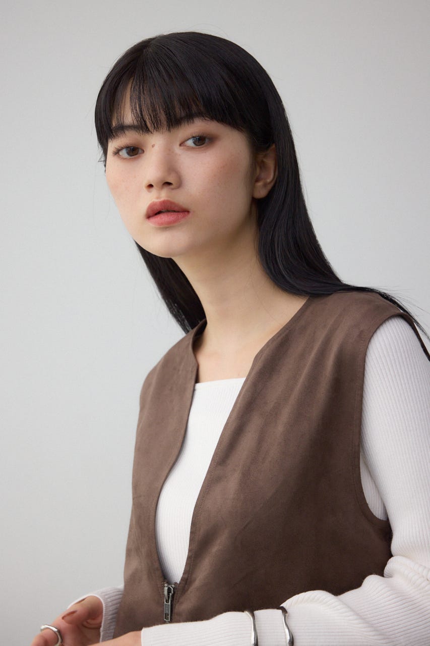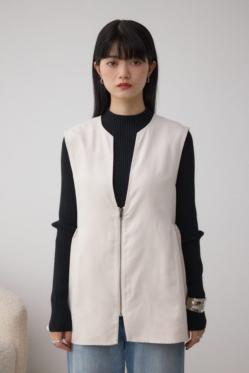 上品なスエード調素材を使用した、シンプルでありながら存在感のあるジップベスト。