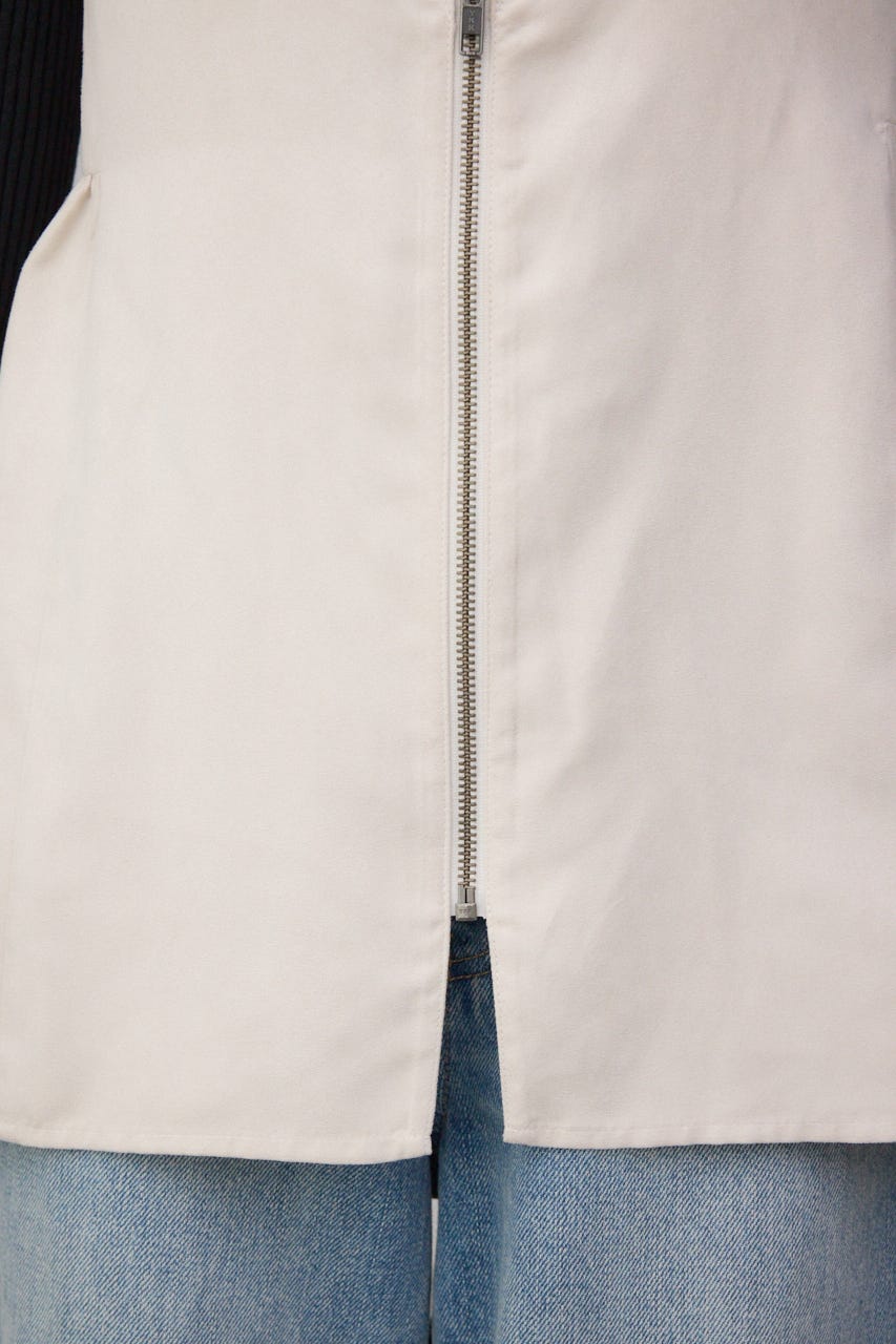 フロントは深めのVネックにシルバーのジップがアクセント。