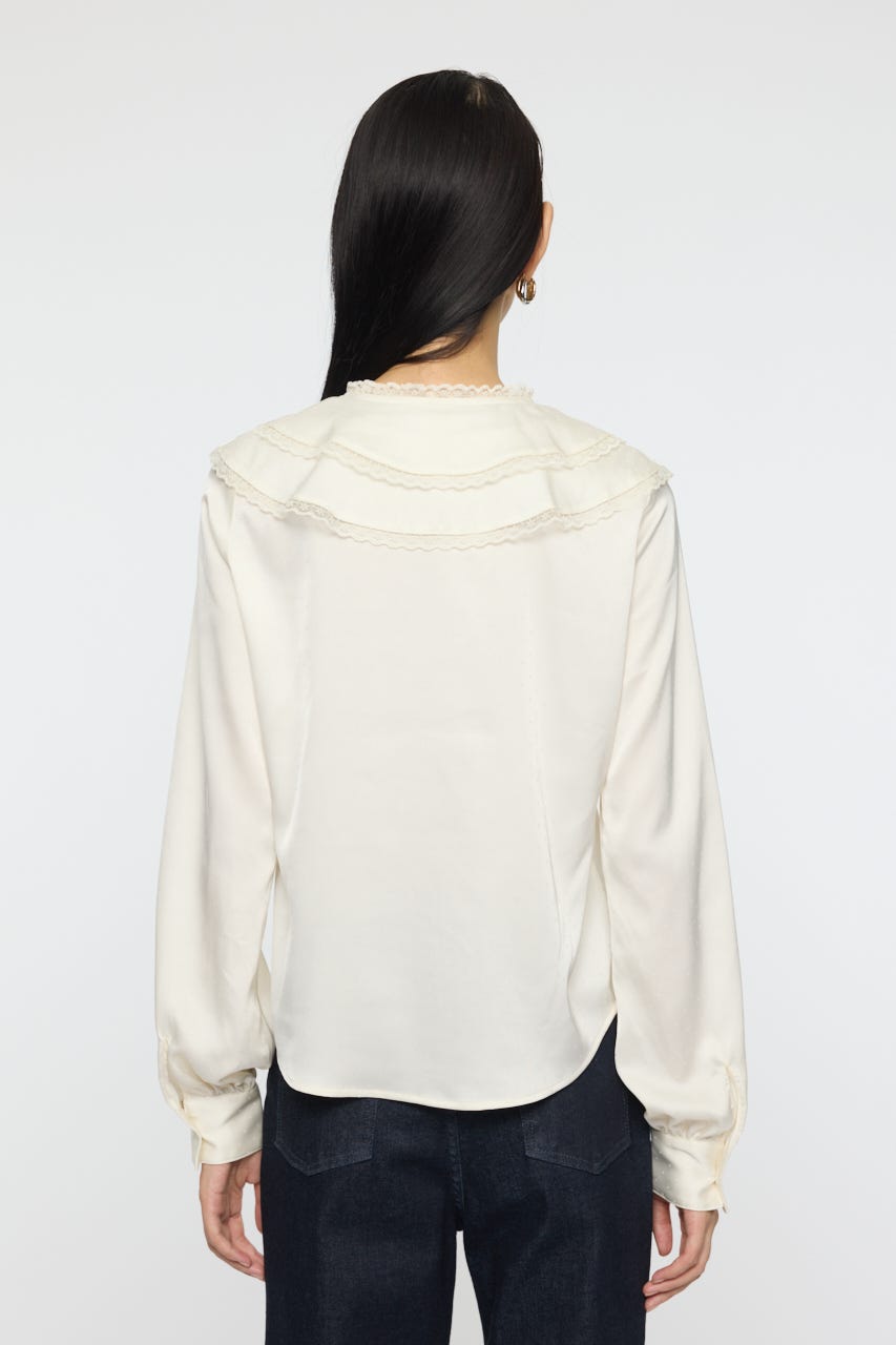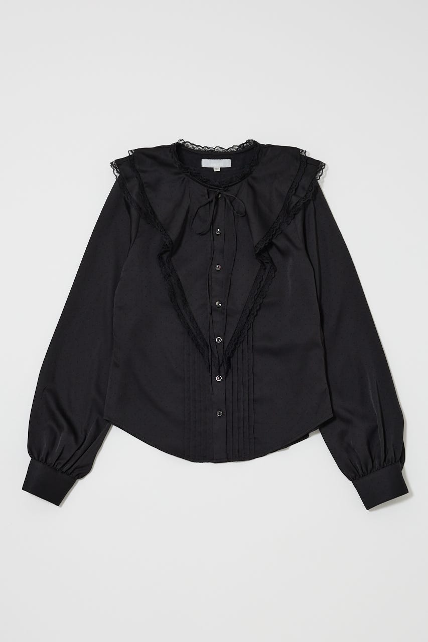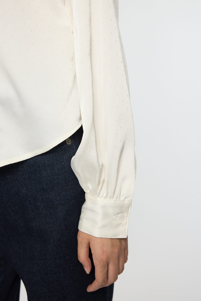 上品な光沢感をもつドビードット柄サテンに、フェミニンなレーステープをあしらった新作ブラウス。