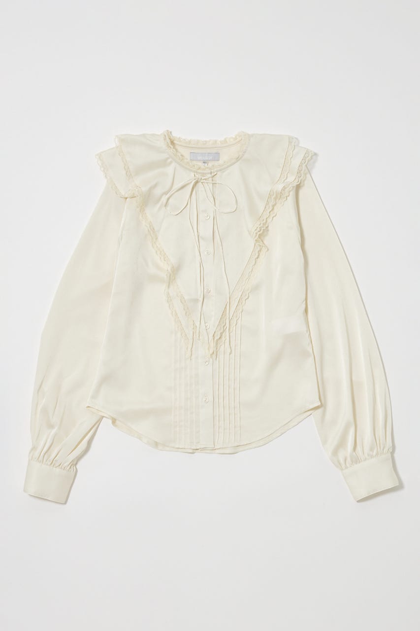 フロントから肩、バックヨークまでぐるりとレーステープを施し、顔まわりが華やかな印象に。