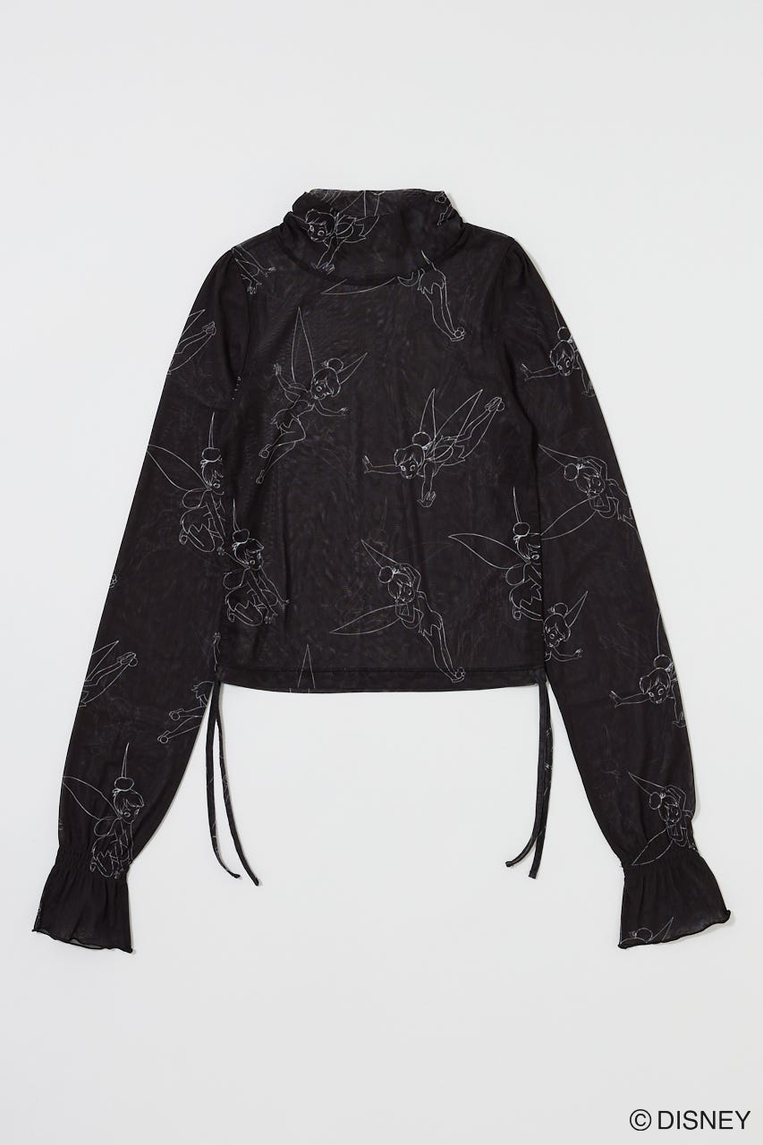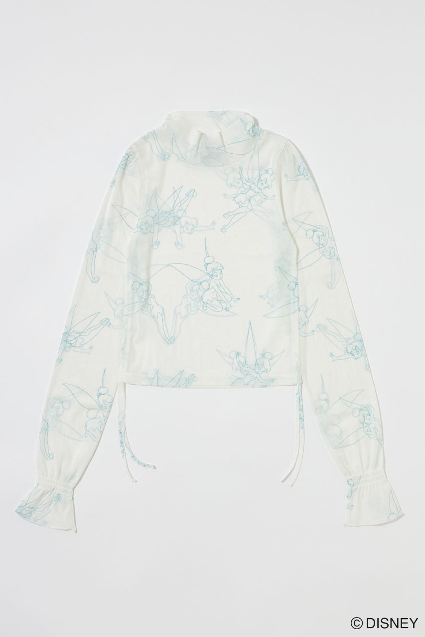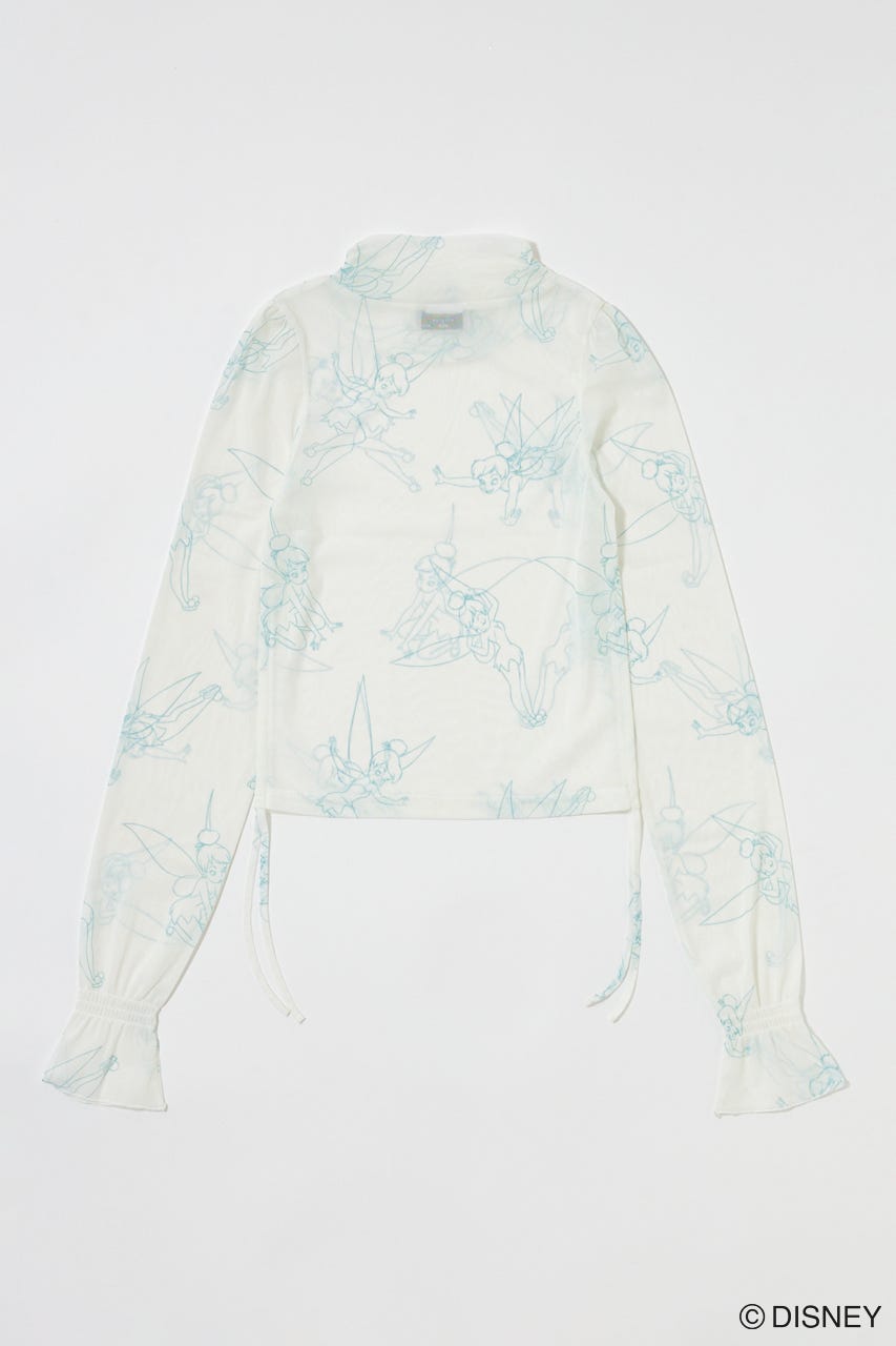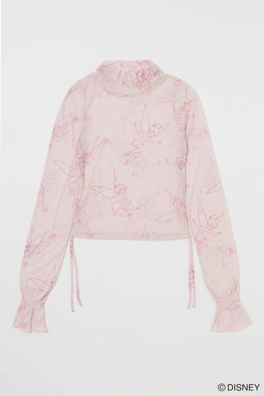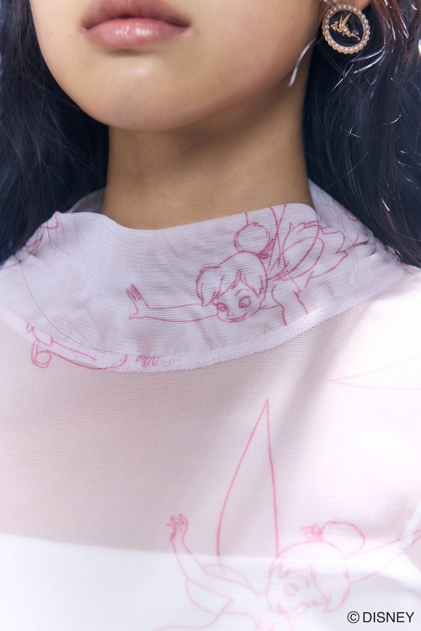 キャンディースリーブのシアートップスに様々な表情やポーズのティンカーベルを散りばめたオリジナルの総柄を作成しキャラクターの魅力を引き出しています。